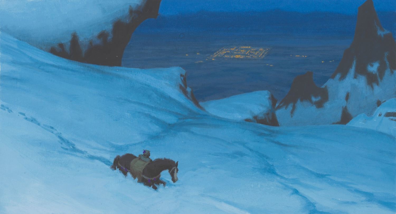 (Disney, 1998) A background color key concept painting from “Mulan” by Hans Bacher. Labeled for scene 20, this early hand-painted concept explores a color palette option for Mulan overlooking the Imperial City. Accomplished in gouache on illustration board and measuring 8” x 12.5”, the painting is in very good condition with minor edge wear and tape residue from production use.