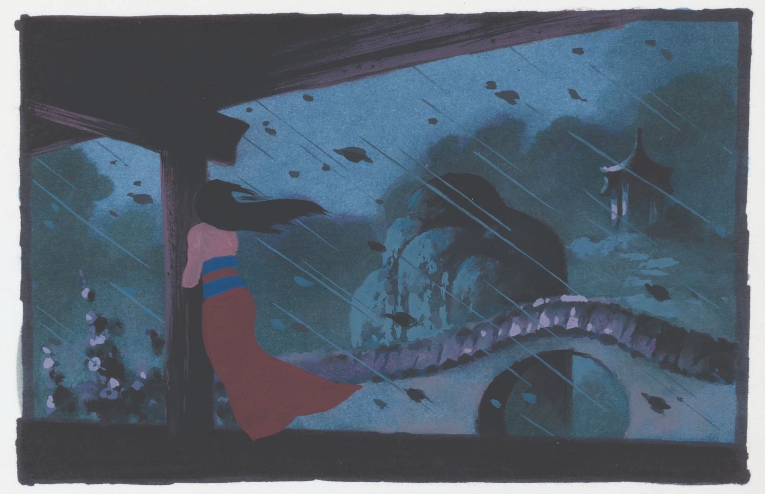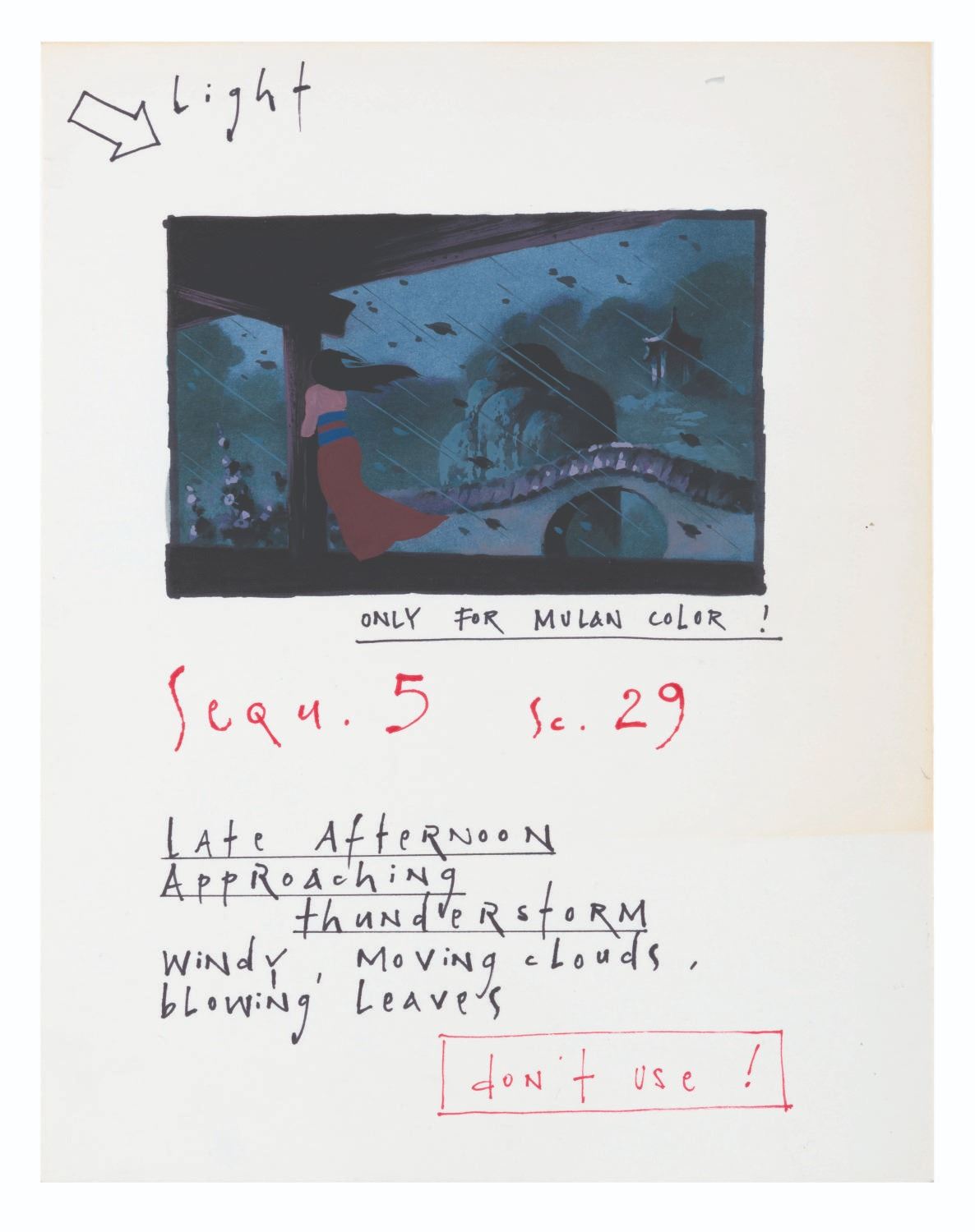 (Disney, 1998) A gorgeous background color key concept painting for the animated"Mulan." This hand-painted concept explores a color palette option for the storm scene, where Mulan decides to take her father's place in the army. Accomplished in gouache, the painting measures 3.75" x 5.75" on 8.5" x 11" mounted cardstock and is in very good condition with typical production notes, light scratches, discoloration to the paper, a slight crease at the bottom right, and wear from production use.