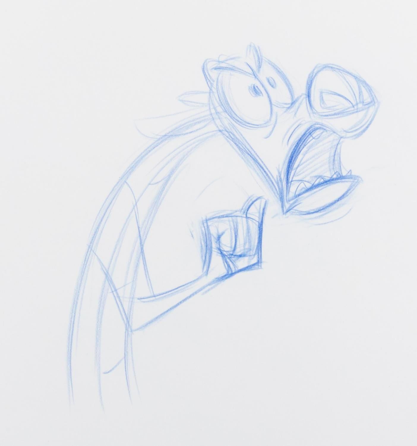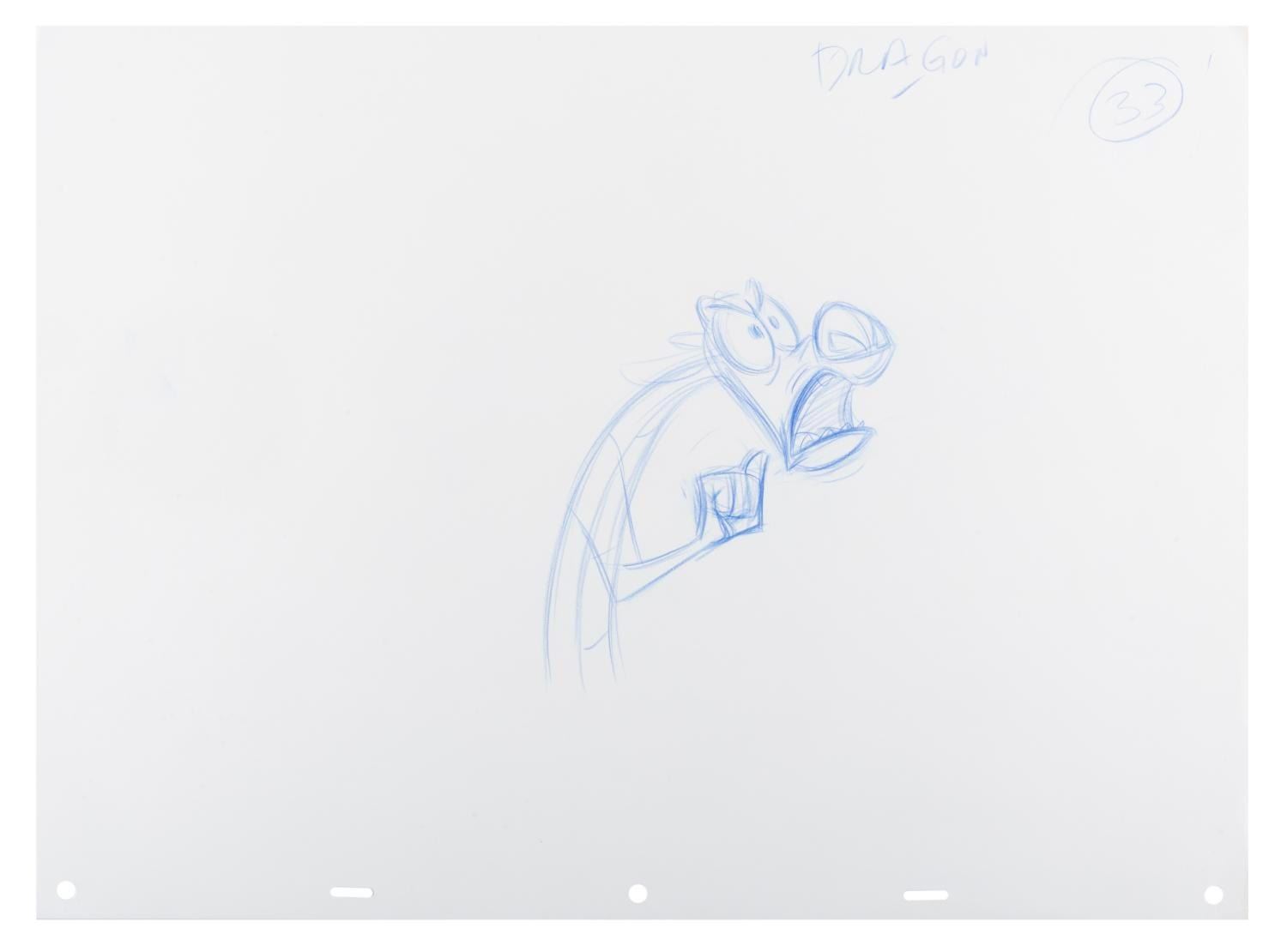 (Disney, 1998) An original production drawing of the Fa family guardian Mushu from “Mulan.” Mushu has an image size of 5” x 5.5” on 12.5” x 17” animation paper. The colored pencil drawing is in very good condition with light creasing.
