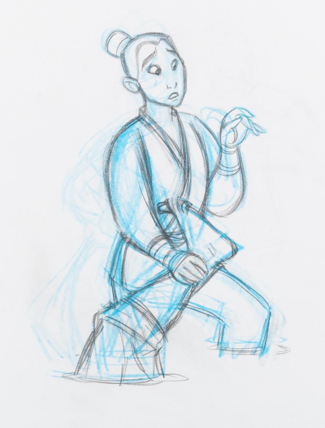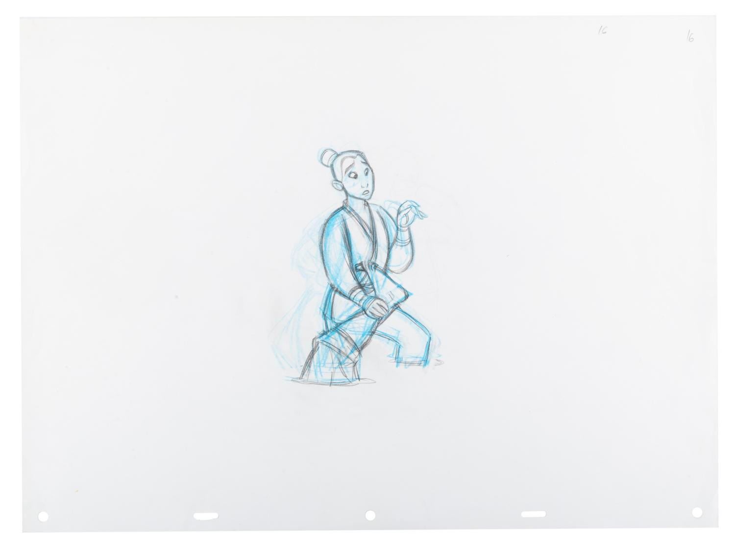 (Disney, 1998) An original production drawing of Mulan disguised as Ping from “Mulan.” Mulan has an image size of 4.25” x 6” on 12.5” x 17” animation paper. The pencil drawing is in very good condition with moderate creasing and faint transfer of image from another drawing on the reverse.