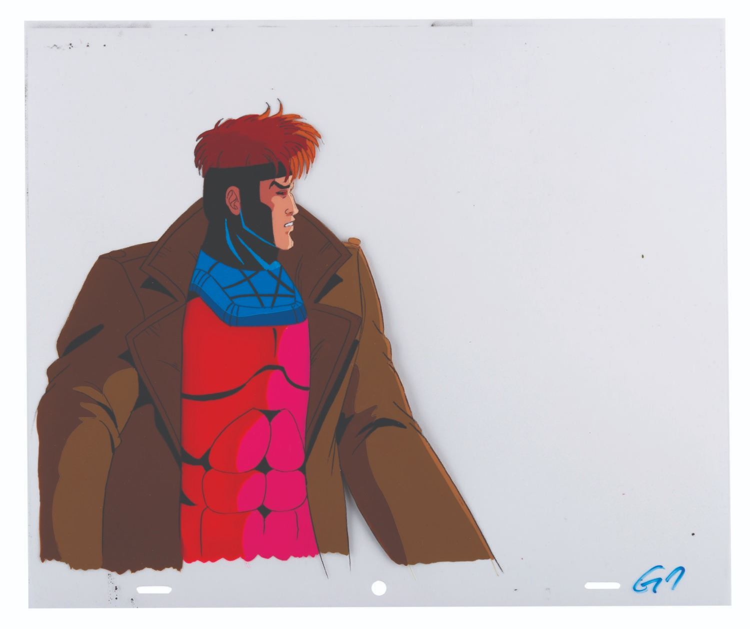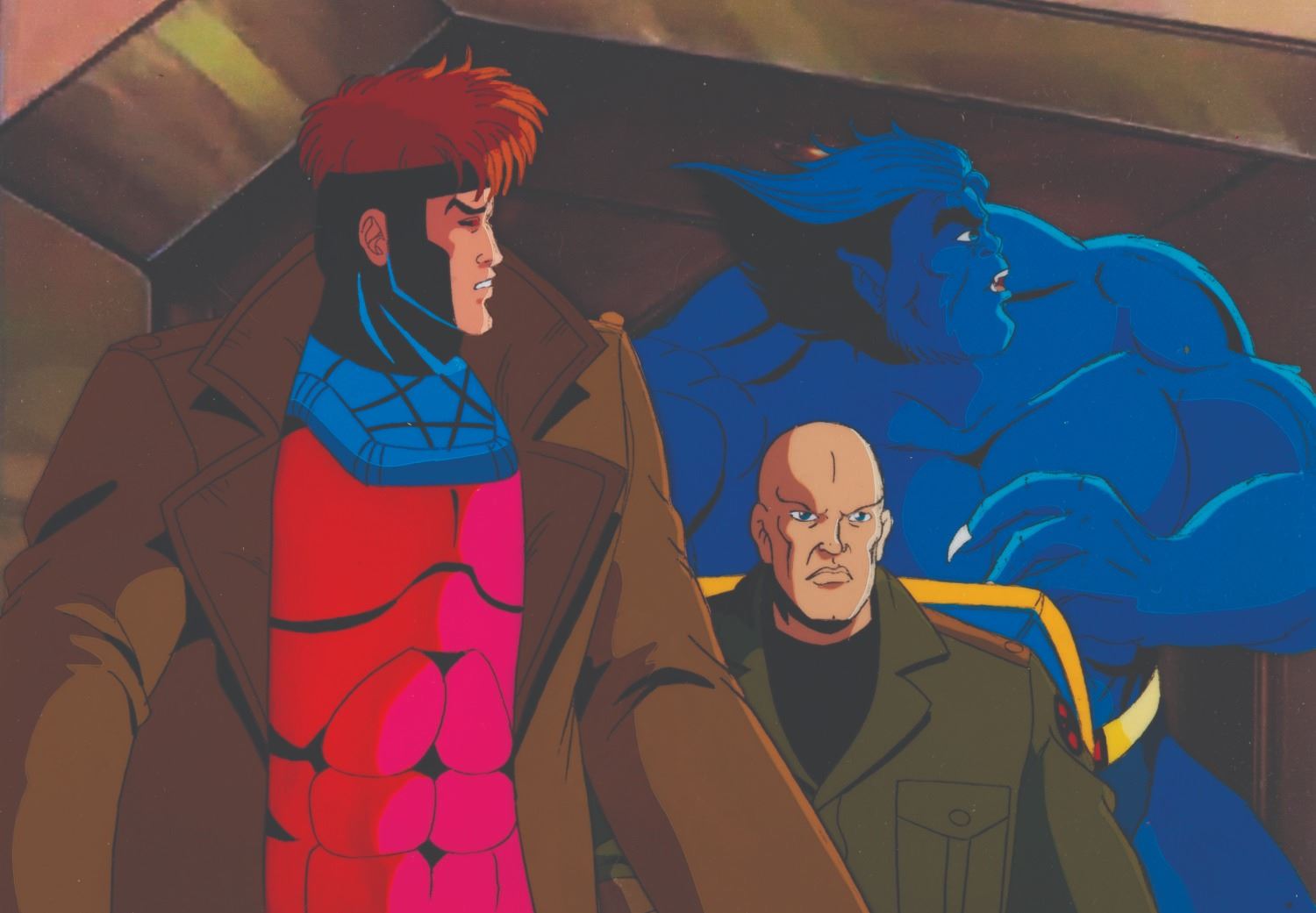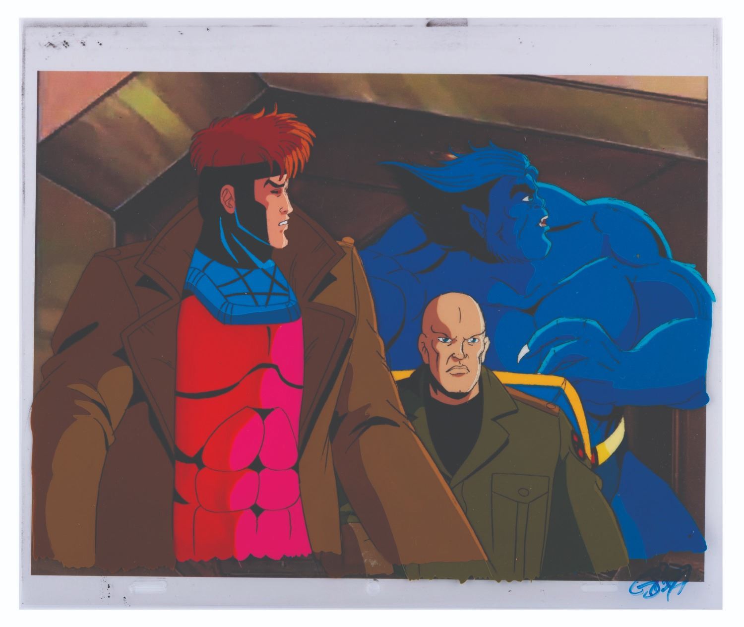 (Fox, 1995) An original multi-layer production cel from “X-Men: The Animated Series” of Beast, Professor X, and Gambit from the season four episode “Sanctuary Part II” with a color copy background. Measuring 10.5” x 12.5” with a character image size of 8.5” x 12.5”, the cel is in fine condition.