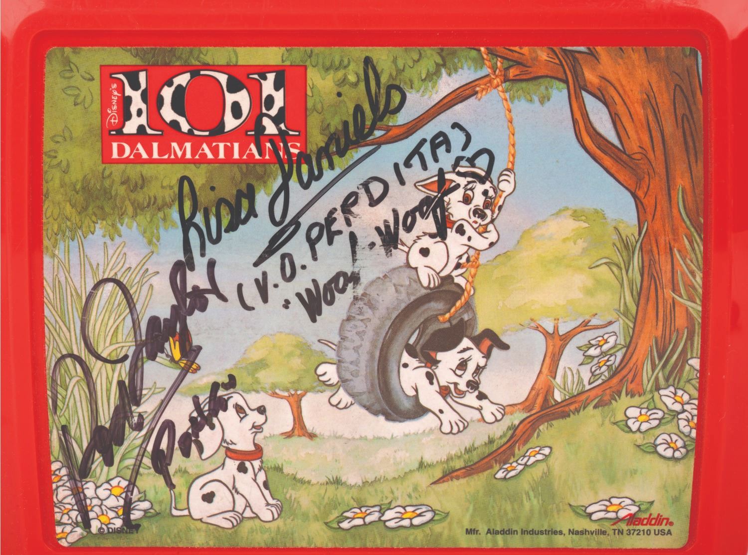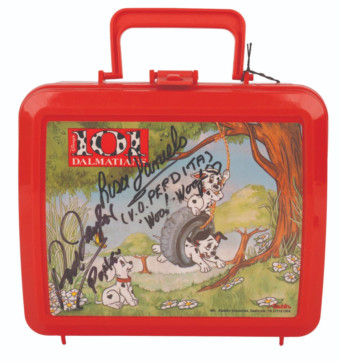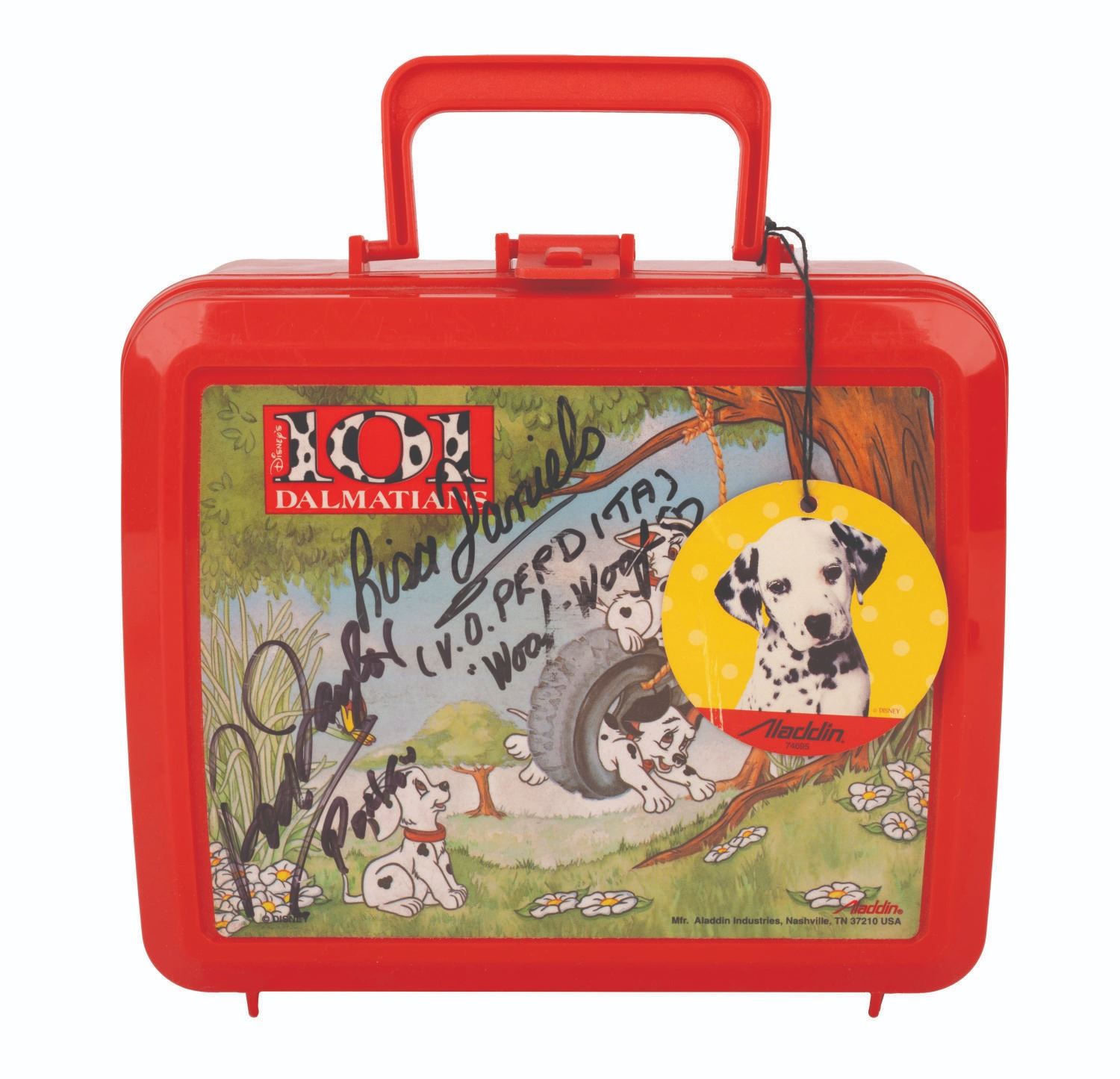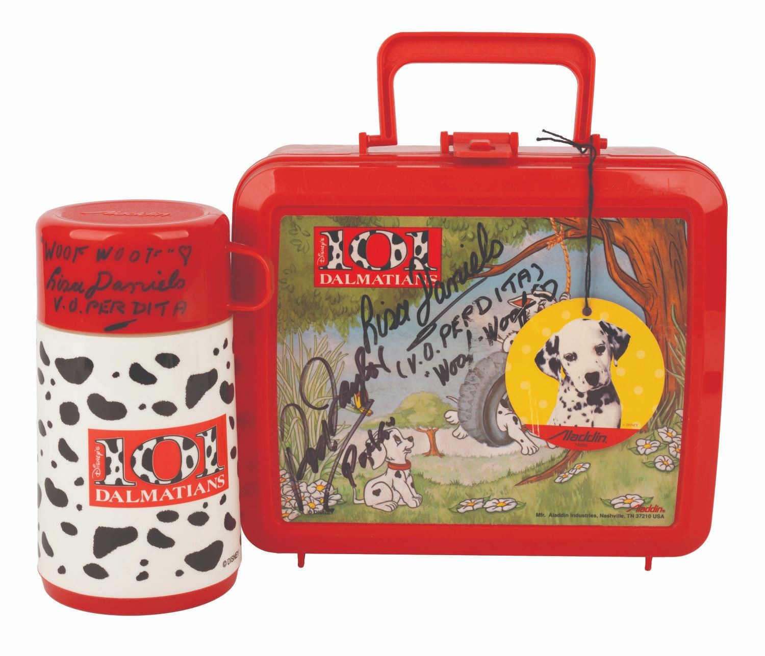 (Aladdin, 1996) A “101 Dalmatians” lunchbox and thermos, signed by Perdita and Pongo voice actors, Lisa Daniels and Rod Taylor. Daniels was the original voice actress for Perdita but bowed out during production, with the character’s remaining lines completed by actress Cate Bauer. The original tag, themed to the live-action "101 Dalmatians" film starring Glenn Close, is still attached. The lunchbox measures 8.5” x 4.25” x 7.5” tall and the thermos 6.5” tall and 3.5” in diameter, both in good condition with scratches, scuffs, and loss on the signatures.