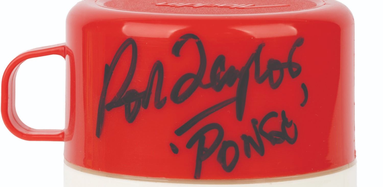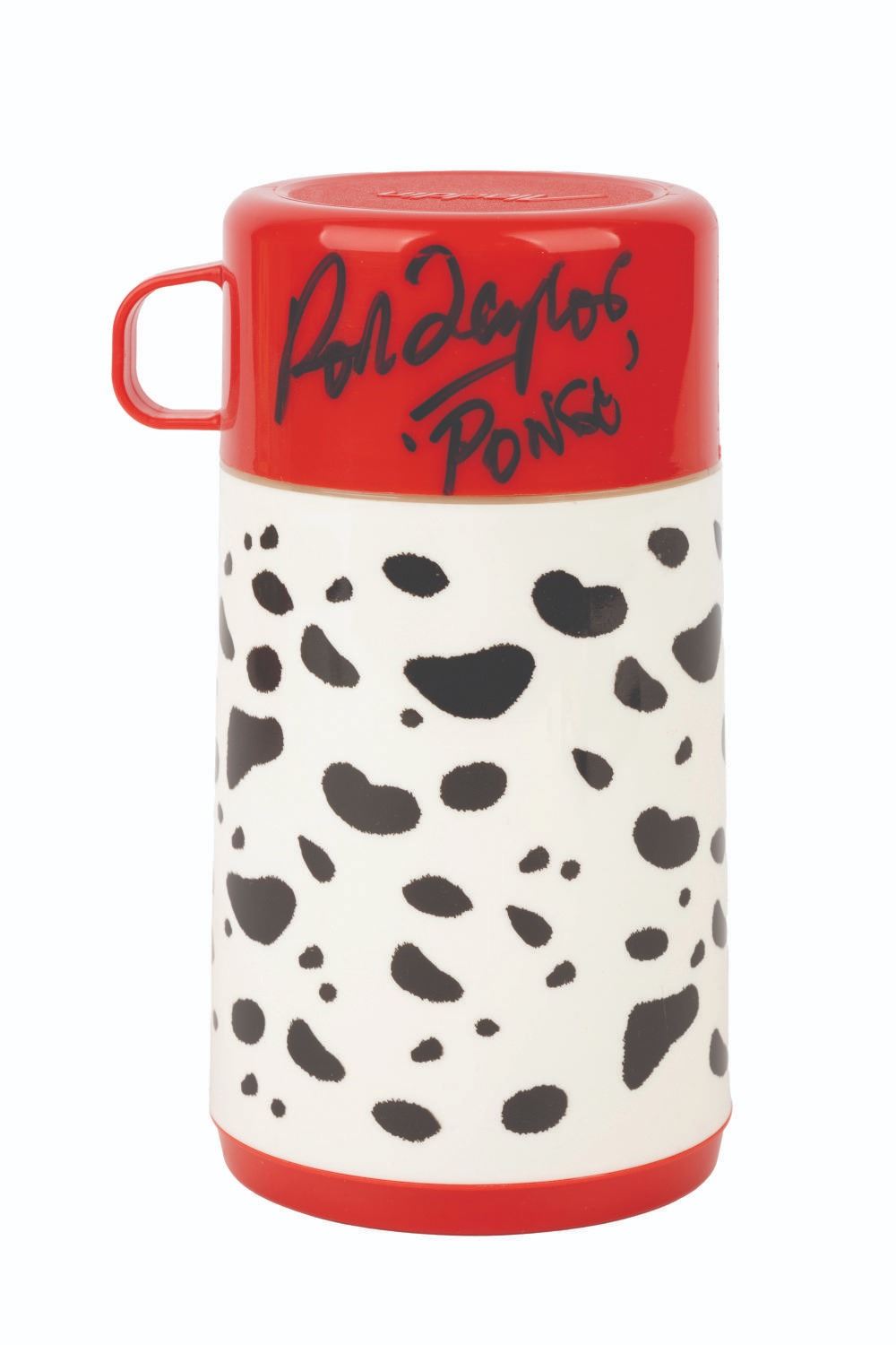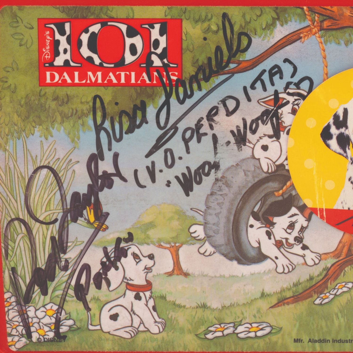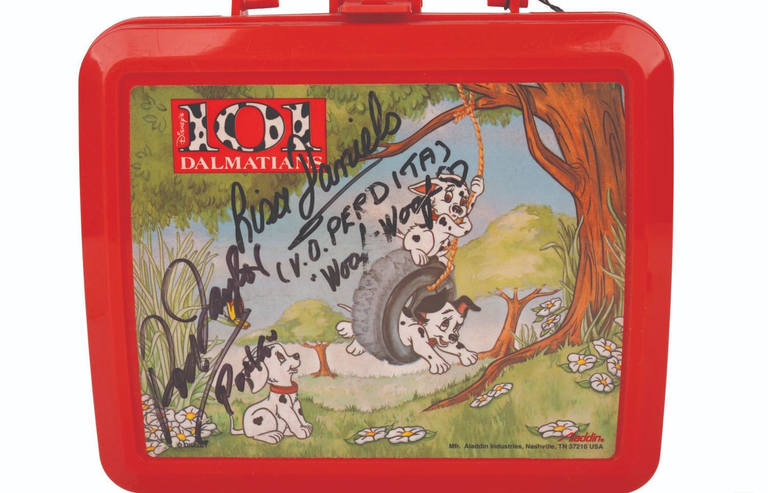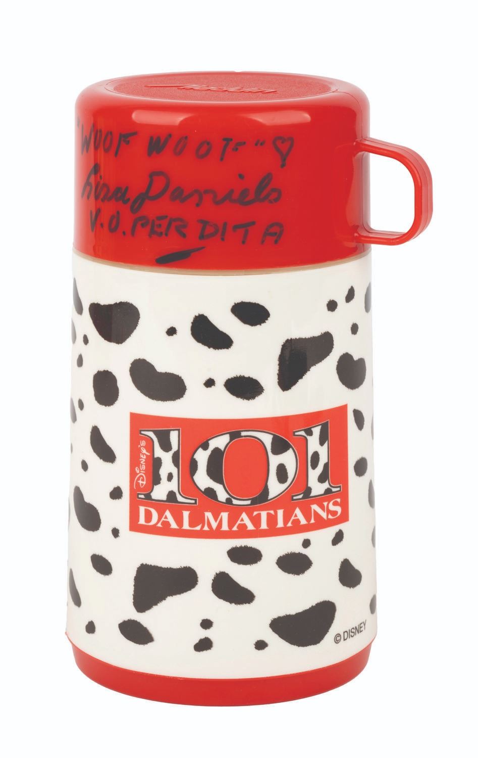 (Aladdin, 1996) A “101 Dalmatians” lunchbox and thermos, signed by Perdita and Pongo voice actors, Lisa Daniels and Rod Taylor. Daniels was the original voice actress for Perdita but bowed out during production, with the character’s remaining lines completed by actress Cate Bauer. The original tag, themed to the live-action "101 Dalmatians" film starring Glenn Close, is still attached. The lunchbox measures 8.5” x 4.25” x 7.5” tall and the thermos 6.5” tall and 3.5” in diameter, both in good condition with scratches, scuffs, and loss on the signatures.