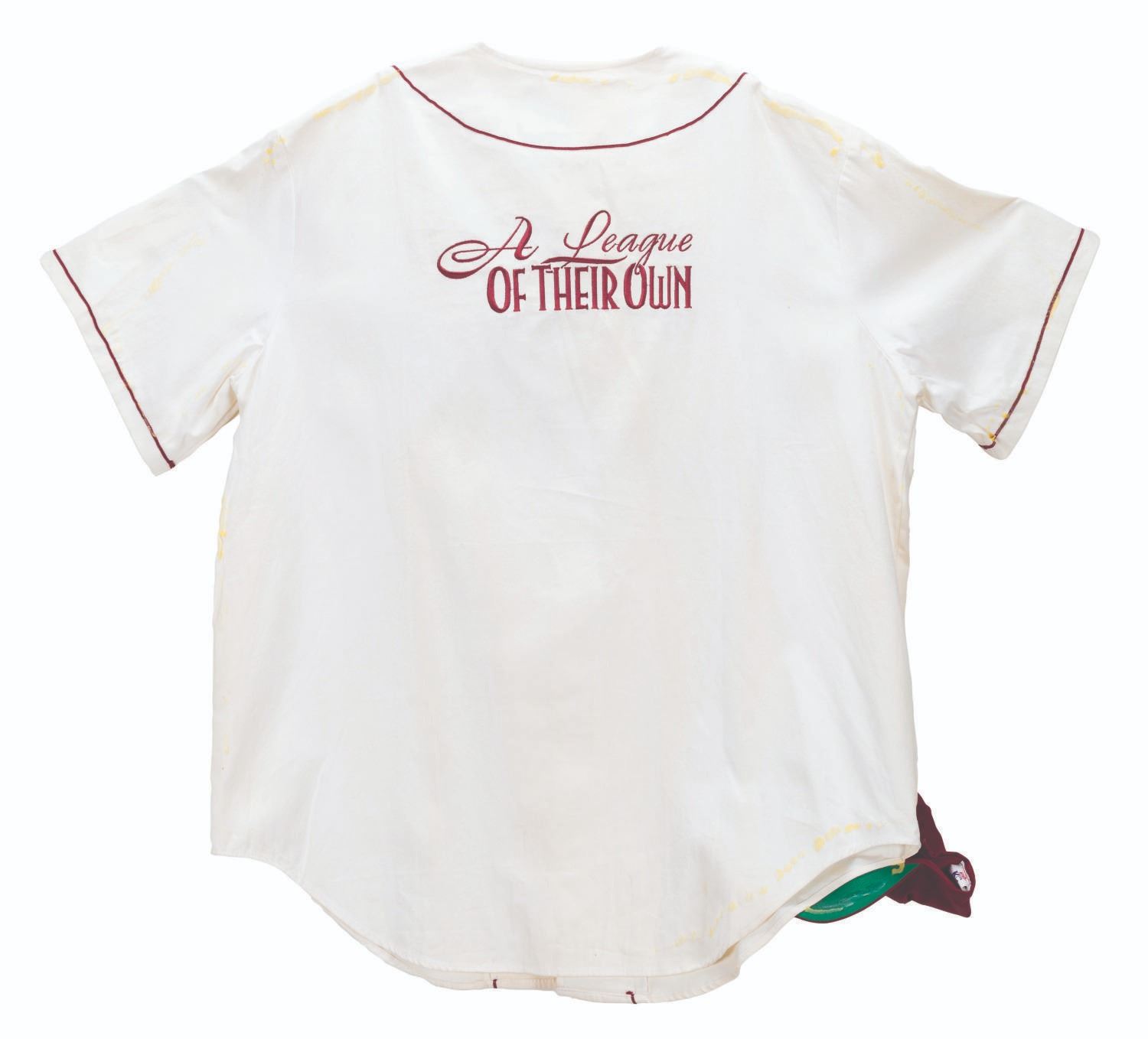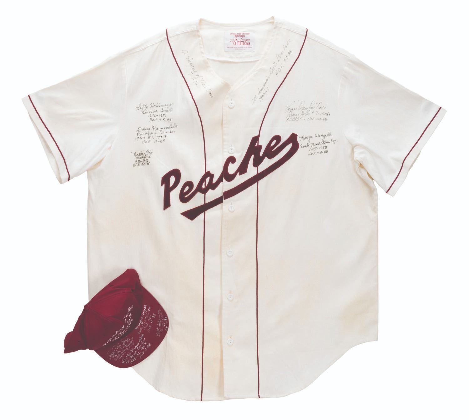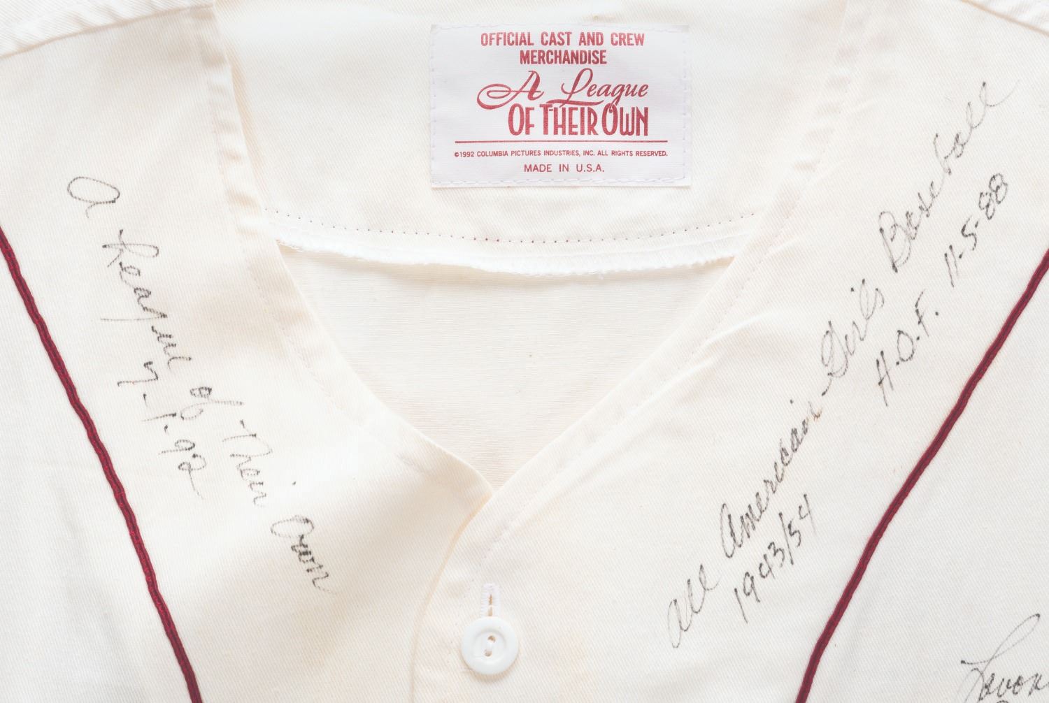 (Columbia, 1992) A multi-signed "A League of Their Own" cast and crew Rockford Peaches jersey and Legendary Ladies of Baseball Hall of Fame '88 hat. Signatures include those of real-life All-American Girls Baseball players Dottie Kamenshek, Marge Wenzell, Lefty Hohlmayer, Nickie Fox, and Lavonne "Pepper" Paire Davis, all of whom are in the Baseball Hall of Fame and inspired the film. Unlabeled but likely a size large, the jersey is in good condition with spots of discoloration, the hat glued to the jersey, and heavy glue on the reverse from previous display.