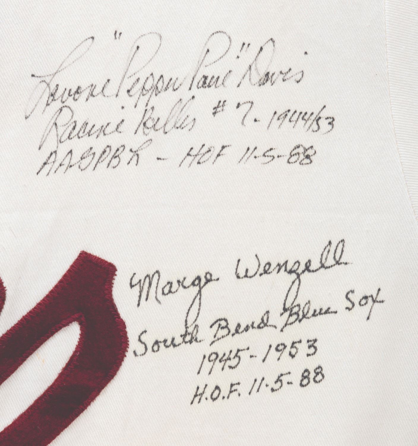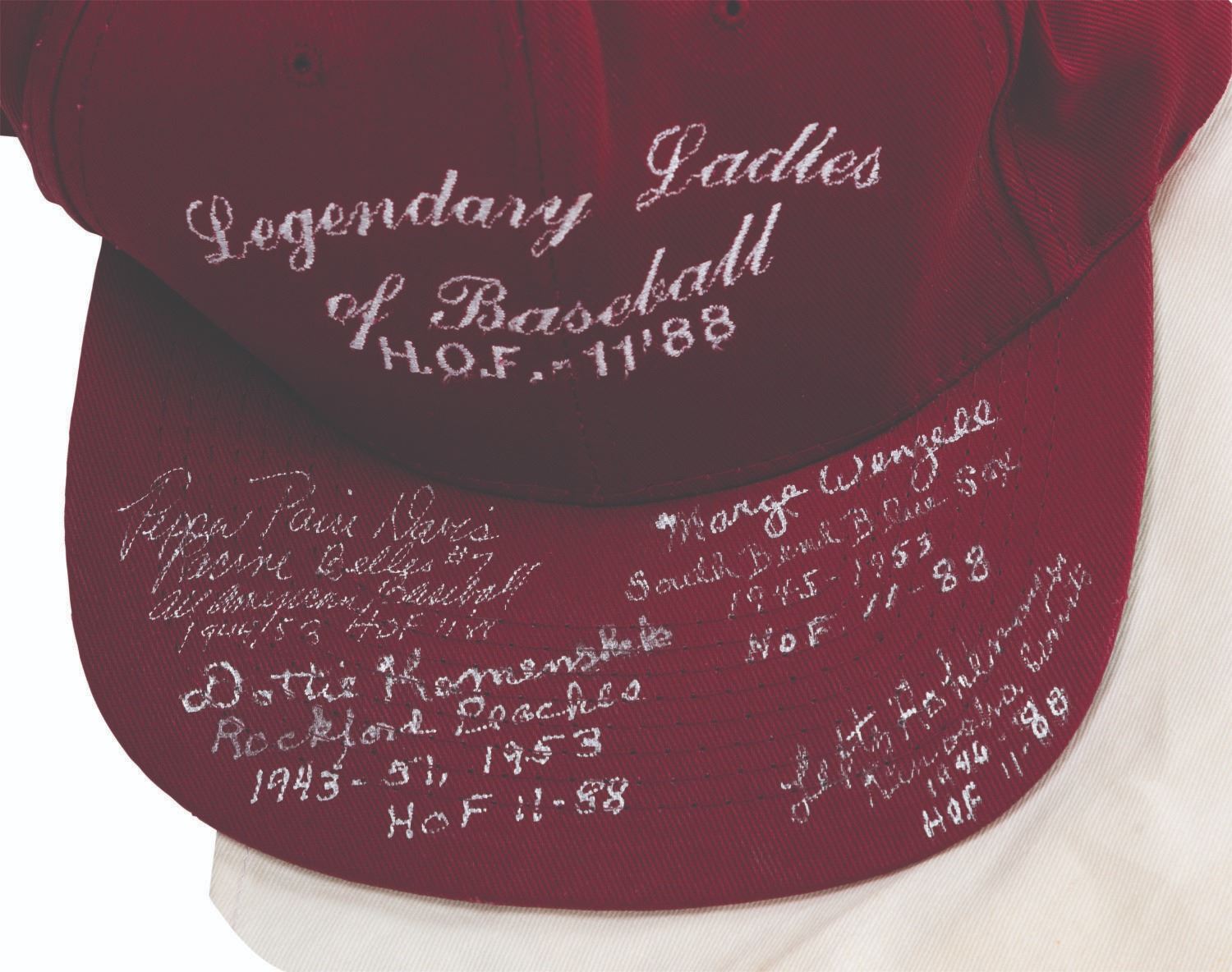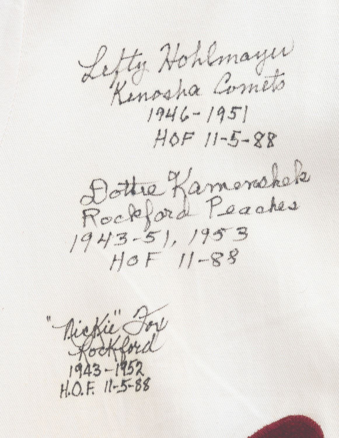 (Columbia, 1992) A multi-signed "A League of Their Own" cast and crew Rockford Peaches jersey and Legendary Ladies of Baseball Hall of Fame '88 hat. Signatures include those of real-life All-American Girls Baseball players Dottie Kamenshek, Marge Wenzell, Lefty Hohlmayer, Nickie Fox, and Lavonne "Pepper" Paire Davis, all of whom are in the Baseball Hall of Fame and inspired the film. Unlabeled but likely a size large, the jersey is in good condition with spots of discoloration, the hat glued to the jersey, and heavy glue on the reverse from previous display.