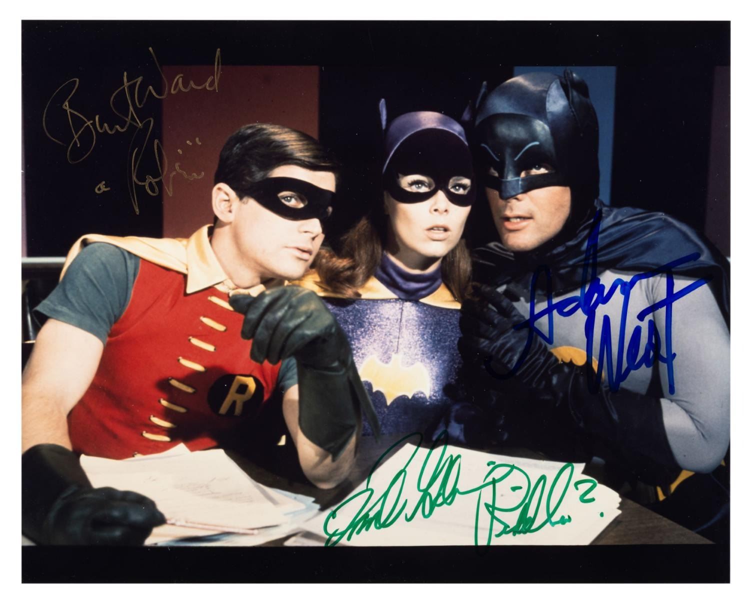 (ABC, 1970s-90s) A publicity photo of Batman, Robin, and Batgirl from the 1966 "Batman" television series, signed by Adam West, Burt Ward (Robin), and Frank Gorshin (Riddler). Measuring 8" x 10", the photo is in fine condition.
