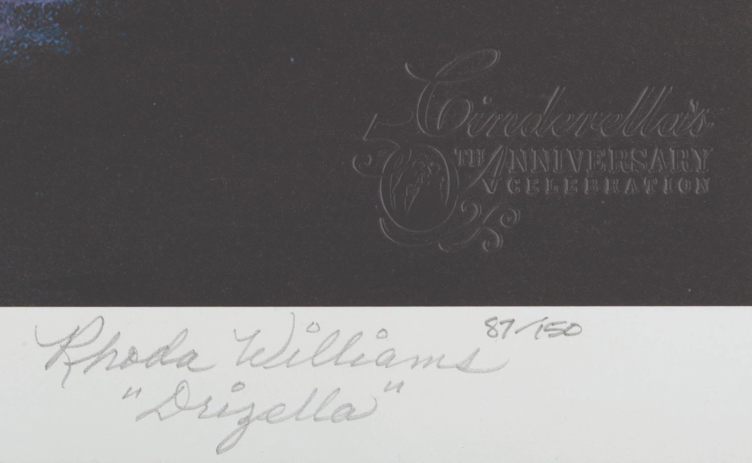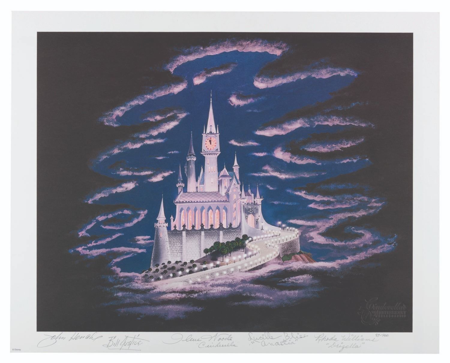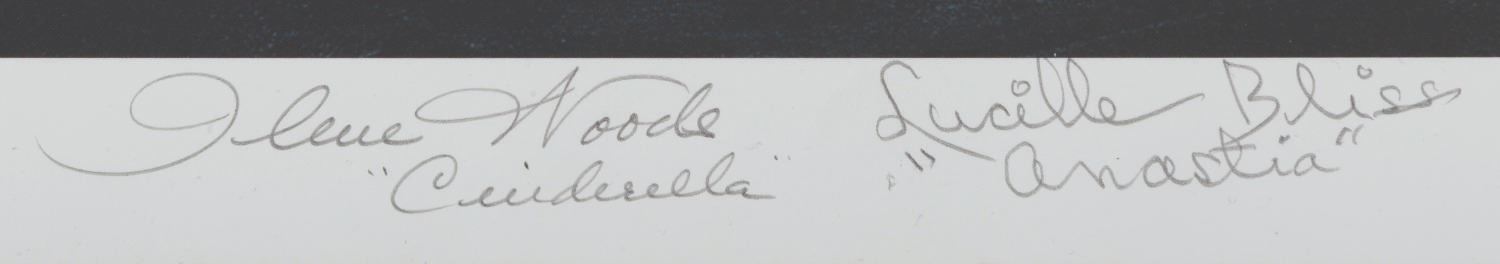 (Disneyland, 2000) A multi-signed limited edition print produced for the "Cinderella" 50th Anniversary event at The Disney Gallery. Hand-numbered 87/150, the lithographic print depicts Cinderella's castle by artist James Trout and has been signed by John Hench, Bill Justice, and voice actors Ilene Woods (Cinderella), Lucille Bliss (Anastasia), and Rhoda Williams (Drizella). With an image size of 14" x 17.5" and a total size of 16" x 20", the print is in very good condition with light edge wear.