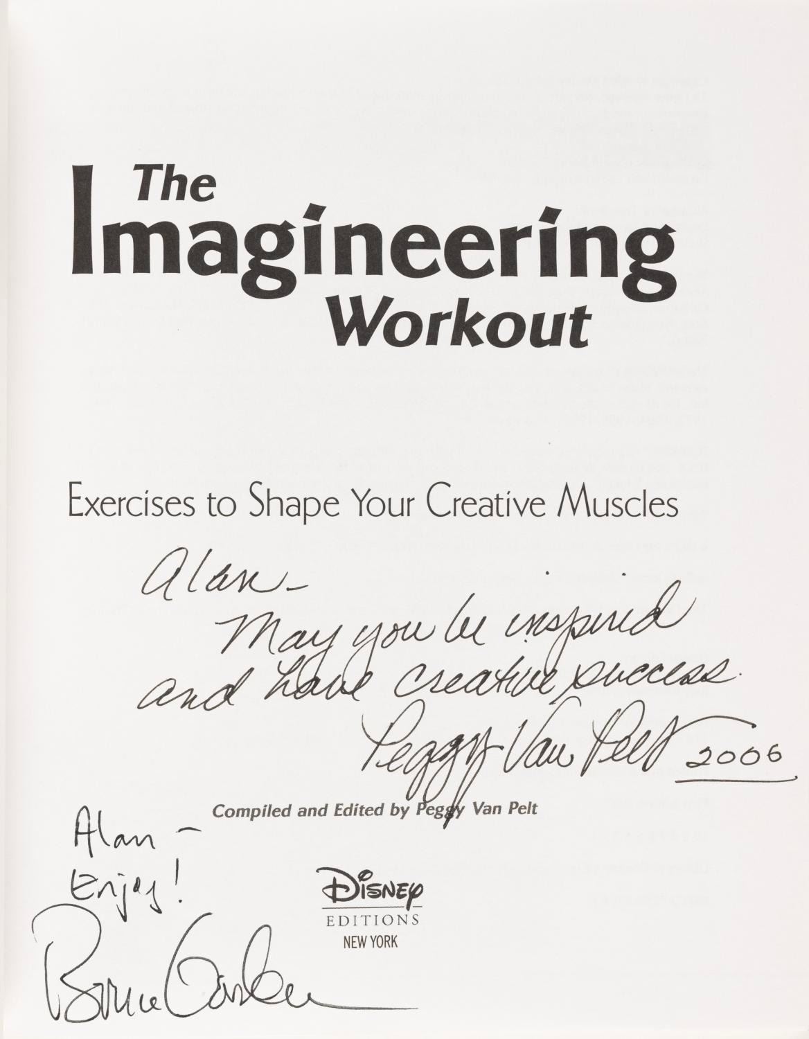 (Disney Editions, 2005/2006) A copy of The Imagineering Workout signed by editor Peggy Van Fleet and layout designer Bruce Gordon. The 160-page book consists of a collection of exercises written by Disney Imagineers "to shape your creative muscles." Gorden and Van Fleet signed and personalized the title page in black ink. Measuring 7.25" x 8.5", the book is in very good condition with very light wear on the front and back cover, and a soft vertical crease down the middle of the back cover.