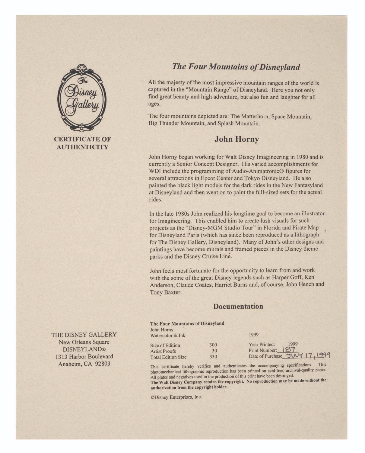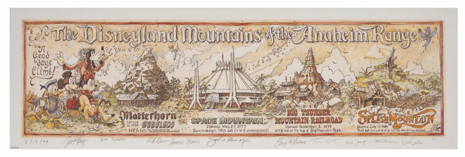 (Disneyland, 1999) A multi-signed lithograph titled "The Disneyland Mountains of the Anaheim Range," by John Horny. Released through The Disney Gallery, this print is signed by ten Imagineers who contributed to these legendary peaks: Tony Baxter, Harriet Burns, Don Edgren, Bruce Gordon, Bob Gurr, John Hench, John Horny, Fred Joerger, George McGinnis, and John Stone. This piece measures 39"x12.5" and is in fine condition. The lithograph has been hand-numbered 187/300, dated 7/17/99, and retains an embossed Disney Gallery seal at the lower right and its Certificate of Authenticity.