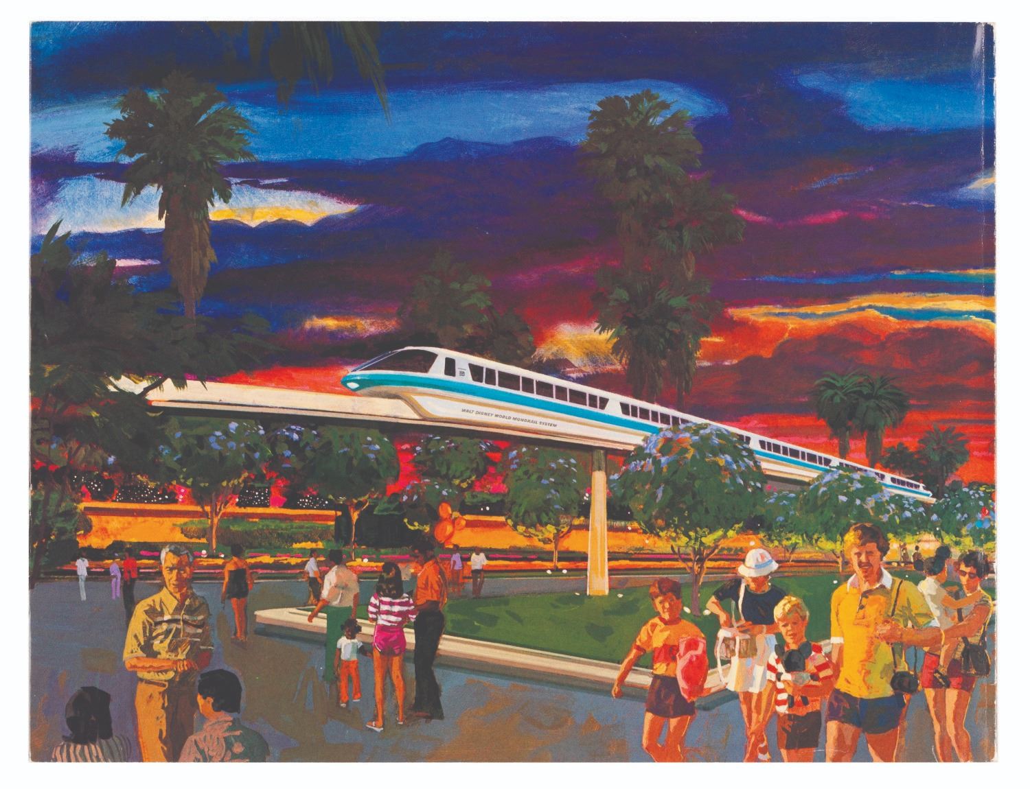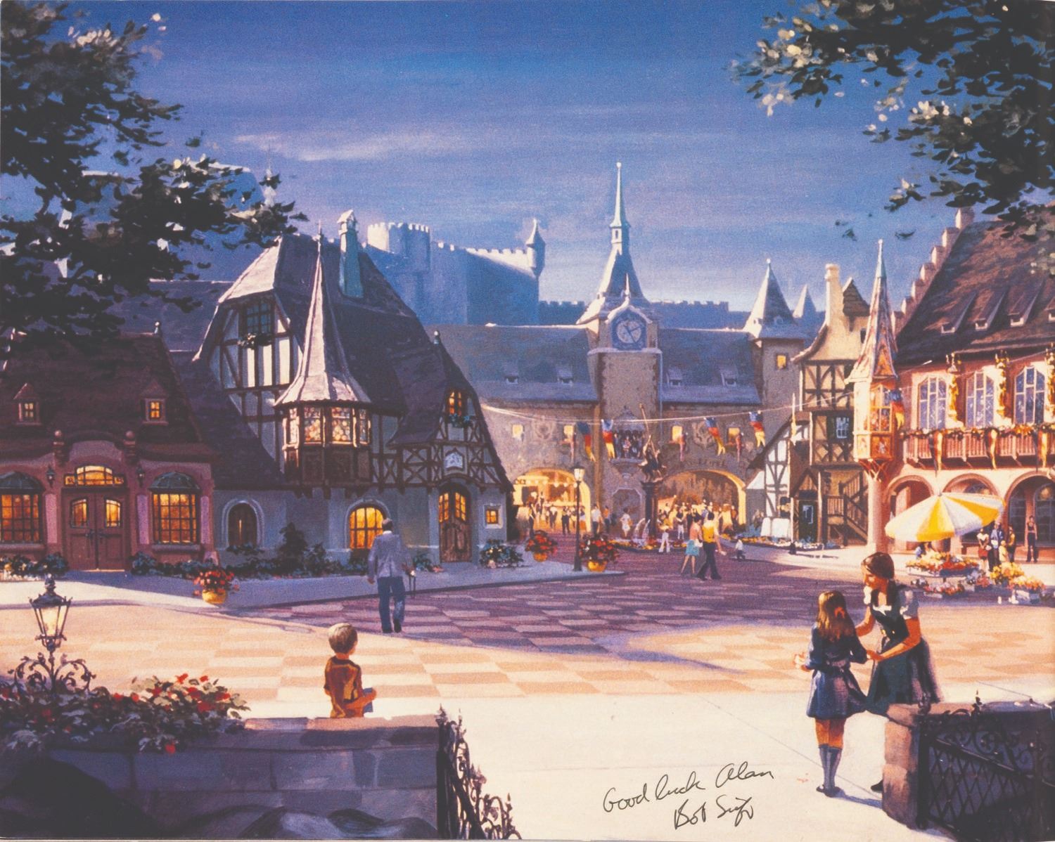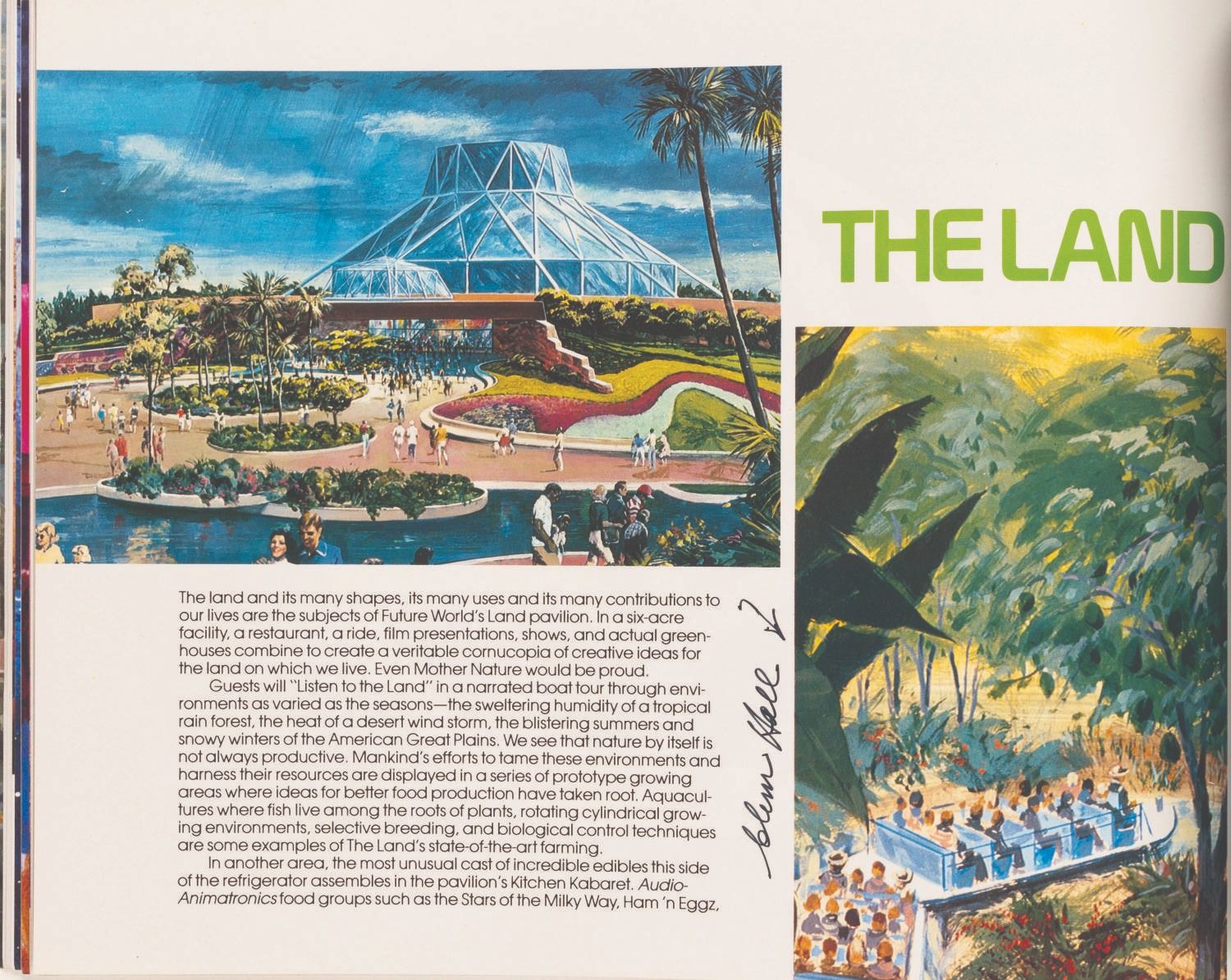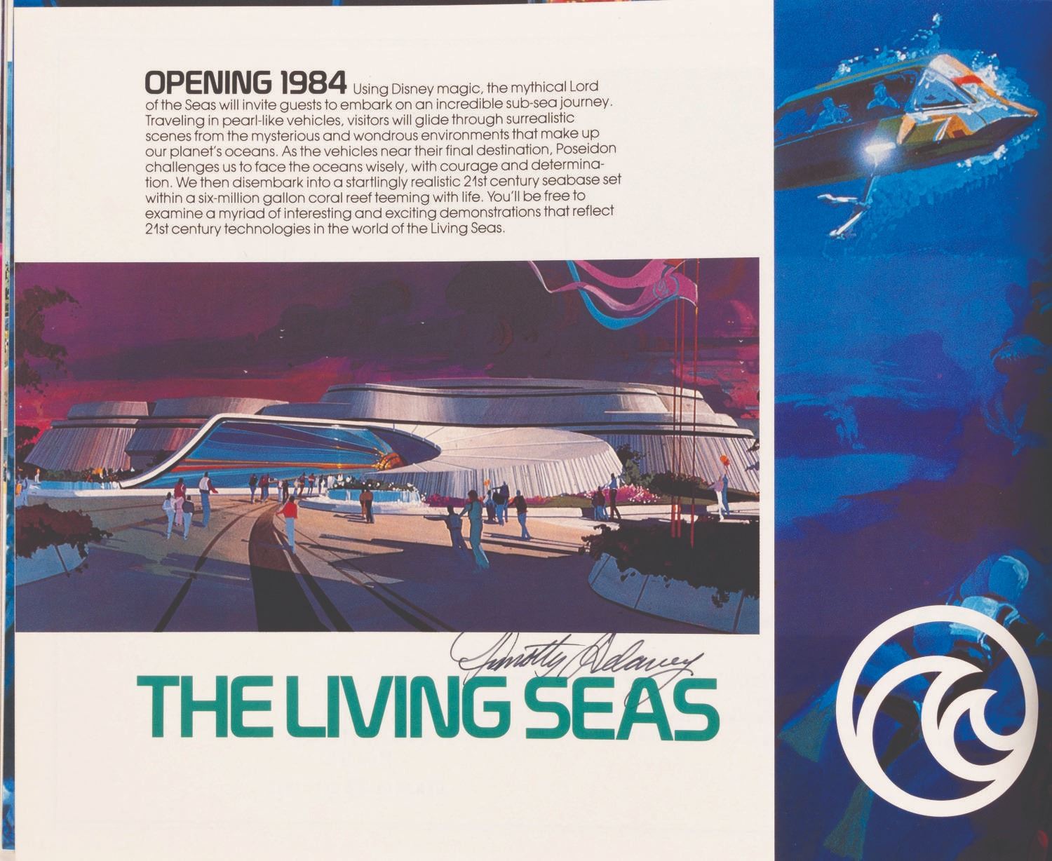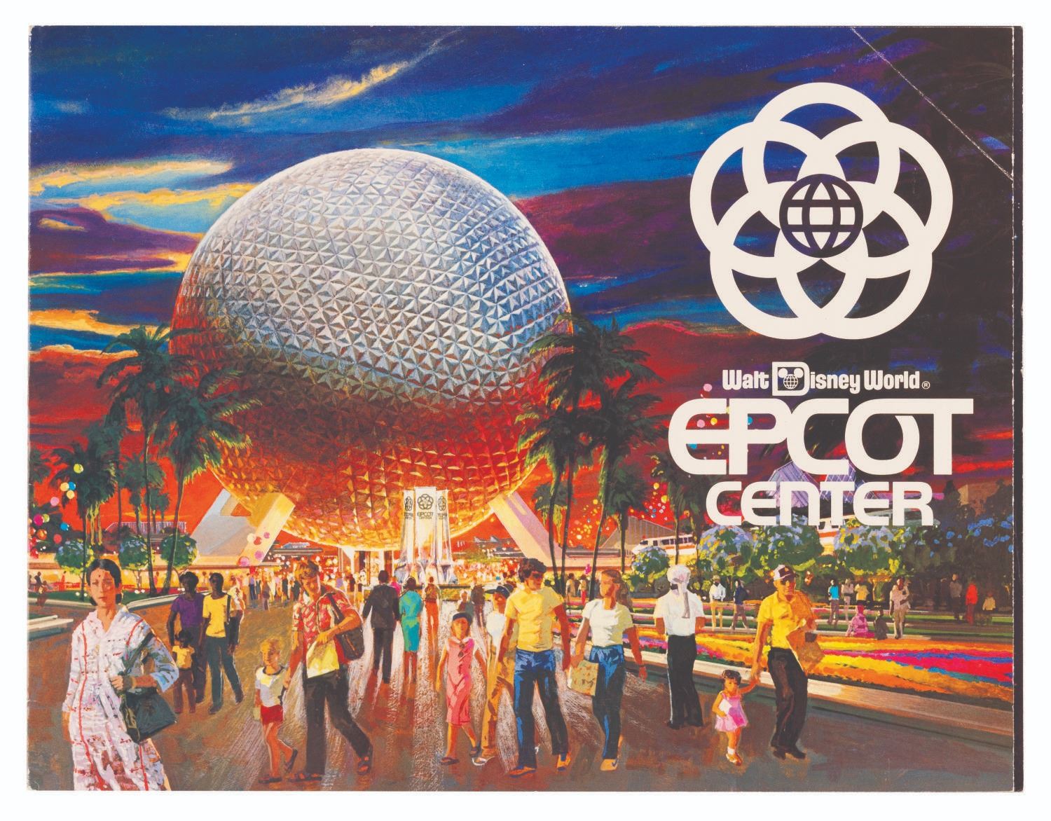 (EPCOT, 1982) An early EPCOT Center souvenir guide signed by Imagineers, Clem Hall, Tom Gilleon, Timothy Delaney, and artists Bob Scifo, and Gene Johnson, next to their respective pieces of concept art. Measuring 8.5” x 11”, the guide is in good condition with light wear and creases, including a large crease at the top right corner of the cover.