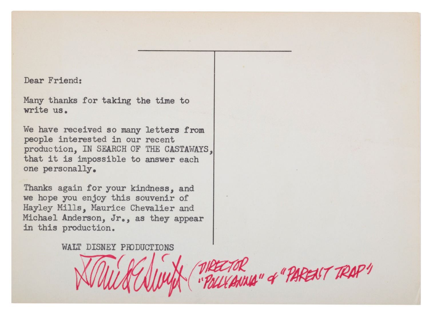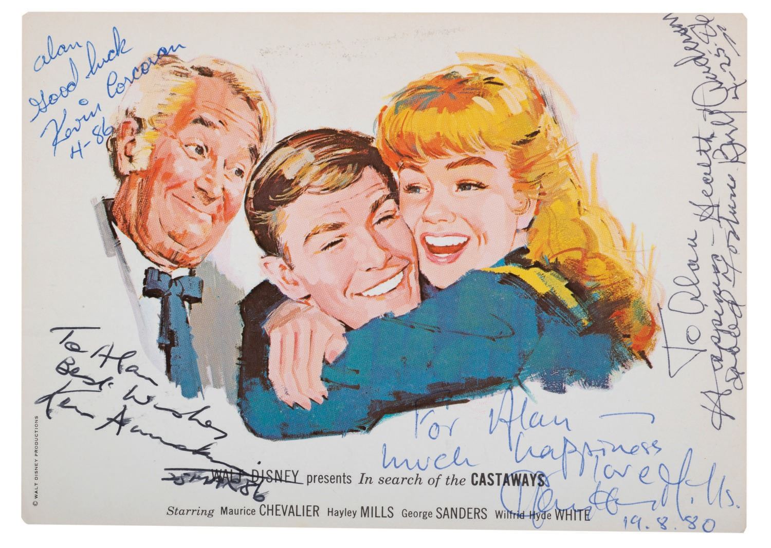 (Disney, 1962) An "In Search of the Castaways" fan card signed by Director David Swift, Kevin Corcoran, Hayley Mills, Bill Anderson, and Disney director Ken Annakin (who was not involved with this film). The card measures 5"x7" and is in very good condition with minor wear and discoloration from handling and age.
