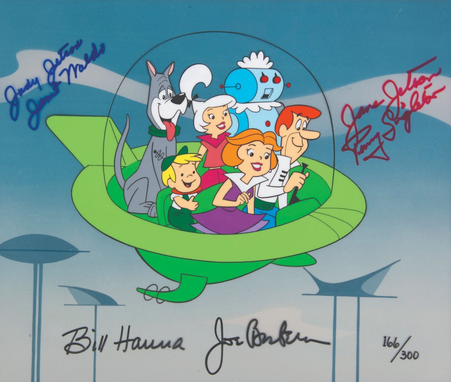 (Hanna-Barbera, 1989) A hand-painted limited edition cel featuring The Jetsons. The cel, titled"Sunday Drive," has been hand-signed by Bill Hanna and Joe Barbera as well as Penny Singleton (Voice of Jane Jetson) and Janet Waldo (voice of Judy Jetson). The fine condition cel is numbered 166 out of an edition of 300 and measures 10.5"x12.5".