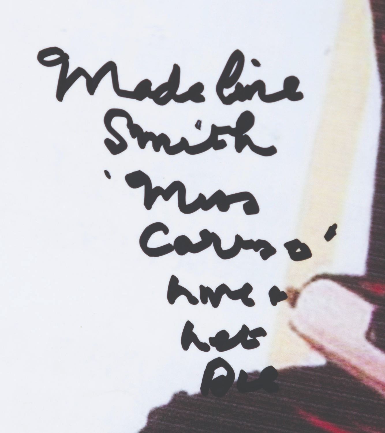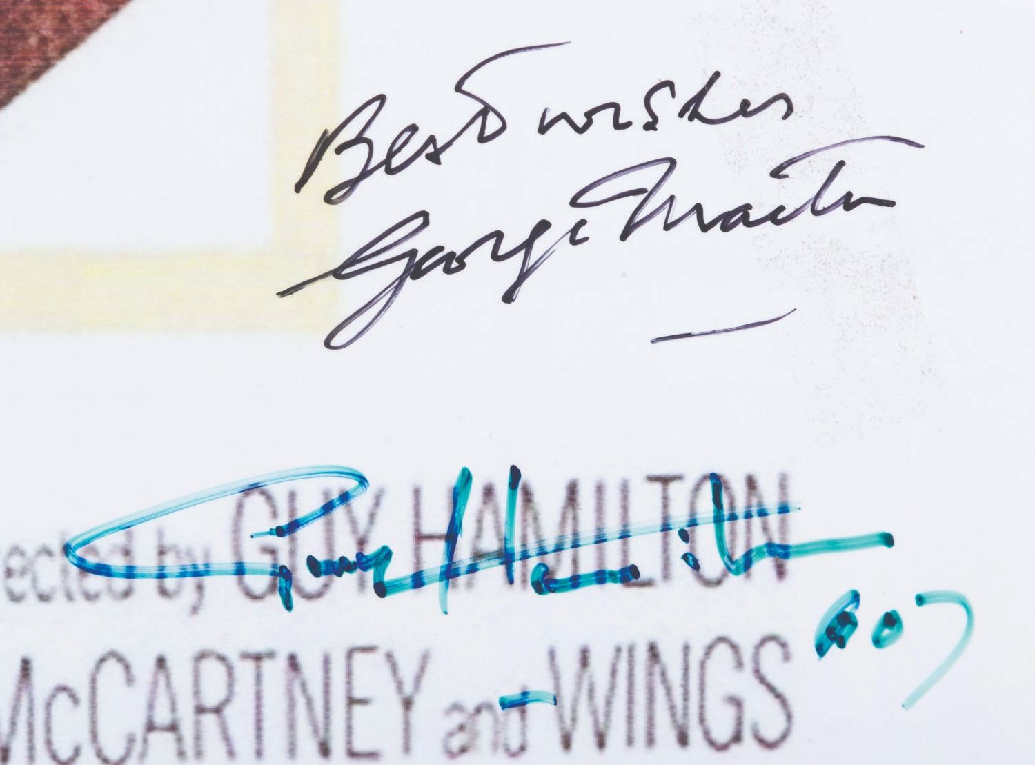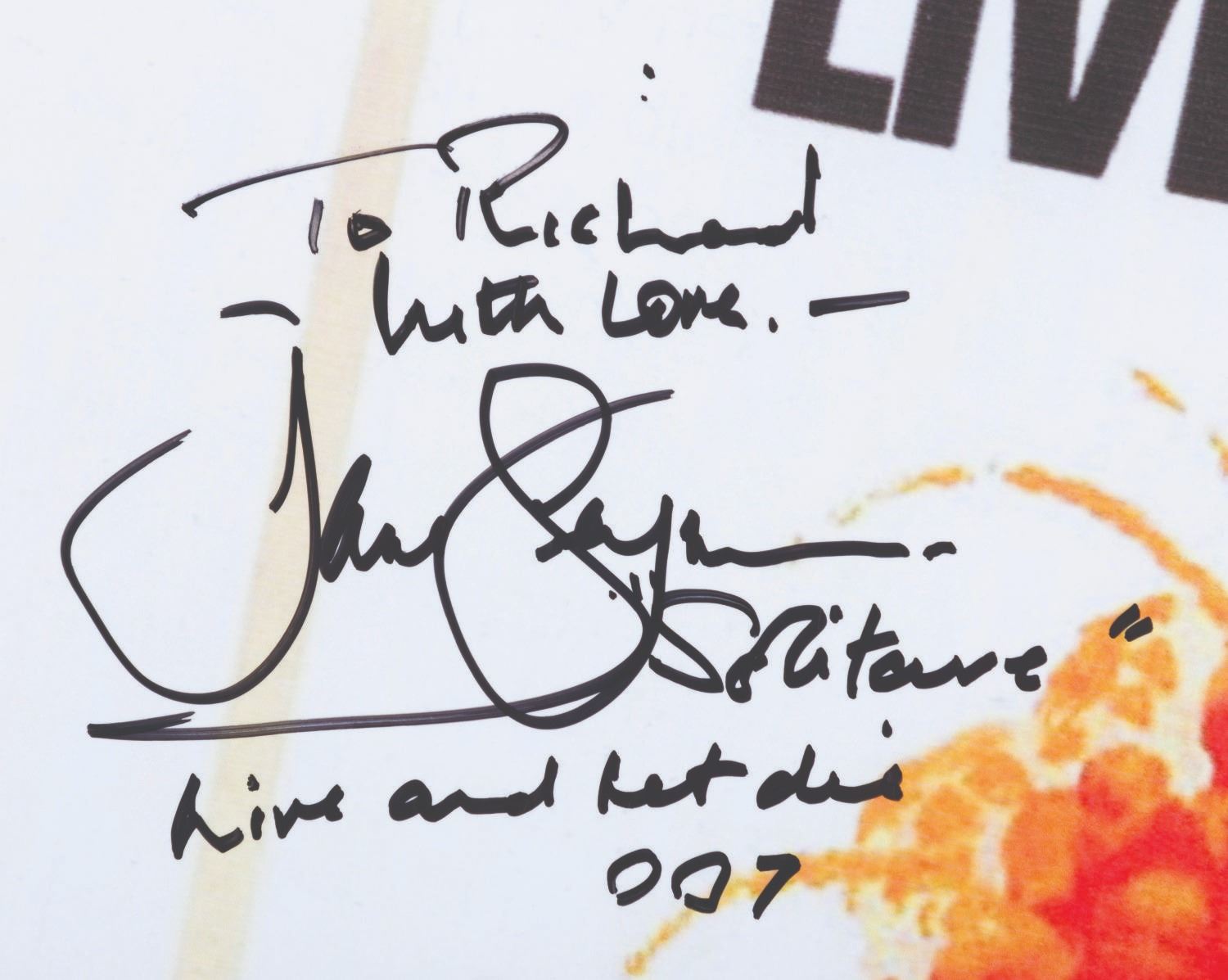 (United Artists, 1973) A multi-signed "Live and Let Die” reproduction poster. Signatures include Roger Moore, Jane Seymour, Madeline Smith, Gloria Hendry, composer George Martin, and director Guy Hamilton. Measuring 20” x 30”, the low-resolution poster displays in good condition with creases, tape residue, stains, wear, and heavy scratches, particularly to Moore’s face.