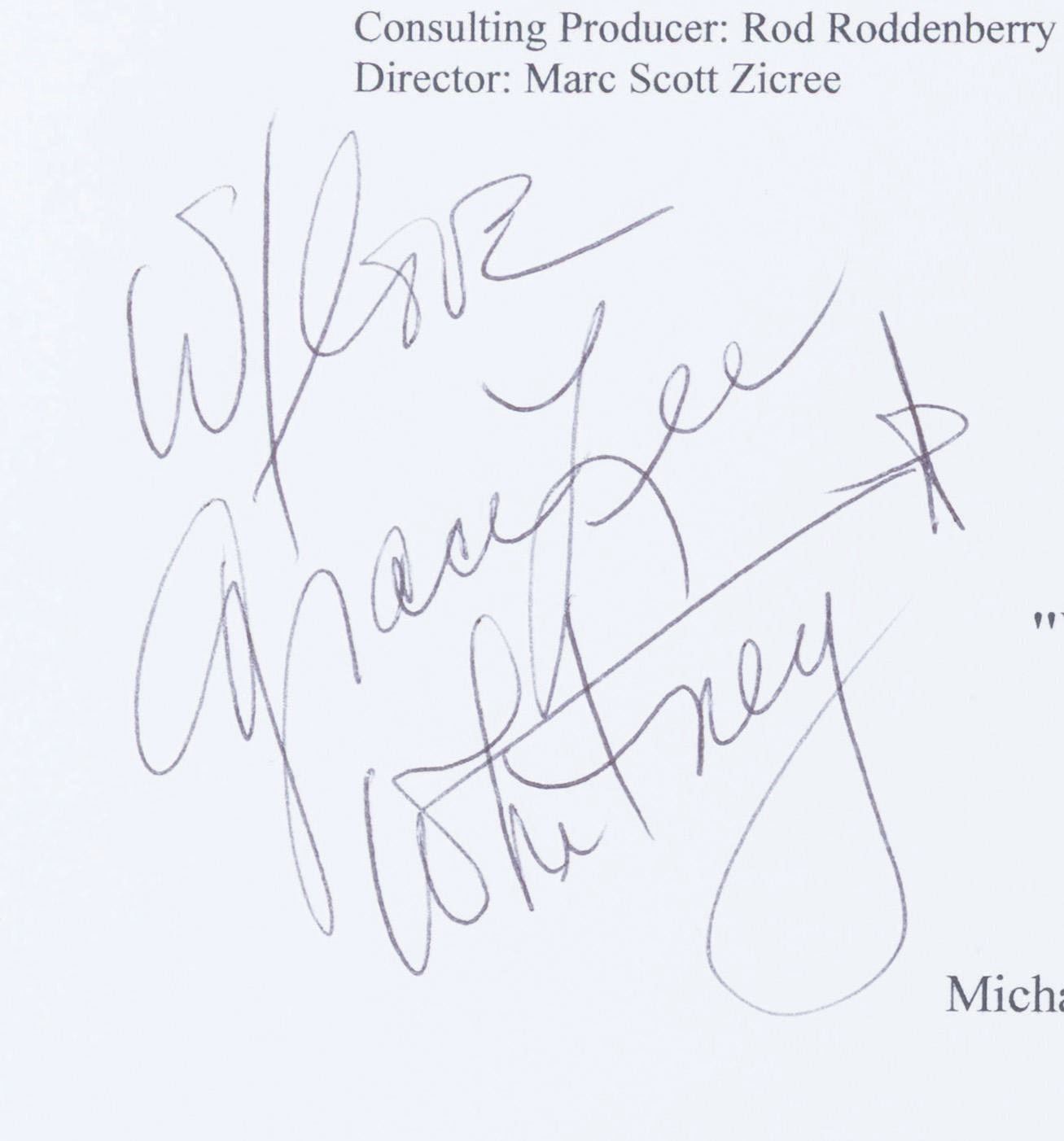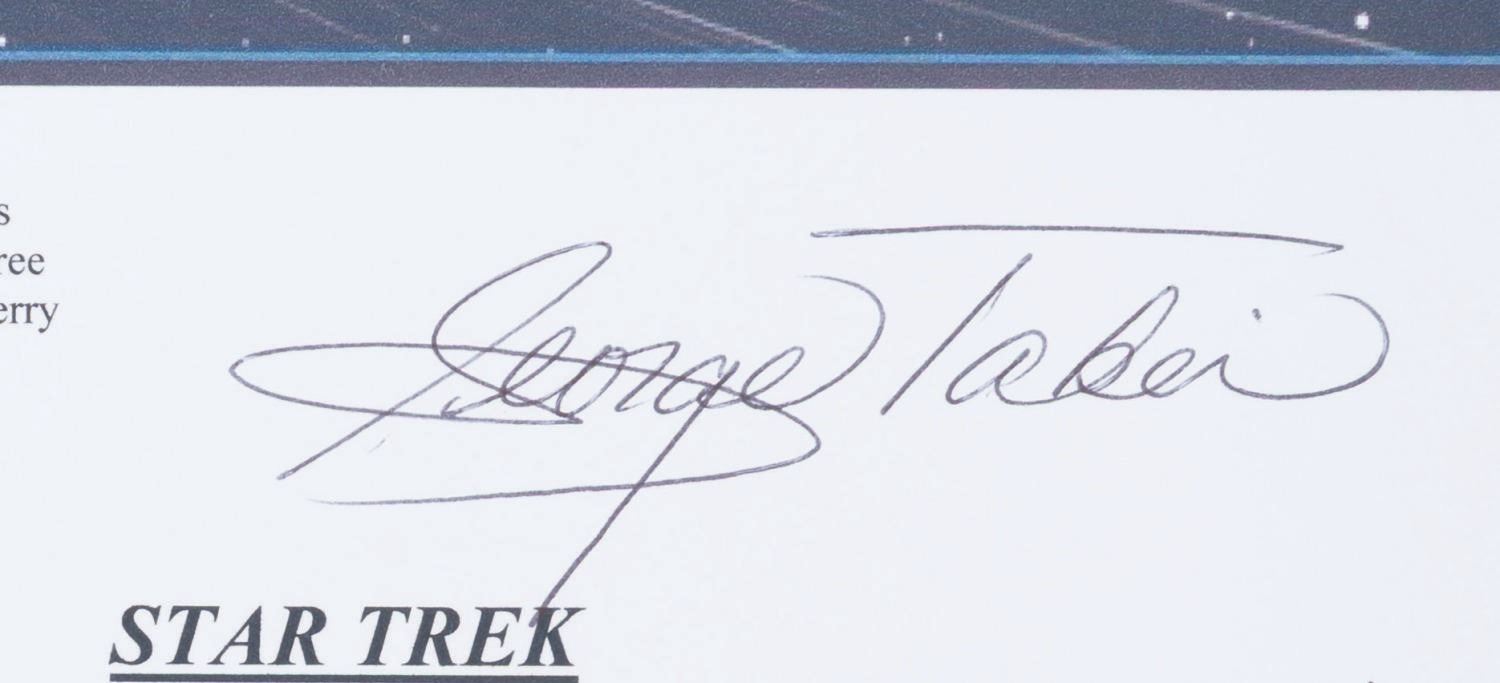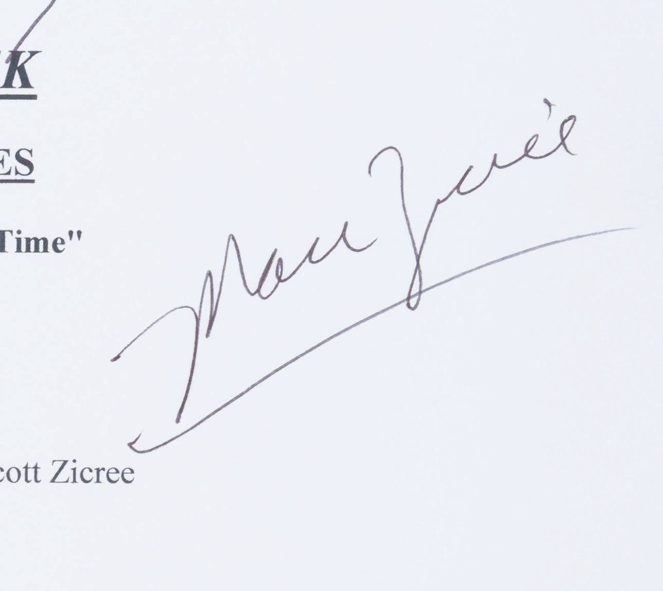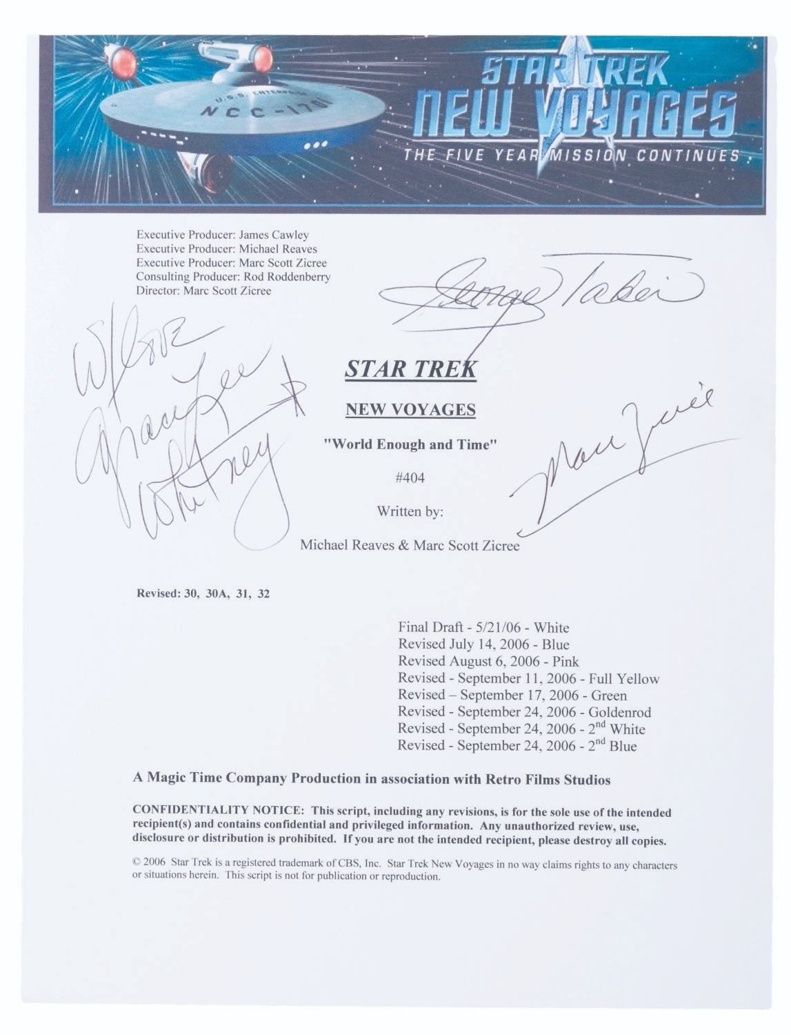 (New Voyages, 2006) A script cover for Star Trek New Voyages episode "World Enough and Time" signed by George Takei (Sulu), Grace Lee Whitney (Yeoman Rand), and director Marc Scott Zicree. This episode holds a unique place in Trek history, as Takei and Whitney reprised their Star Trek: The Original Series roles on this fan-produced show. Measuring 8.5" x 11", the signed script cover is in fine condition.