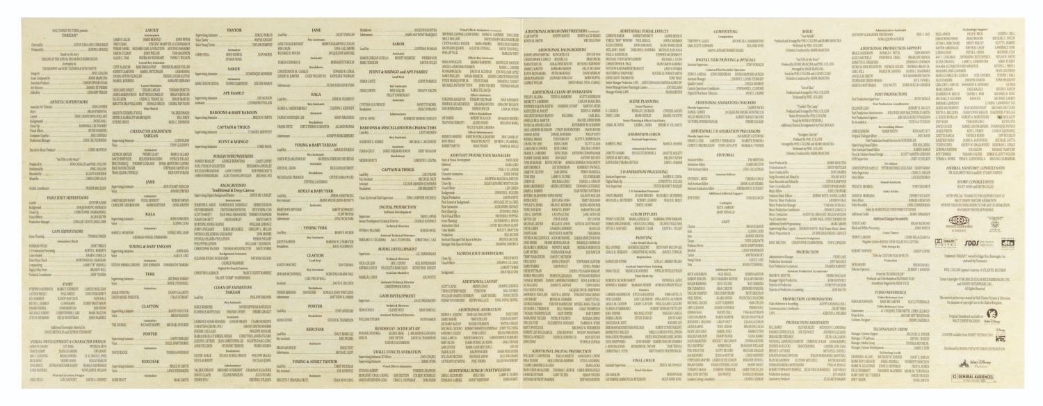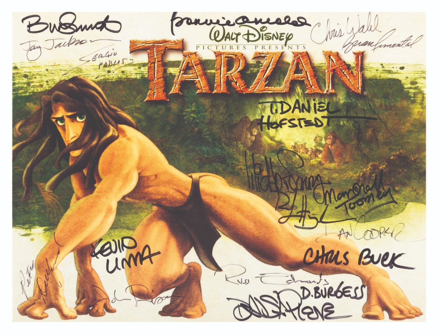 (Disney, 1999) A “Tarzan” program signed by directors Chris Buck and Kevin Lima, producer Bonnie Arnold, art directors Dan Cooper and Daniel St. Pierre, animators Russ Edmonds, Dave Burgess, John Ripa, Marshall Lee Toomey, Randy Haycock, Michael Surrey, Bruce W. Smith, Jay Jackson, Sergio Pablos, Chris Wahl, Brian Pimental, and T. Daniel Hofstedt, and visual effects supervisor Peter DeMund. Measuring 9” x 12”, the program displays in fine condition.