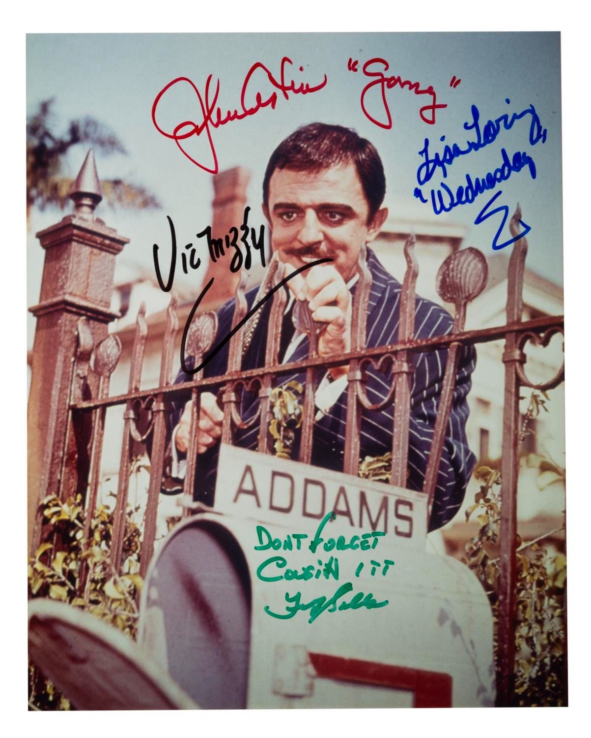 (ABC, 1980s-90s) A publicity photo of Gomez from "The Addams Family" television series with four signatures. The print is signed by John Astin (Gomez), Lisa Loring (Wednesday), Felix Silla (Cousin Itt), and Vic Mizzy, who wrote the iconic theme song. Measuring 8" x 10", the photo is in very good condition with light wear.