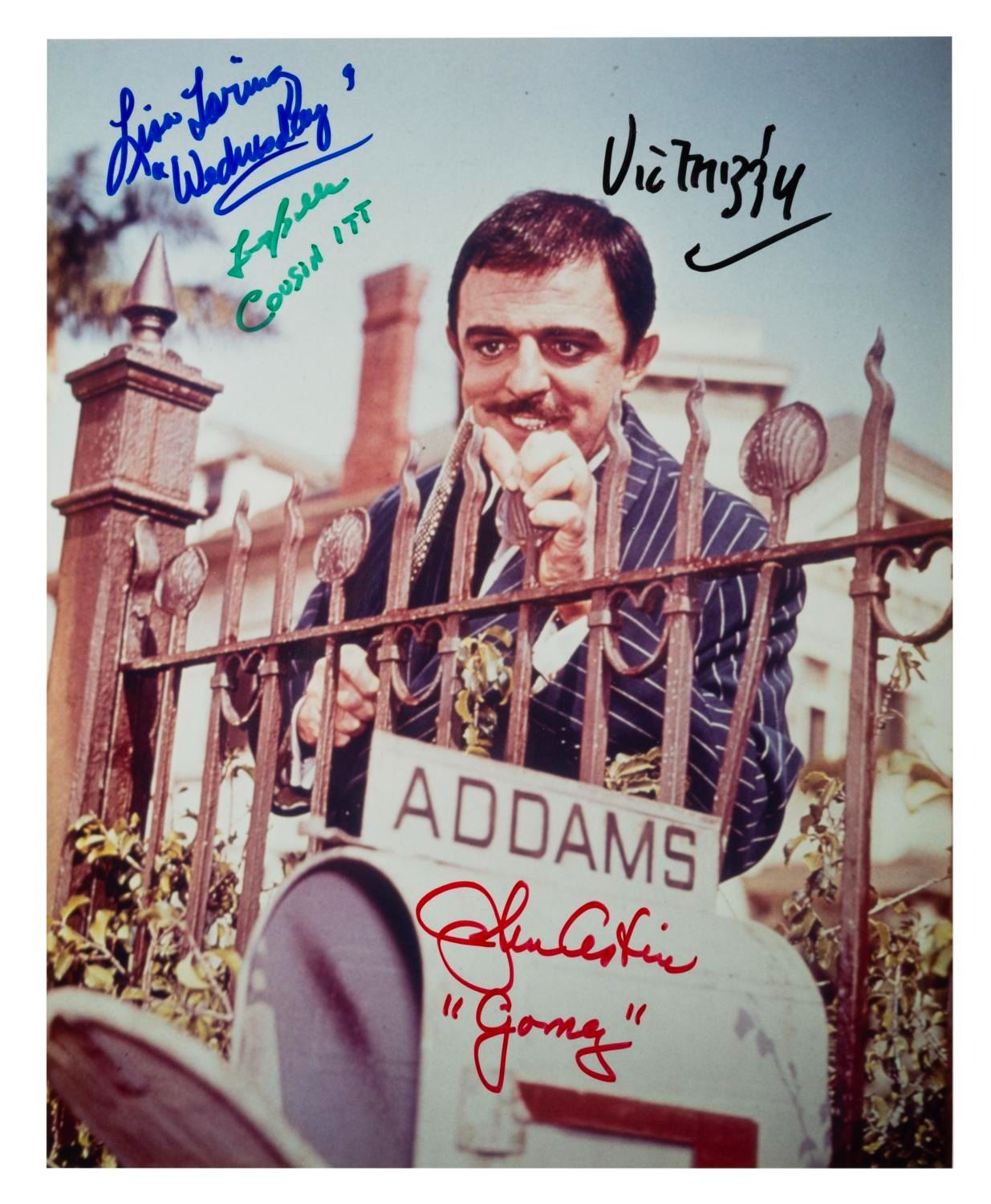 (ABC, 1980s-90s) A publicity photo of Gomez from "The Addams Family " television series signed by John Astin (Gomez), Lisa Loring (Wednesday), Felix Silla (Cousin Itt), and Vic Mizzy, who wrote the iconic theme song. Measuring 8 " x 10 " the autographed photo is in fine condition.