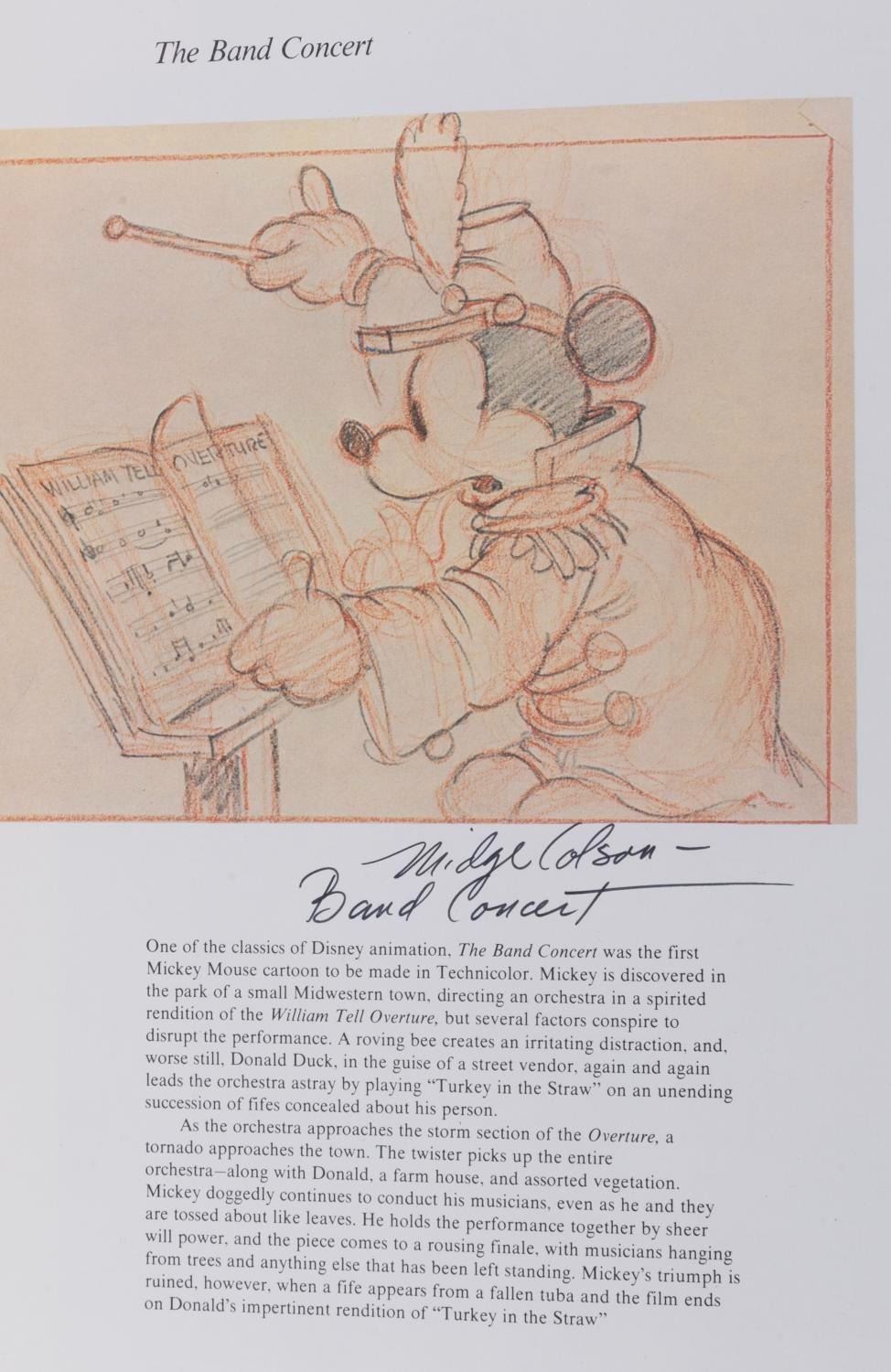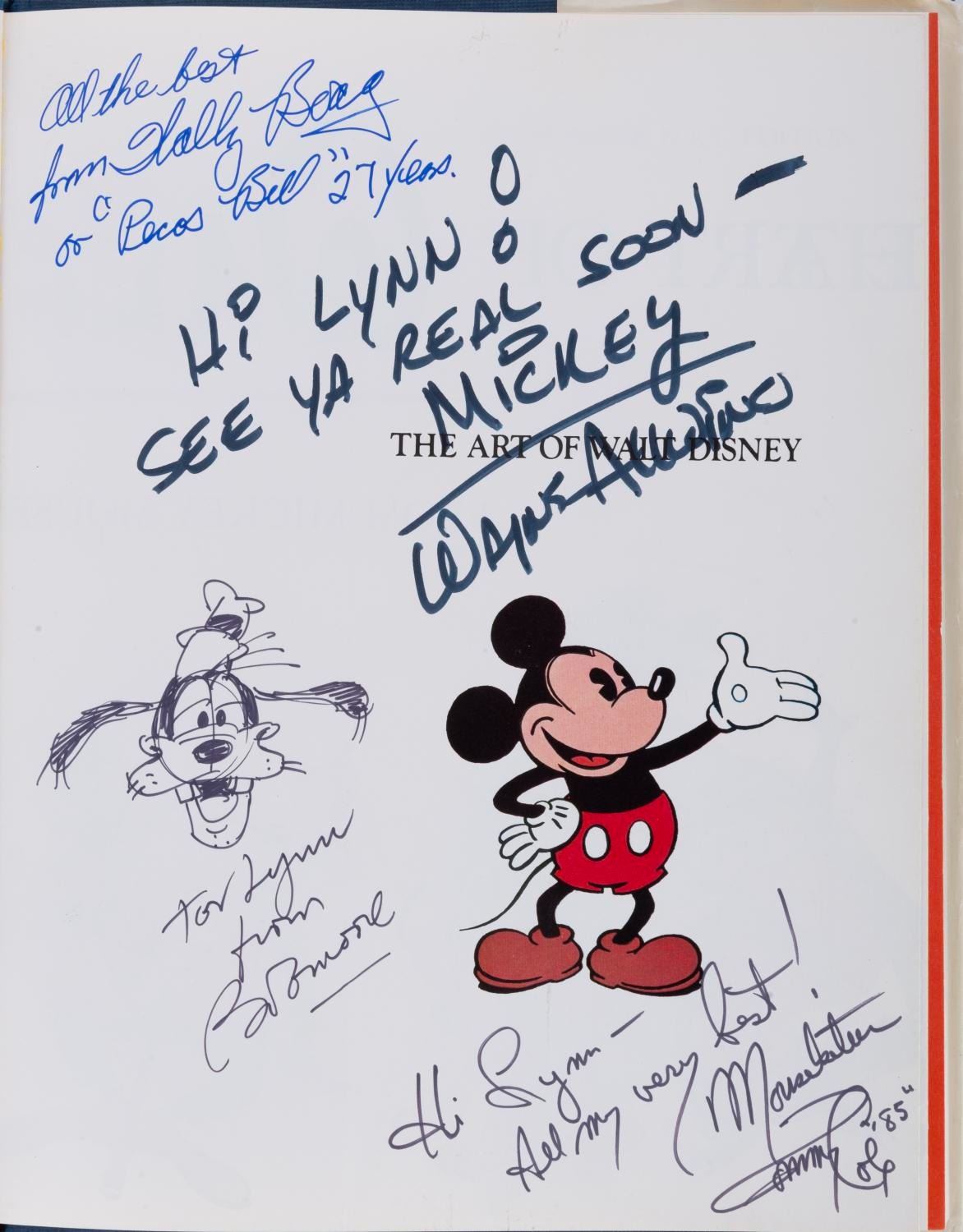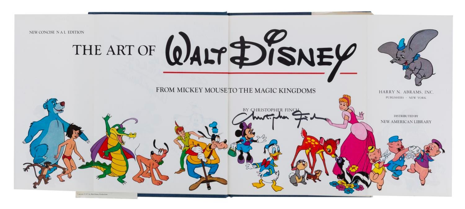 (Abrams, 1975) A New Concise Edition of "The Art of Walt Disney - From Mickey Mouse to Magic Kingdoms" book signed by Wayne Allwine, Wally Boag, Bob Moore, Tommy Cole, and author Christopher Finch. This 159-page hardcover publication is filled with unique interviews and drawings courtesy of the Walt Disney Archives. Measuring 9"x11.5", this book is in good condition with minor scuffs and wear.