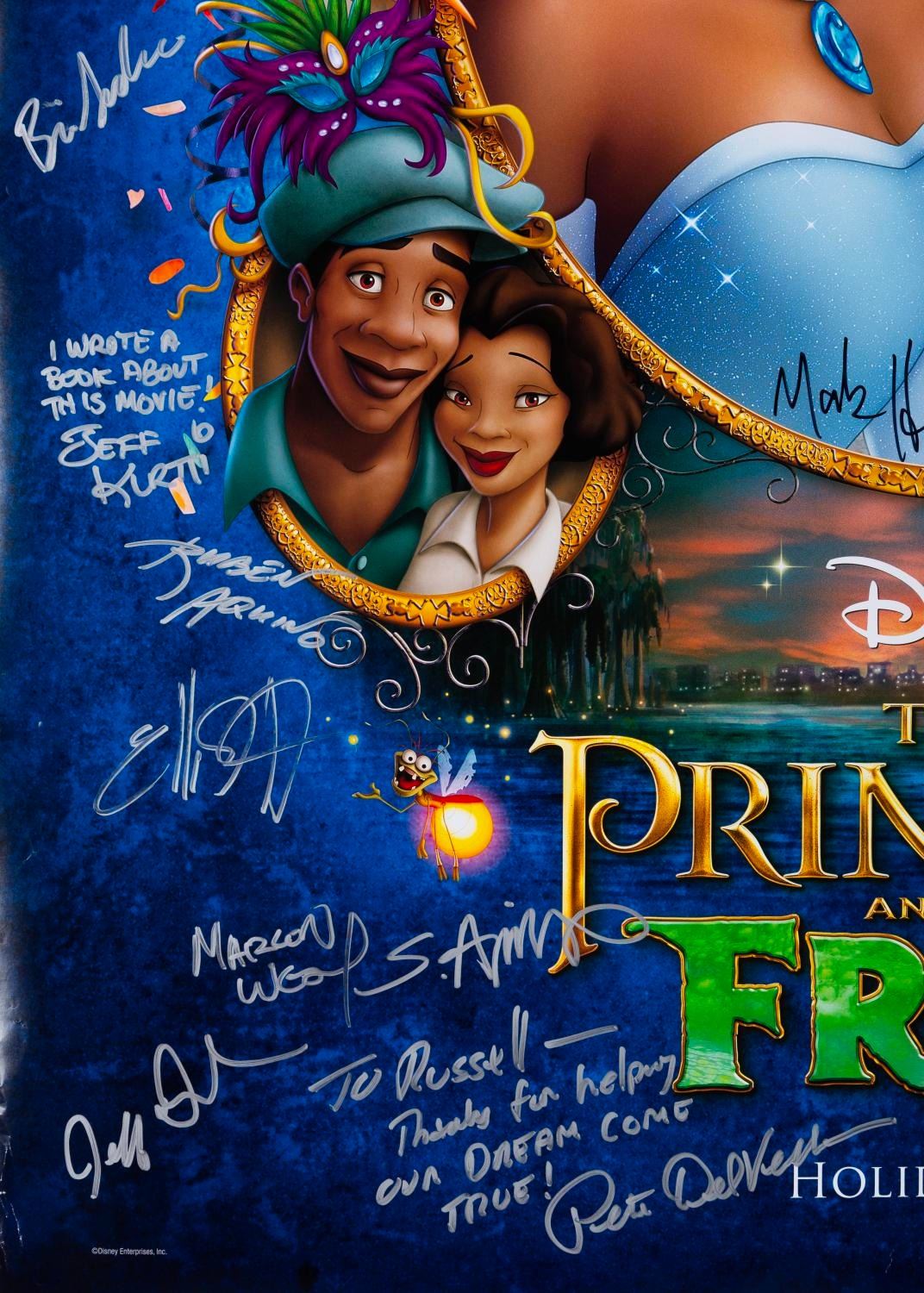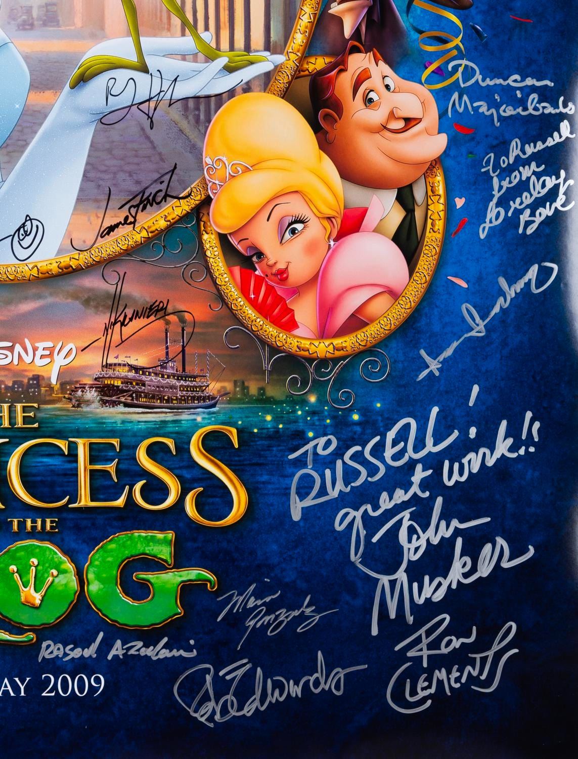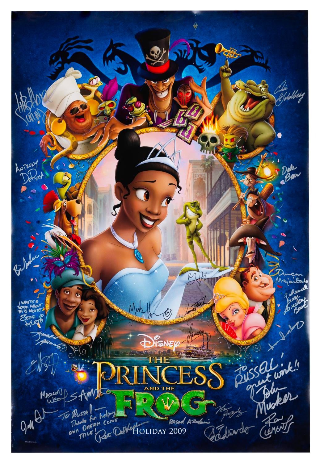 (Disney, 2009) A rare "The Princess and the Frog " teaser one-sheet signed by many of the cast and crew. Signatures include directors John Musker and Ron Clements, Eric Goldberg, Dale Baer, Duncan Marjoribanks, Rob Edwards, Peter Del Vecho, Lorelay Bove, Jeff Kurtti, Maria Gonzalez, Rasoul Azadani, Marlon West, Ruben Aquino, Sunny Apinchapong, Anthony DeRosa, Mark Henn, James Finch, Nik Ranieri, Randy Haycock, and five additional signatures, with several personalized for "Russell. " Measuring 27 " x 40 ", the signed poster is in good condition with creases, edge wear, and stains at the top center.