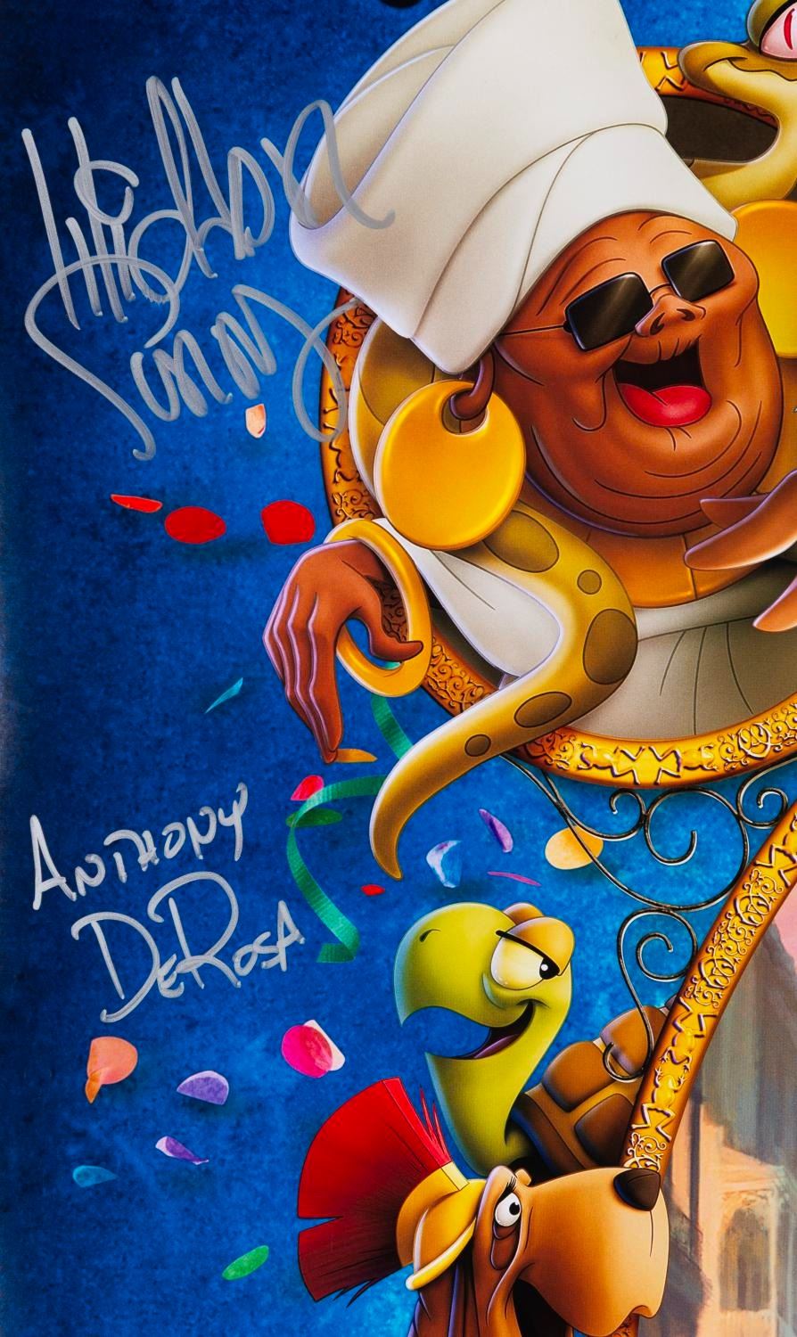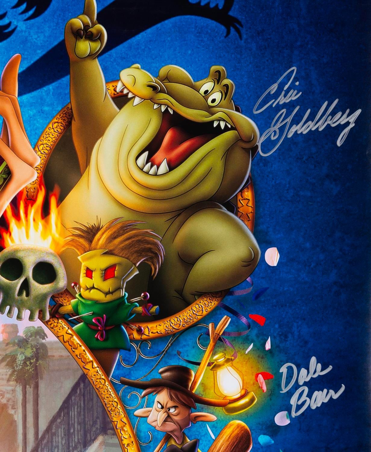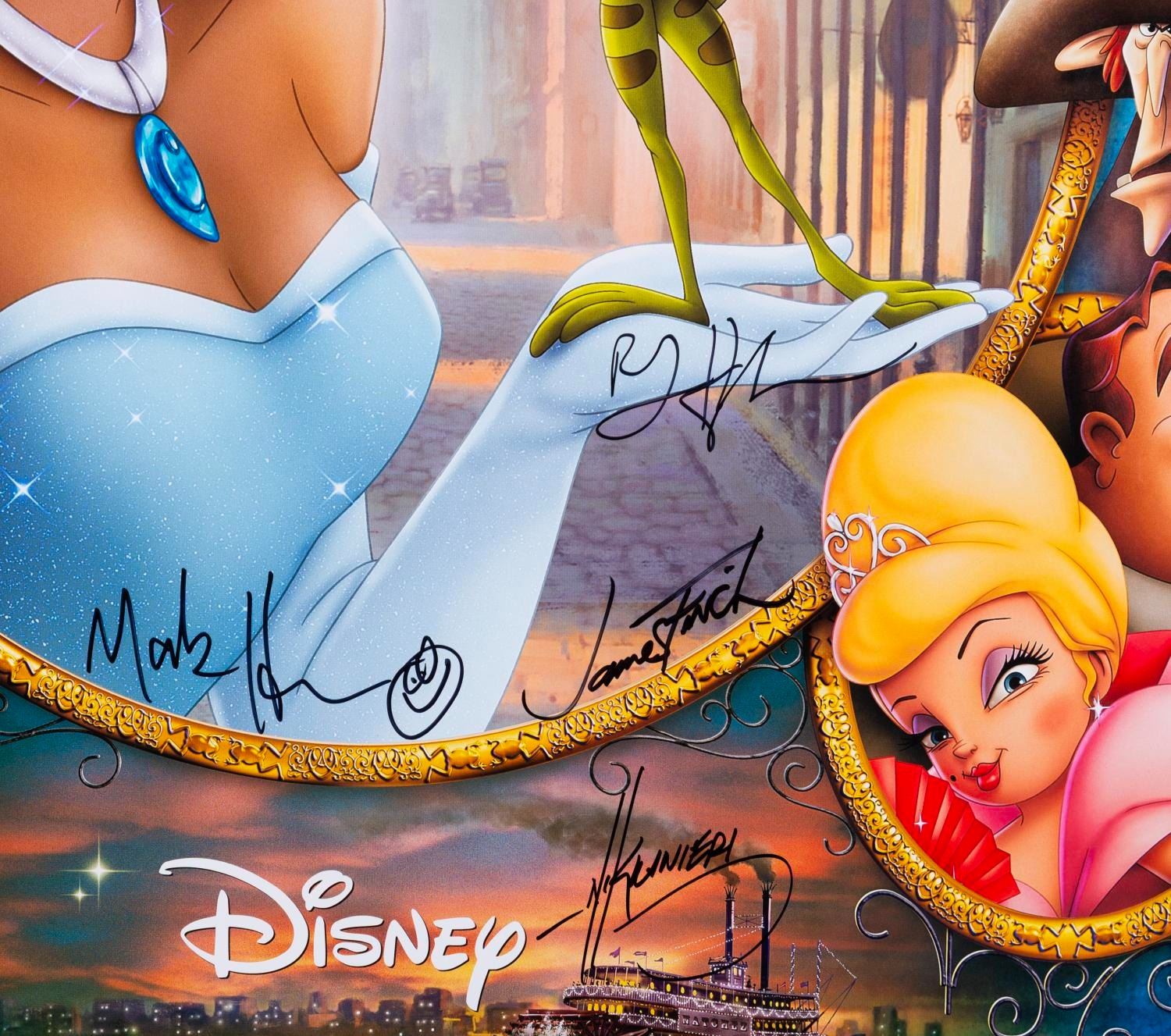 (Disney, 2009) A rare "The Princess and the Frog " teaser one-sheet signed by many of the cast and crew. Signatures include directors John Musker and Ron Clements, Eric Goldberg, Dale Baer, Duncan Marjoribanks, Rob Edwards, Peter Del Vecho, Lorelay Bove, Jeff Kurtti, Maria Gonzalez, Rasoul Azadani, Marlon West, Ruben Aquino, Sunny Apinchapong, Anthony DeRosa, Mark Henn, James Finch, Nik Ranieri, Randy Haycock, and five additional signatures, with several personalized for "Russell. " Measuring 27 " x 40 ", the signed poster is in good condition with creases, edge wear, and stains at the top center.