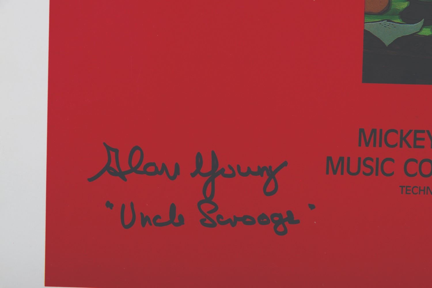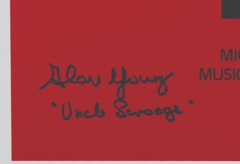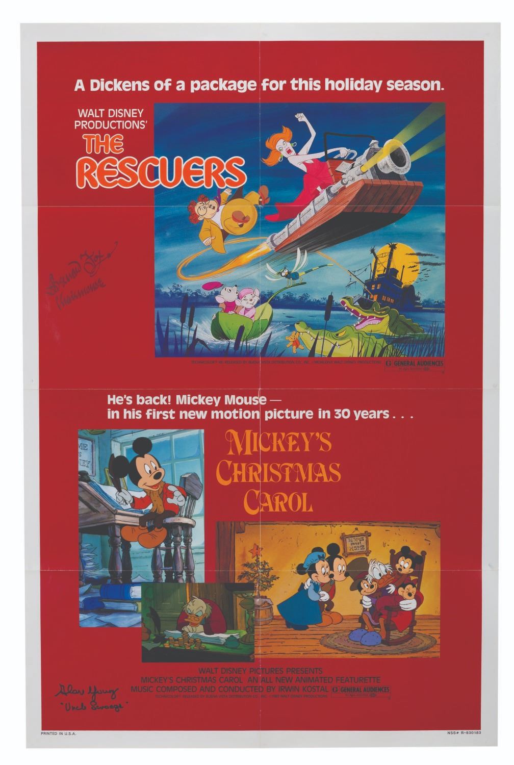 (Disney, 1983) A signed one-sheet for the"The Rescuers" and"Mickey's Christmas Carol" double-bill release. The poster has been signed by Bernard Fox, the voice Mr. Chairman in"The Rescuers," and Alan Young, the voice of Scrooge McDuck in"Mickey’s Christmas Carol." Measuring 27" x 41", the poster displays in very good condition with light wear along the original folds, creases, and wear.