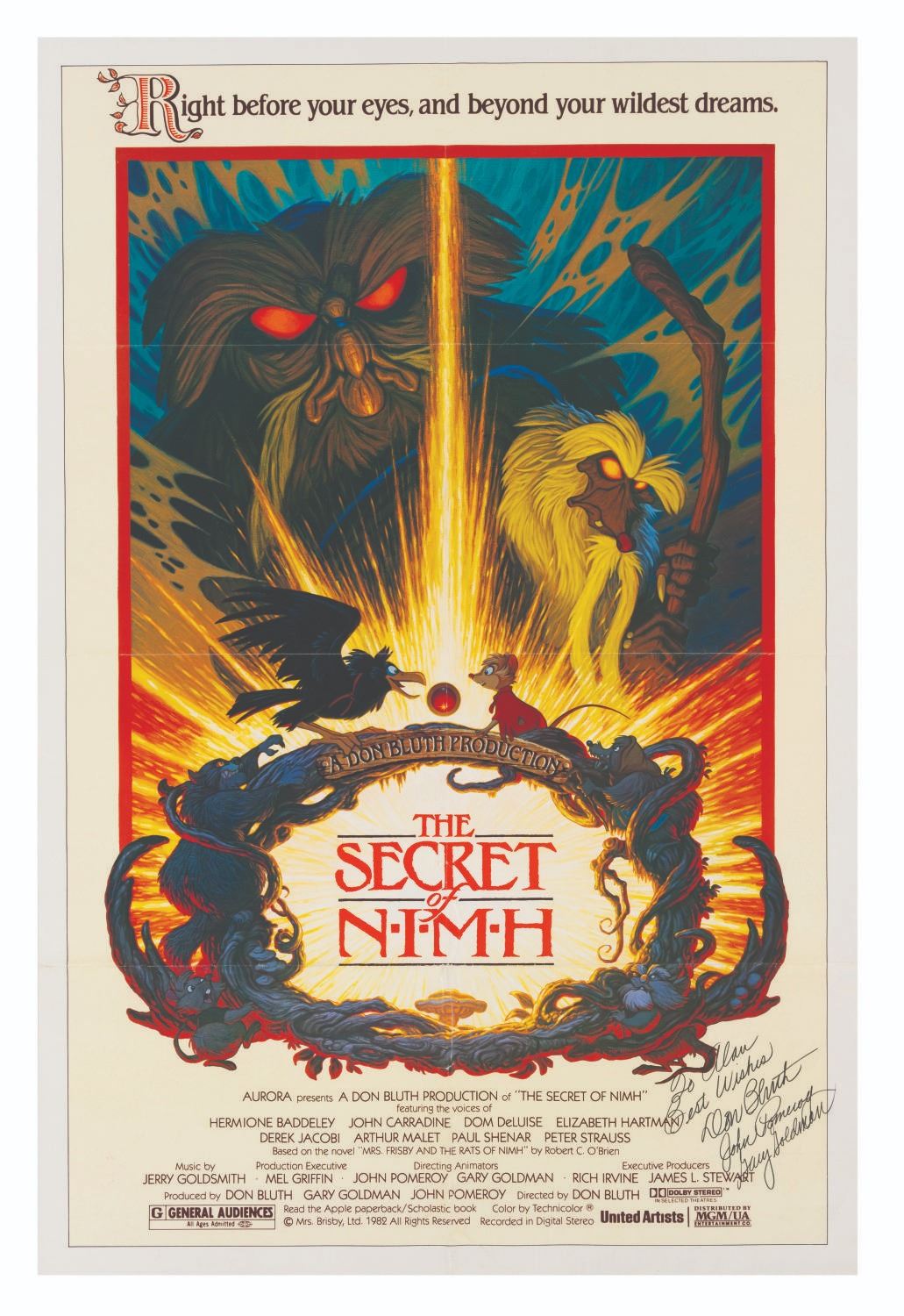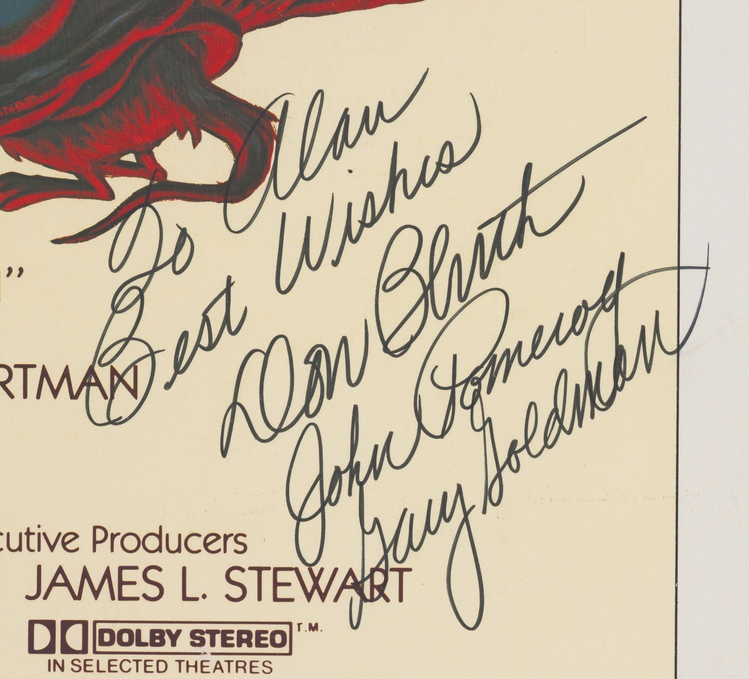 (MGM, 1982) An original one-sheet for the animated film "The Secret of NIMH,” signed by Don Bluth and producers Gary Goldman and John Pomeroy. Measuring 27” x 41”, the poster is in very good condition with original folds, creases, smudges, and light wear.