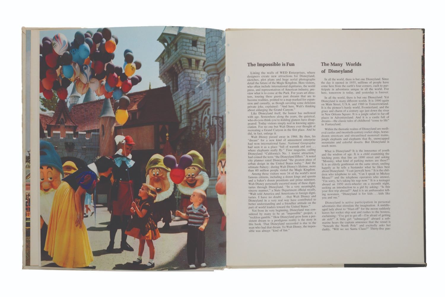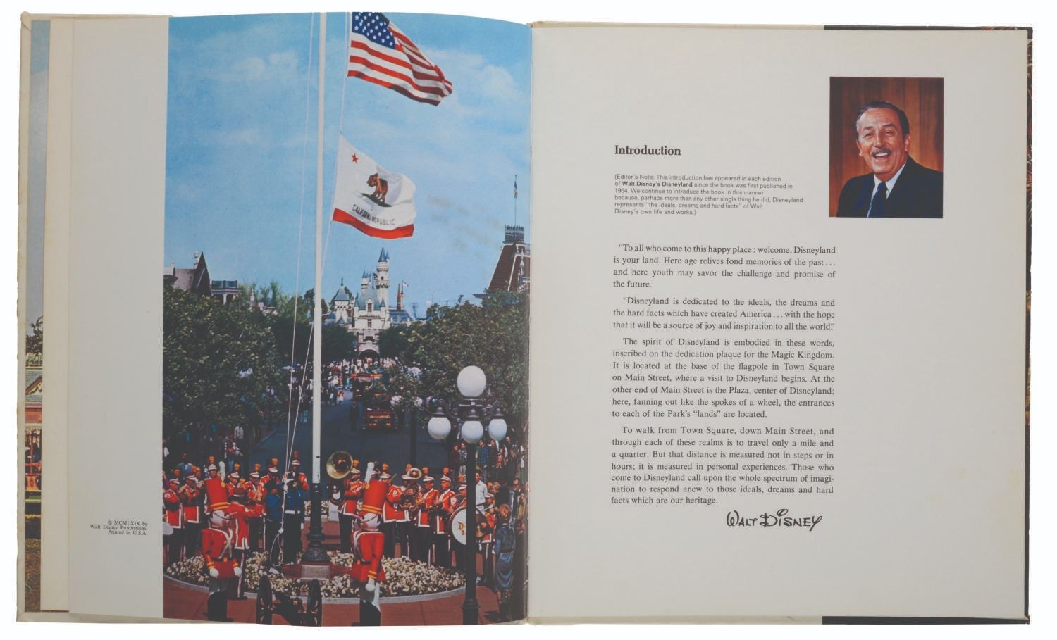 (Disneyland, 1969) A hardcover Walt Disney's Disneyland book signed by animators Rudy Zamora, Frank A. Smith, Bill Melendez, and composer Paul J. Smith. Marty Sklar's 1969 book details Disneyland's first decade and the vibrant 1960s renaissance. This era saw the introduction of New Tomorrowland, Walt Disney’s Enchanted Tiki Room, the Haunted Mansion, Pirates of the Caribbean, and a humorous Jungle Cruise rewrite, along with highlights from the 1964-65 New York World's Fair, including Great Moments with Mr. Lincoln, It's a Small World, and the Carousel of Progress. Measuring 9.5" x 11.25", the book is in good condition with moderate shelf wear, soiling, edge wear, and discoloration.