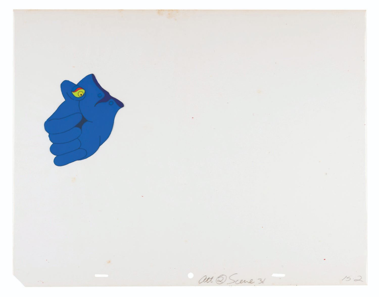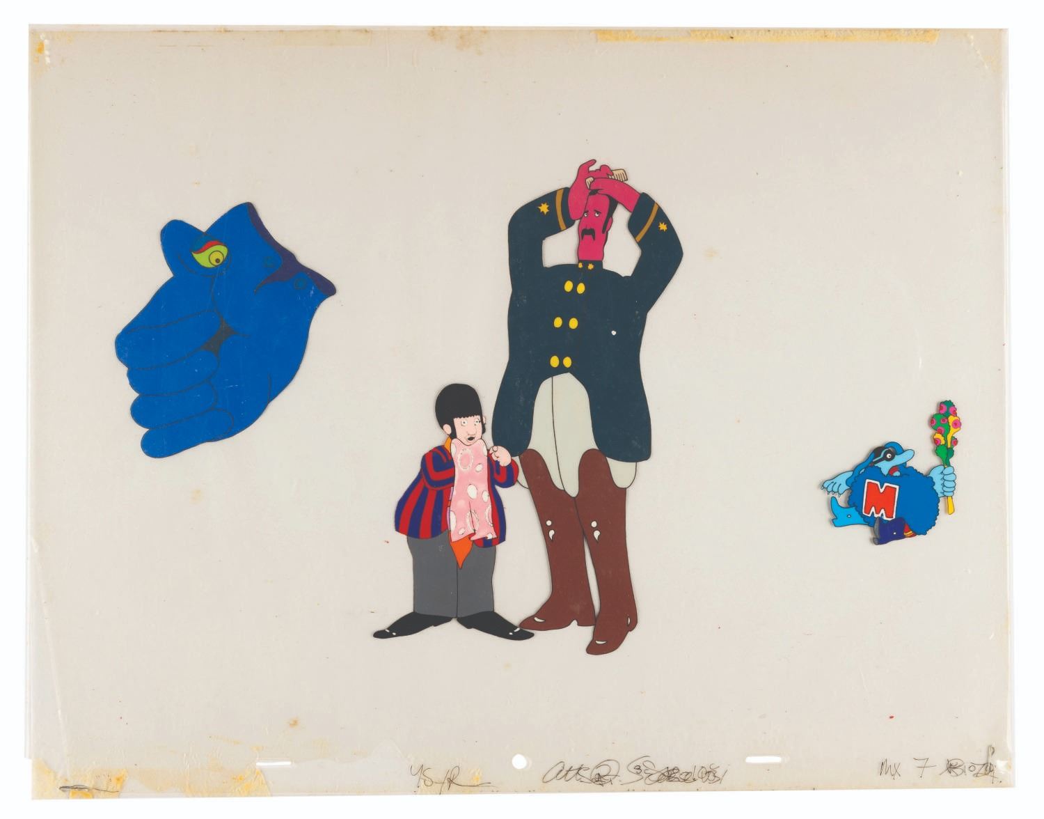 (United Artists, 1968) An original multi-layer hand-painted production cel of the Dreadful Flying Glove, Old Fred, Ringo Starr, and the Chief Blue Meanie from "Yellow Submarine.” With an image size of 8” x 14” on 12.5” x 16” cels, the piece displays in good condition with scratches, discoloration from age, tears, and stains which do not affect the image.