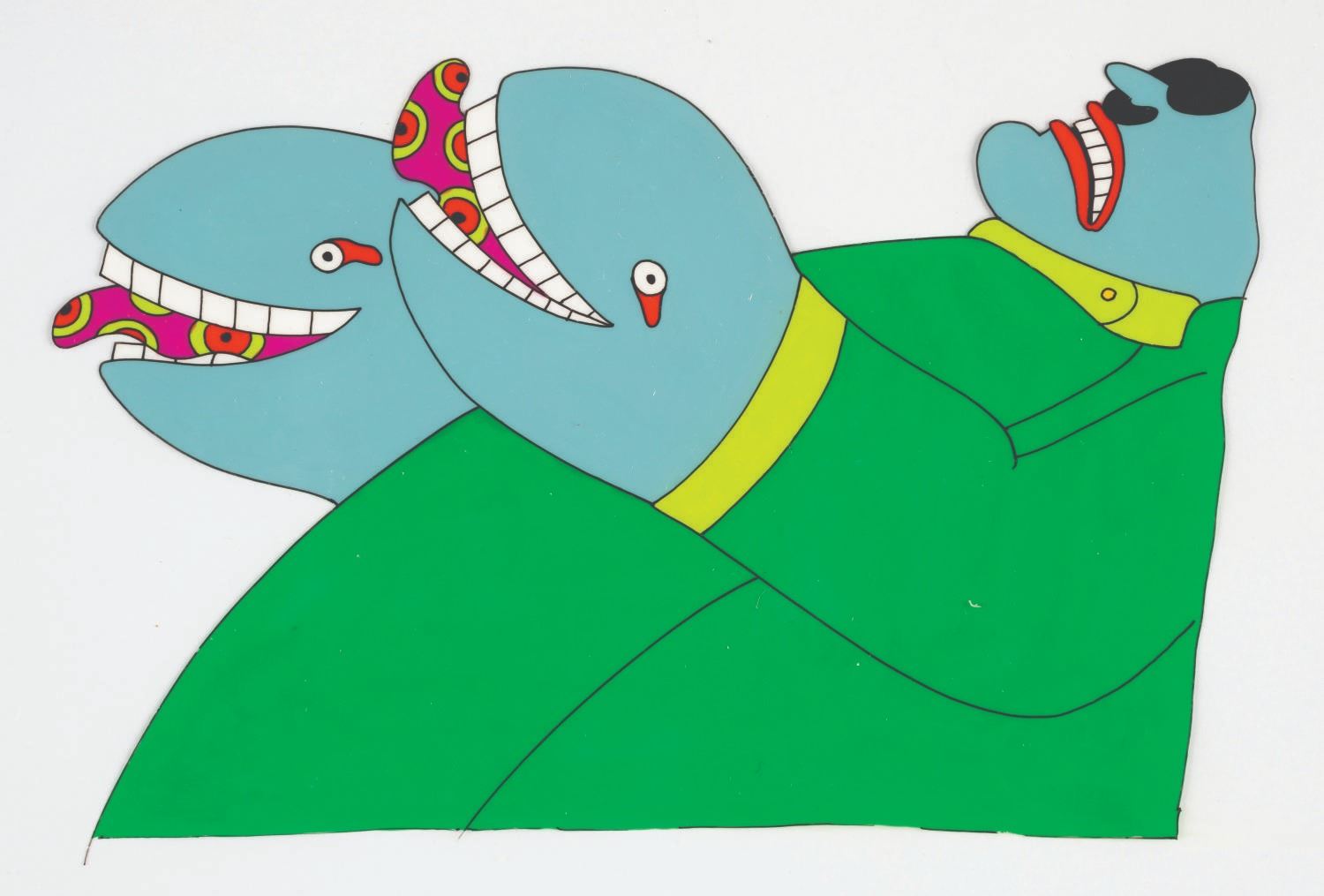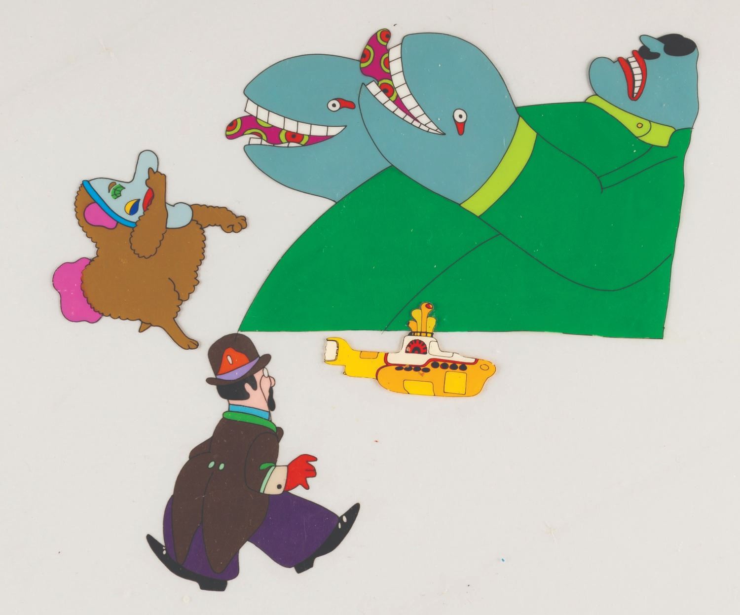 (United Artists, 1968) An original hand-painted production cel of Jeremy Hiller Boob Ph.D., the unnamed morning suit man, and a monster from "Yellow Submarine.” Measuring 12.5” x 16” with character image sizes ranging from 1” x 2” to 4” x 5.75”, the multi-layer cel displays in good condition with pinholes in the corners, adhesive residue along the edges, spots of paint loss to the submarine, heavy creasing, paint residue from contact with other cels, and a 1” x 1.5” tear to the bottom cel layer which does not affect the image.