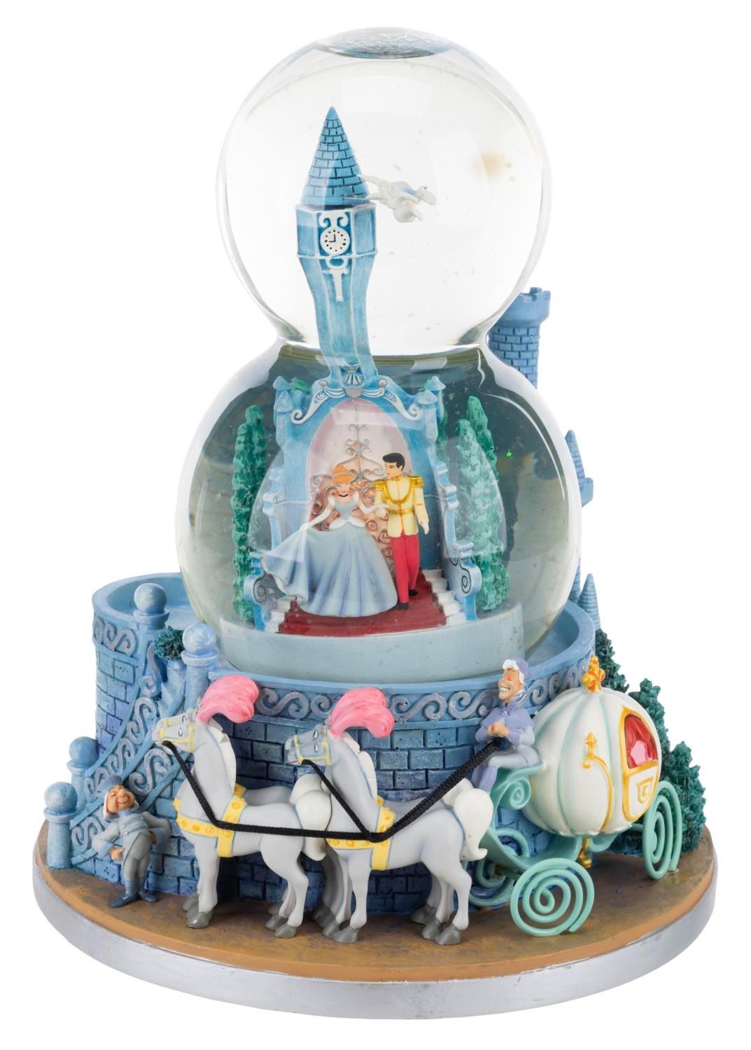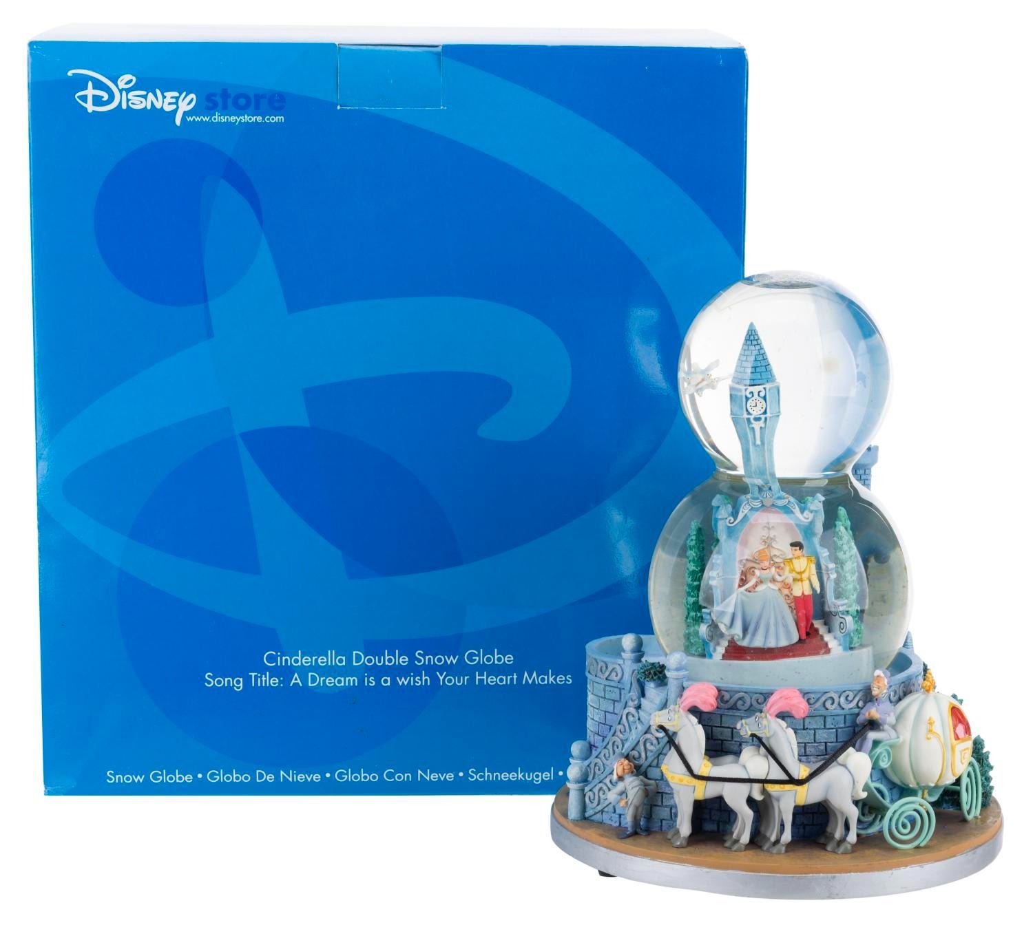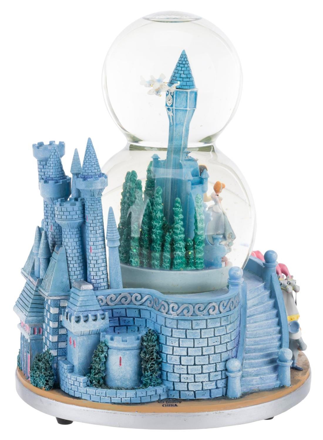 (The Disney Store, 1990s-2000s) A musical "Cinderella" double snow globe. When wound, the snow globe plays "A Dream is a Wish Your Heart Makes," while birds fly around the clock tower. Measuring 6.75" x 6.75" x 9" tall, the globe is in very good condition overall with light discoloration and soiling to the water.