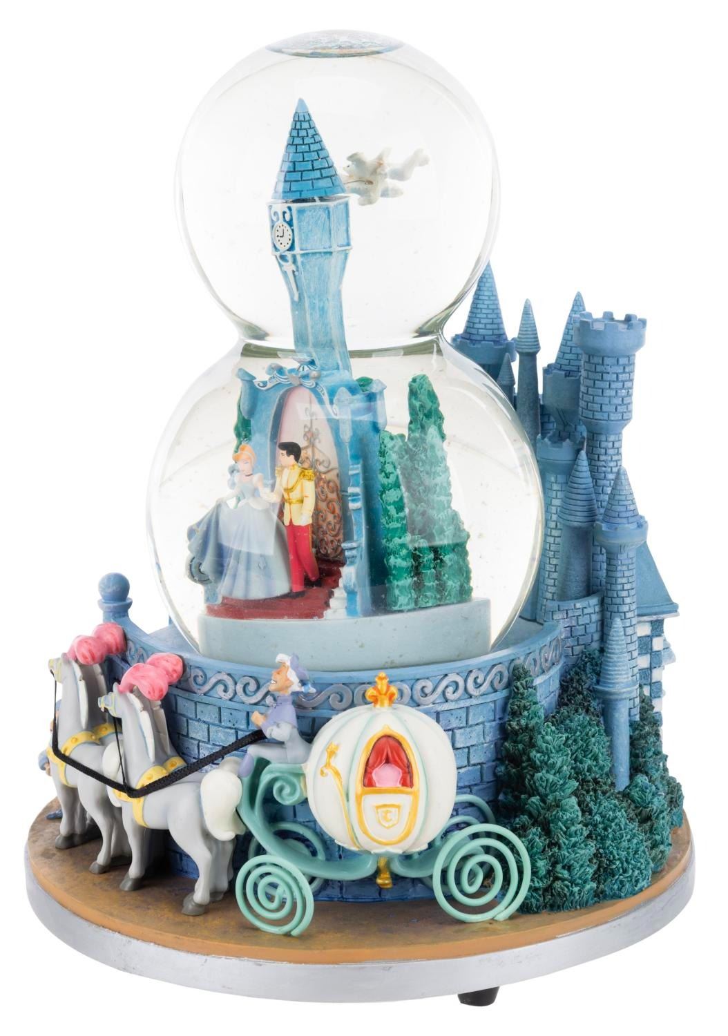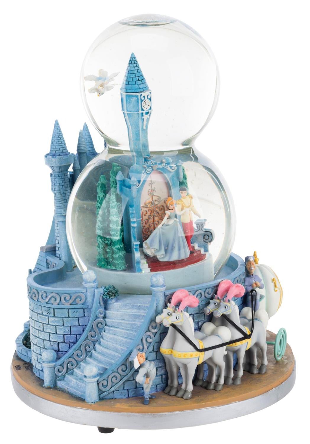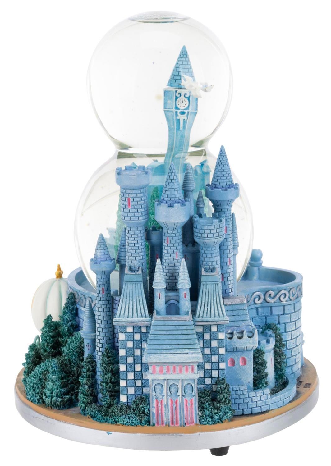 (The Disney Store, 1990s-2000s) A musical "Cinderella" double snow globe. When wound, the snow globe plays "A Dream is a Wish Your Heart Makes," while birds fly around the clock tower. Measuring 6.75" x 6.75" x 9" tall, the globe is in very good condition overall with light discoloration and soiling to the water.