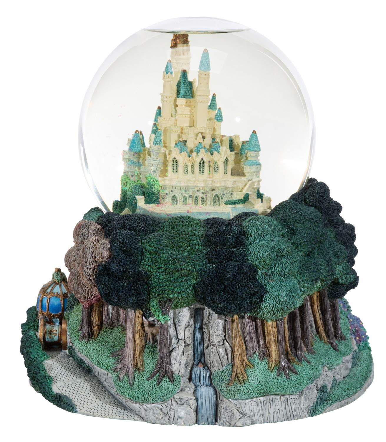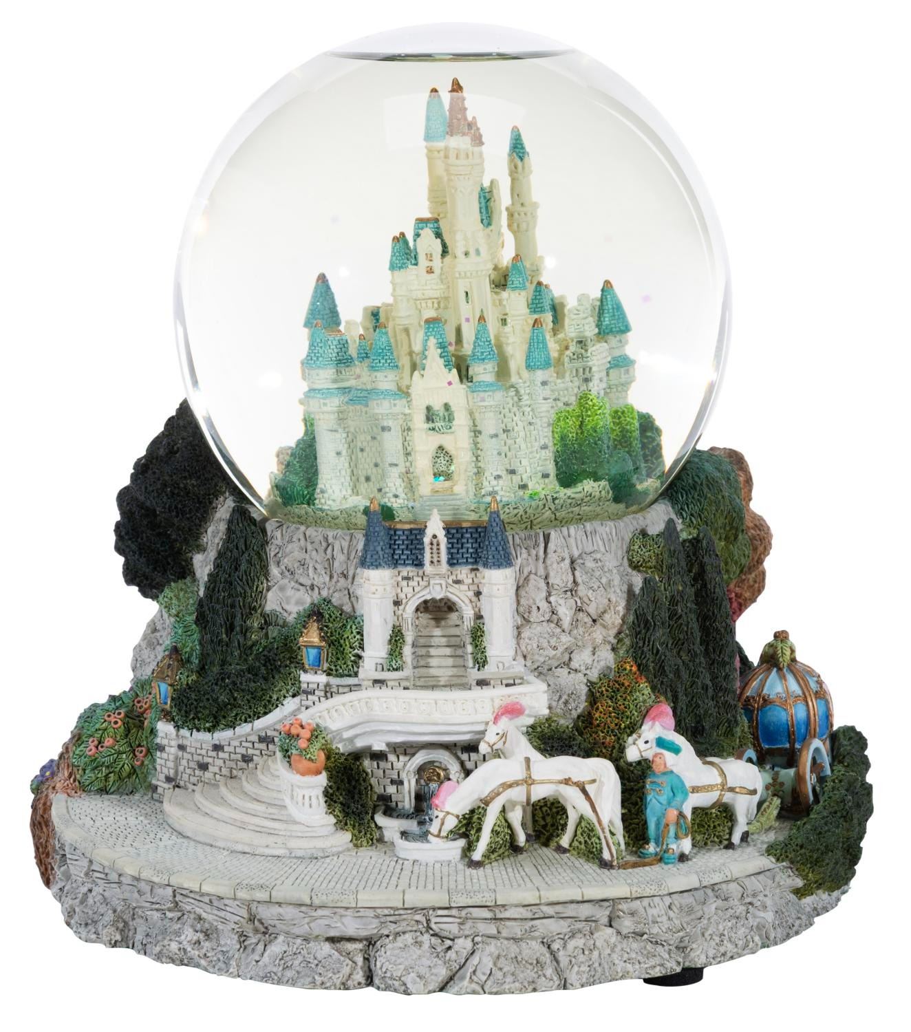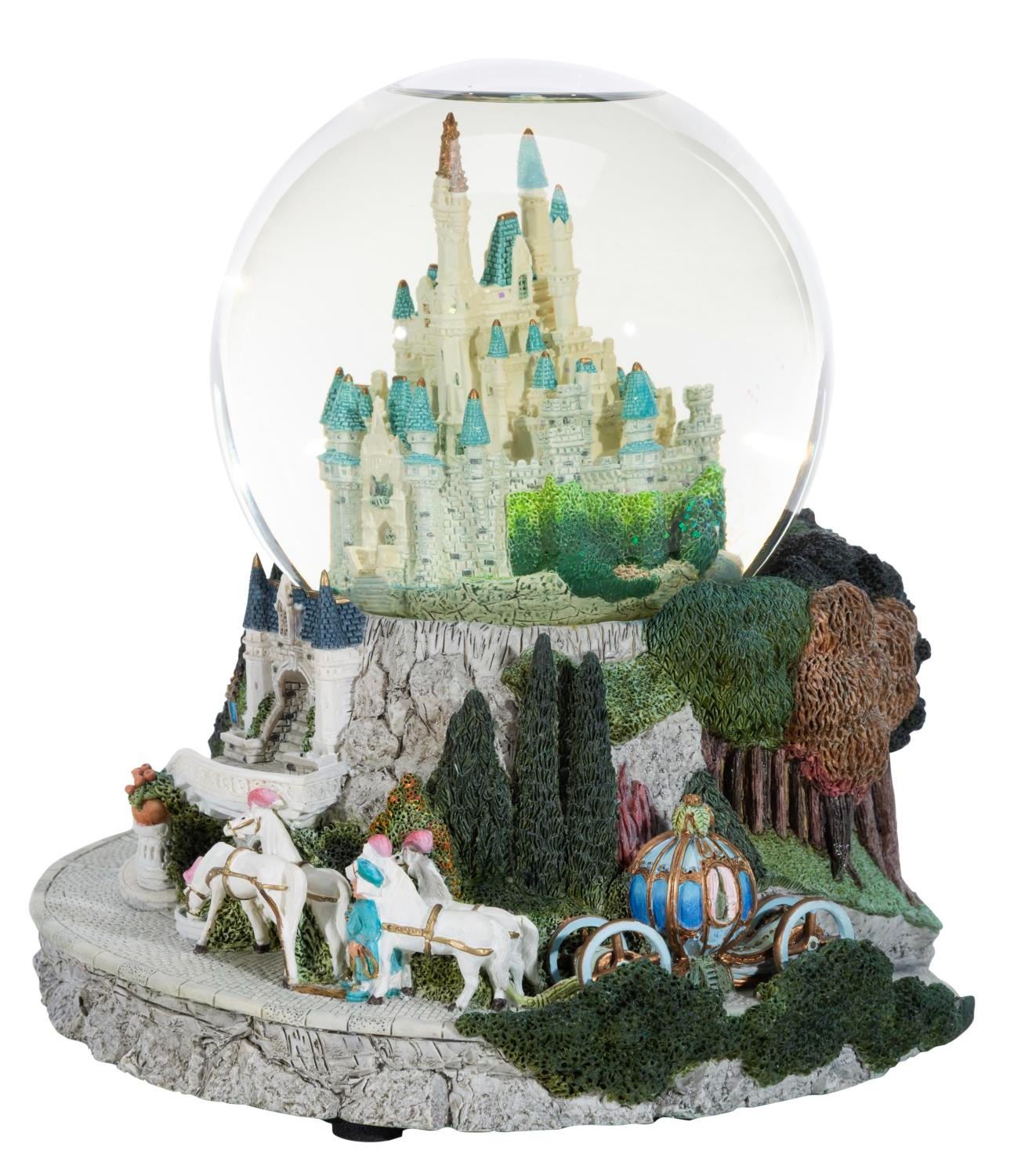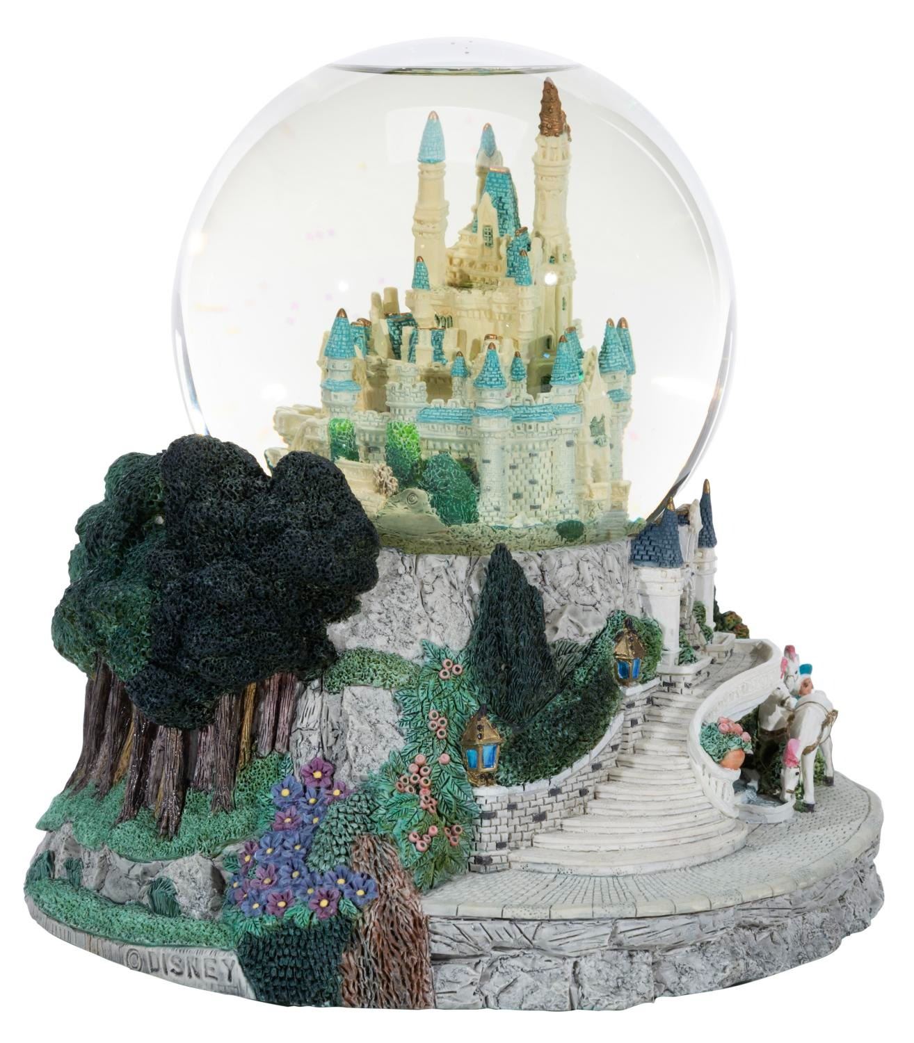 (Fraser Creations, 1990s) A musical snow globe featuring Disney’s Cinderella Castle. When wound, the snow globe plays "So’ This is Love" from the animated film. Measuring 7" x 7" x 7" tall, the globe is in very good condition overall with light discoloration to the water.