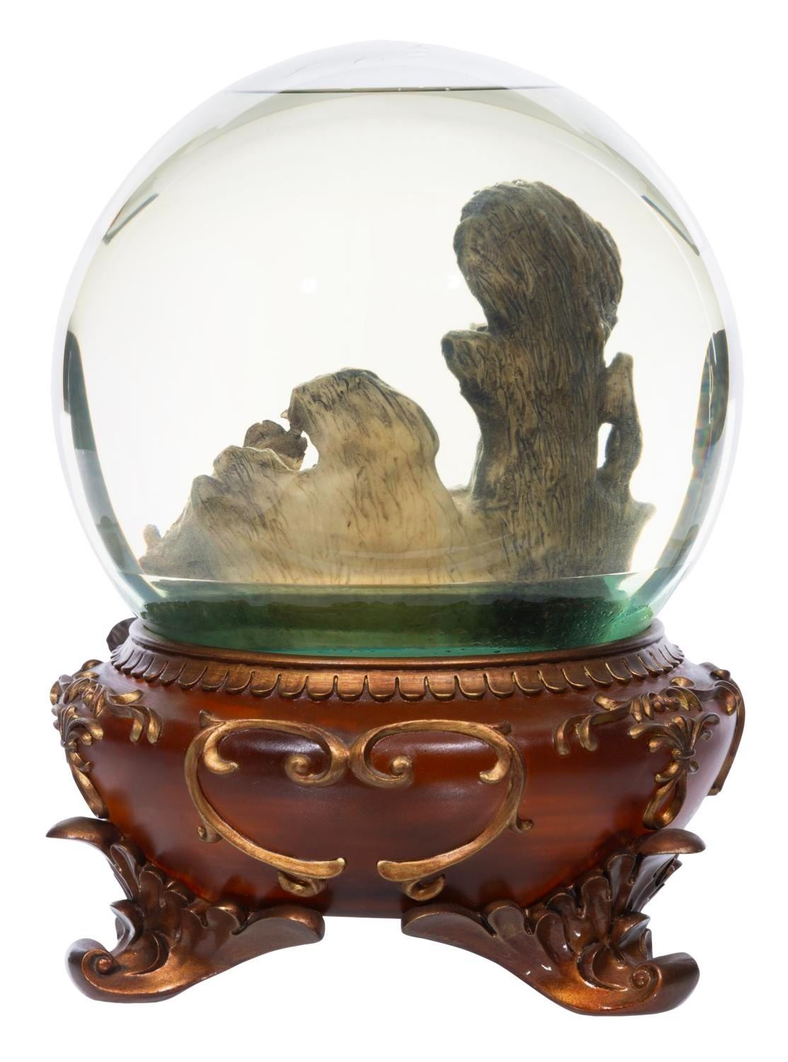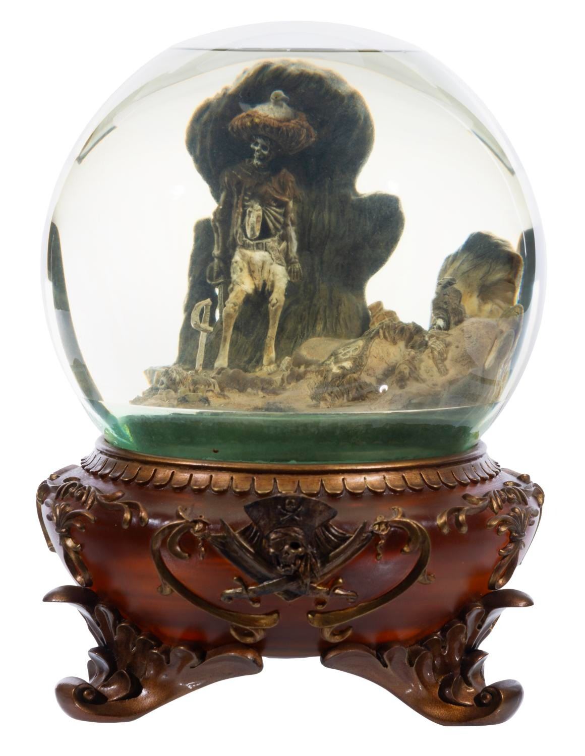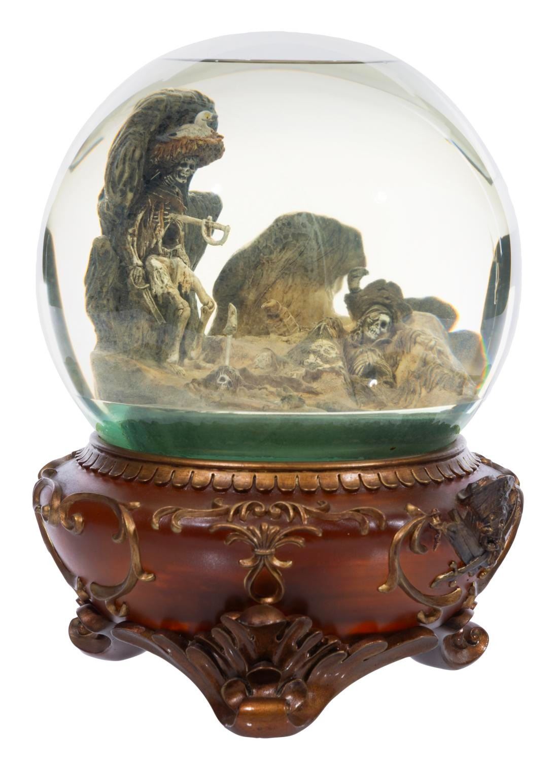 (Disney, 2000s) A Pirates of the Caribbean snow globe depicting the Pirate Grotto with skeletons, with a musical feature that plays "Yo Ho (A Pirate's Life for Me)." Measuring 8.25" tall and 6" in diameter, this piece is in good working condition with a faint discoloration to the water from age.