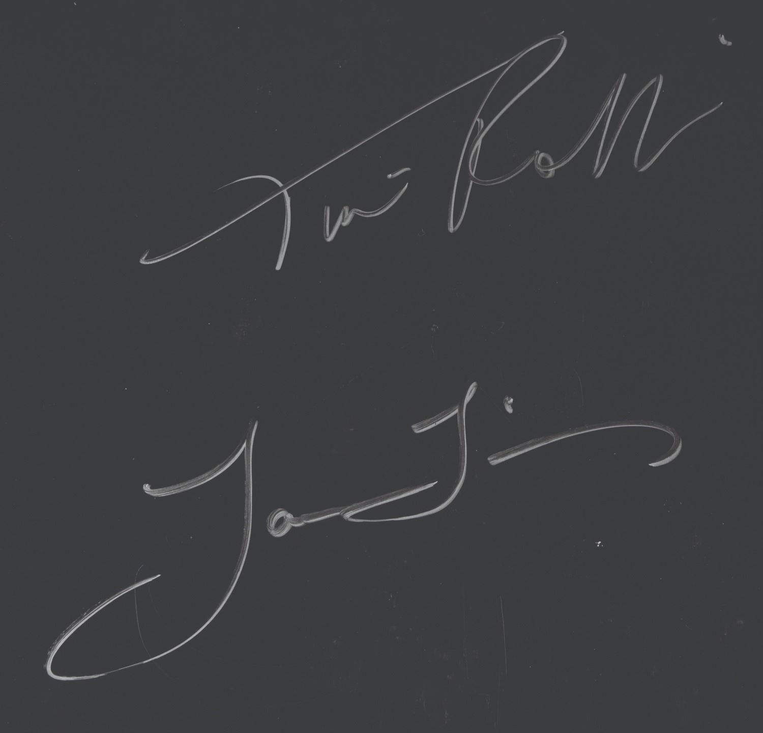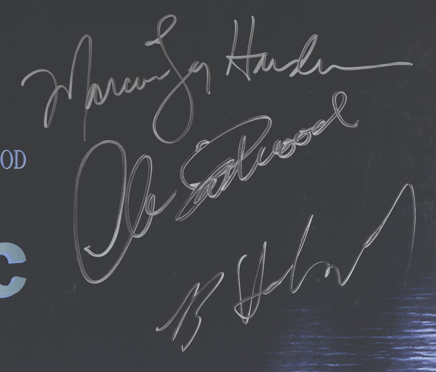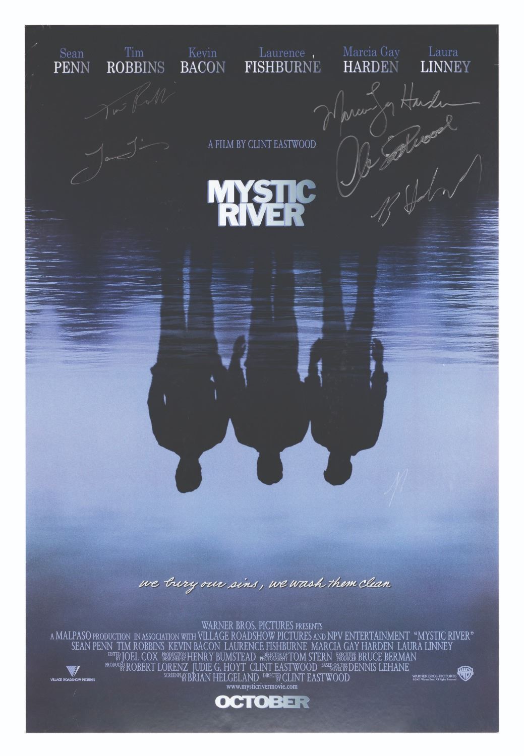 (Warner Bros., 2003) A poster for “Mystic River,” signed by director Clint Eastwood, writer Brian Helgeland, and stars Tim Robbins, Marcia Gay Harden, Laura Linney. Measuring 27” x 40”, the gator board-mounted poster displays in good condition with scratches, creases, light stains, wear, and several 0.25” tears at the top left corner.