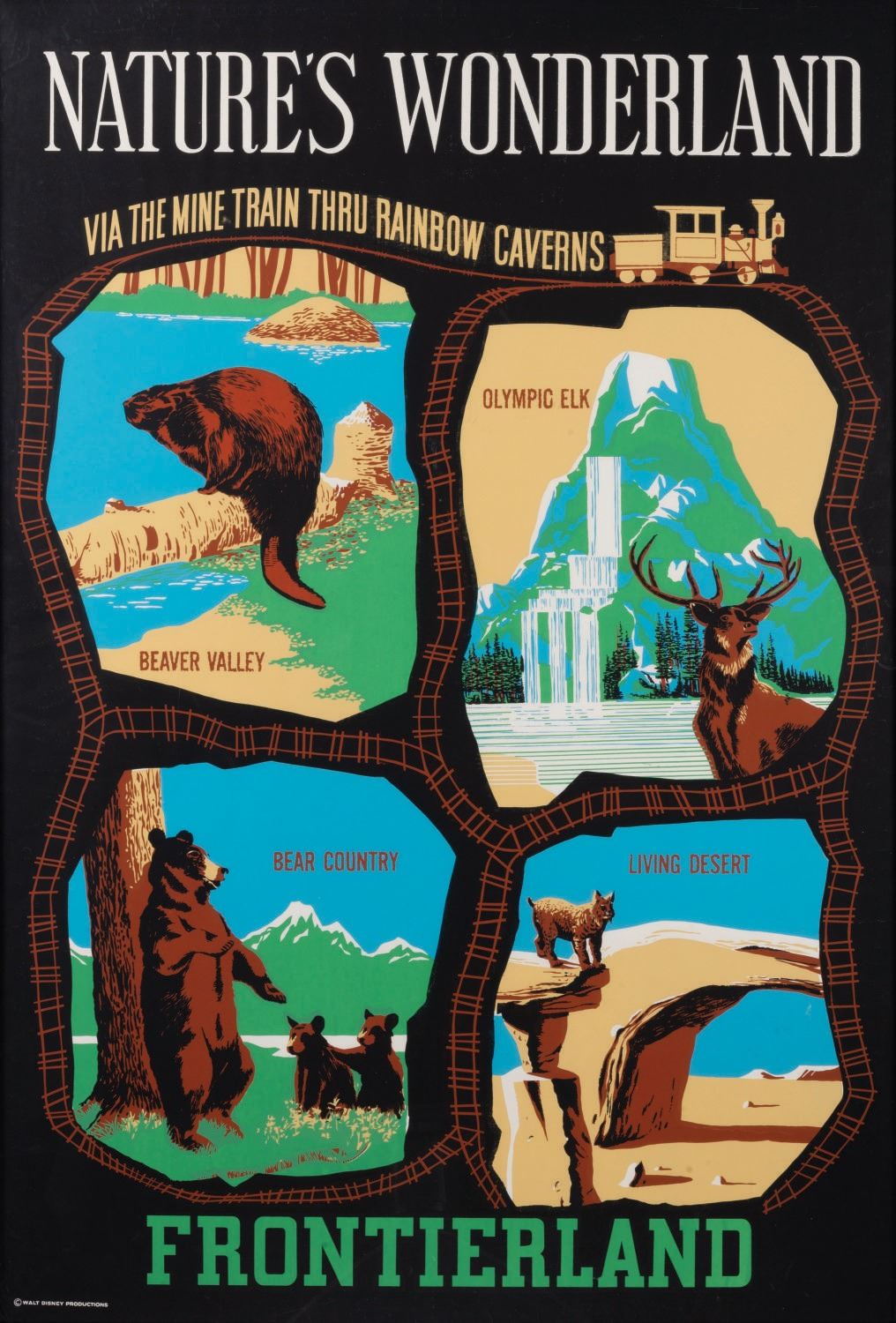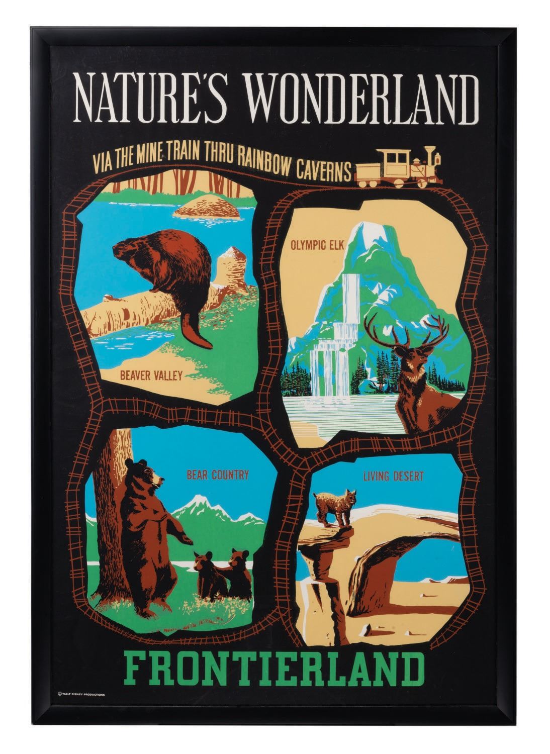 (Disneyland, 1960) An original hand-silkscreened attraction poster for Nature's Wonderland via the Mine Train in Frontierland. This poster depicts areas inspired by Walt Disney's True Life Adventures like Beaver Valley, Olympic Elk, Bear Country, and the Living Desert. Measuring 36"x54", the poster is in very good condition with light edge wear, and a few light creases and scuffs.