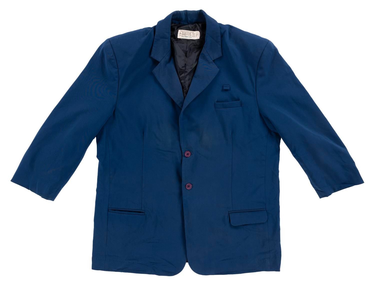 (Disney Parks, 2000s) A Cast Member uniform blazer, similar to those worn by Guest Relations hosts at Epcot. Labeled a Male size 46R, the blazer is good condition with discoloration from age and wear from Park use.