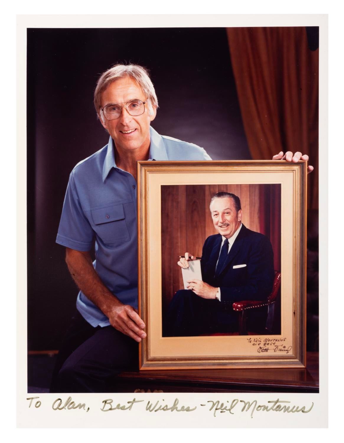(Montanus, 1980s) A signed photograph of photographer Neil Montanus posing with his 1961 Official Portrait of Walt Disney. Montanus signed the photograph in ink with a dedication to Alan Hylton. With an image of 8" x 10" on 8.5" x 11.5" photo paper, the signed print is in very good condition with light wear from age.