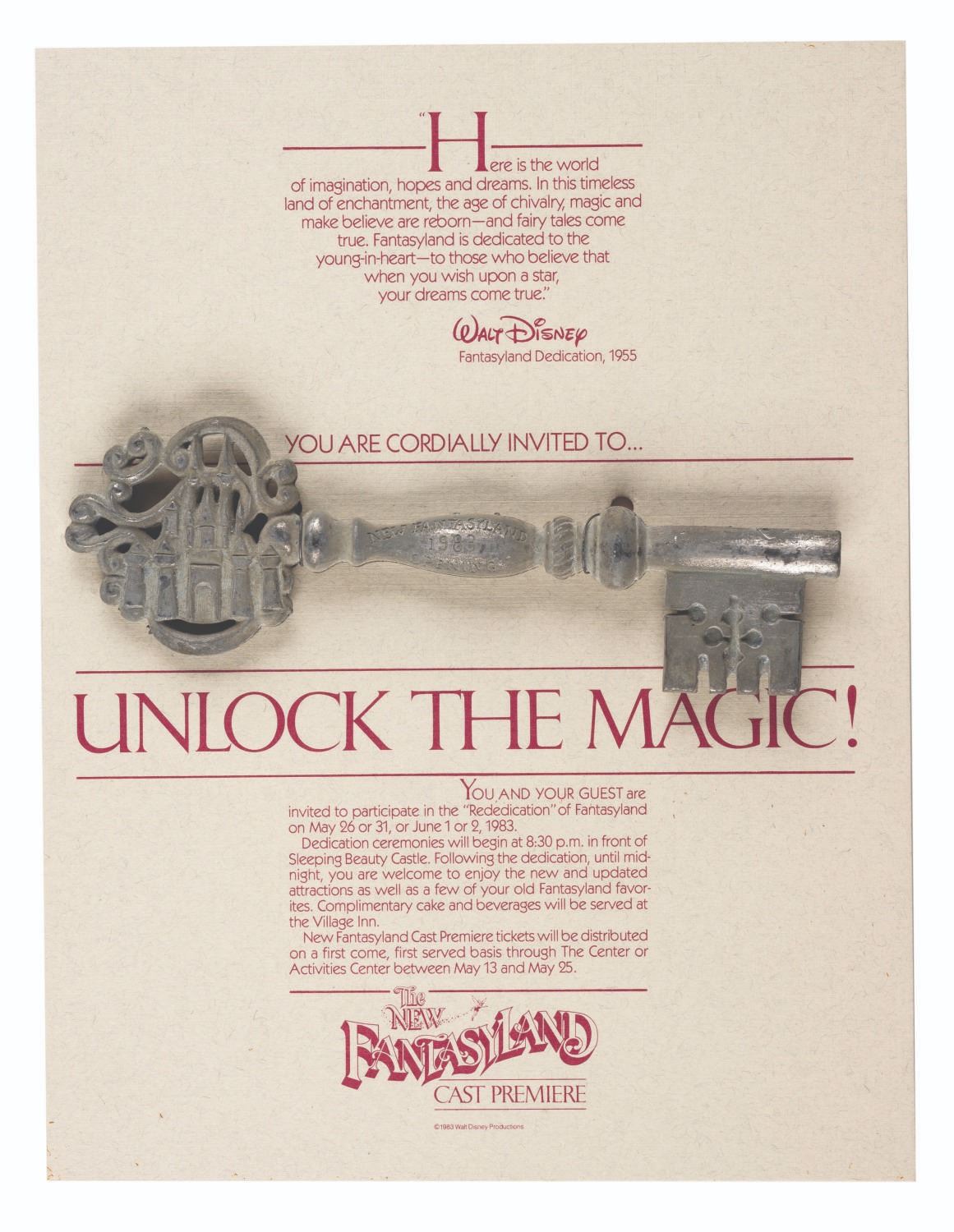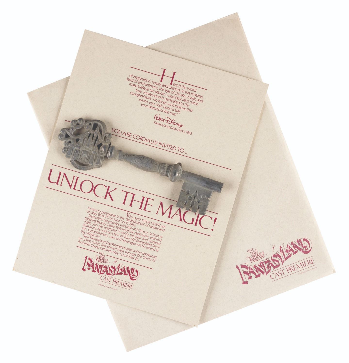 (Disneyland, 1983) A resin engraved key and invitation to the Cast Member premiere of New Fantasyland. The key, featuring a Sleeping Beauty Castle design, is still attached to the invitation and comes in its original envelope. The key measures 6.5” long and the invitation measures 7.25” x 9.5”, both in fine condition.
