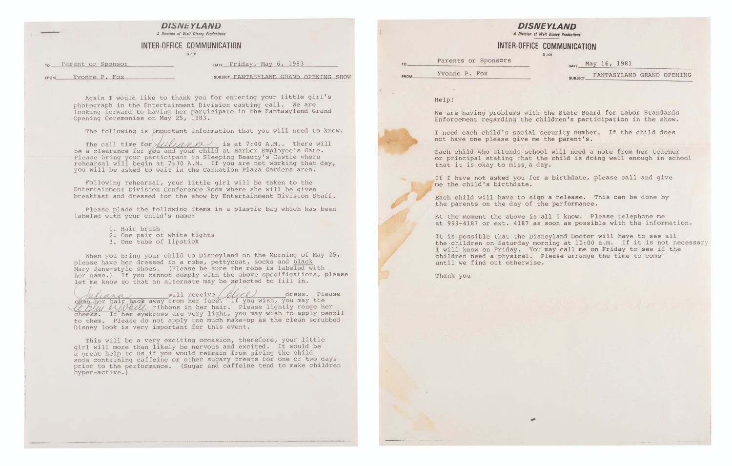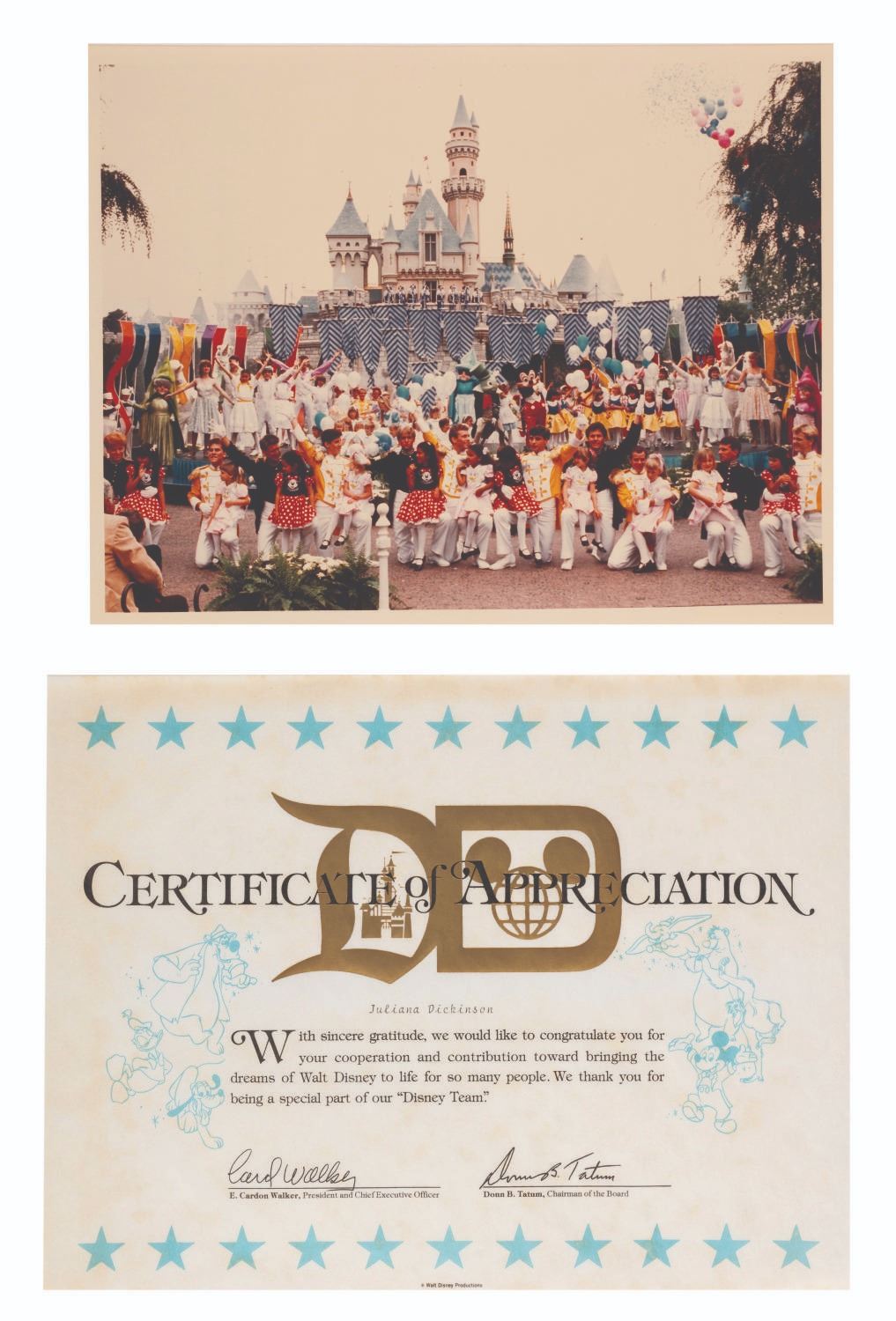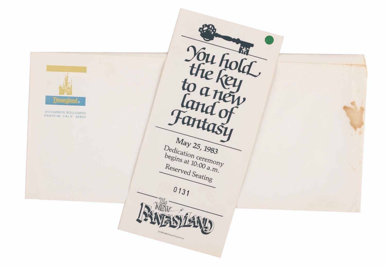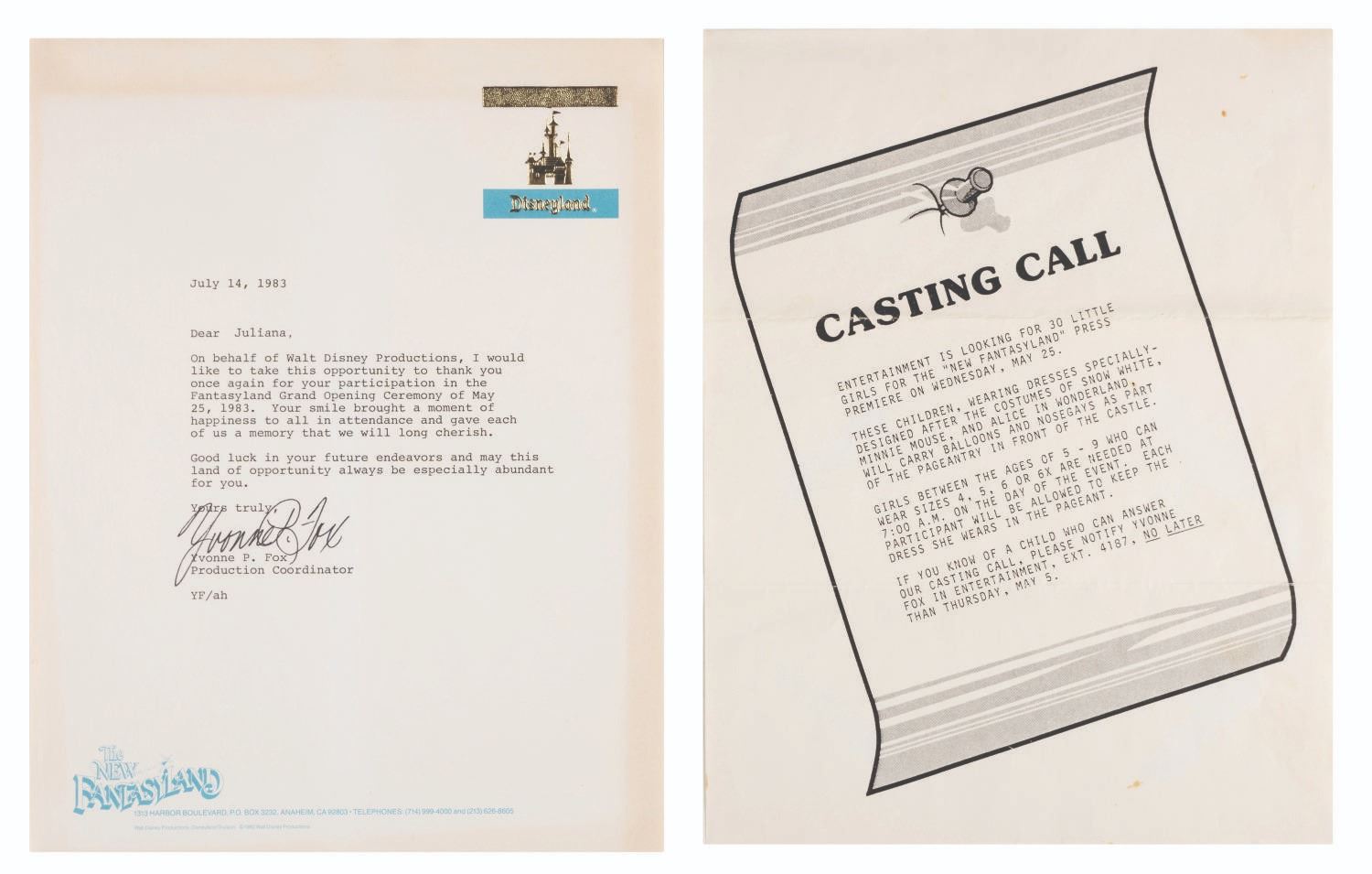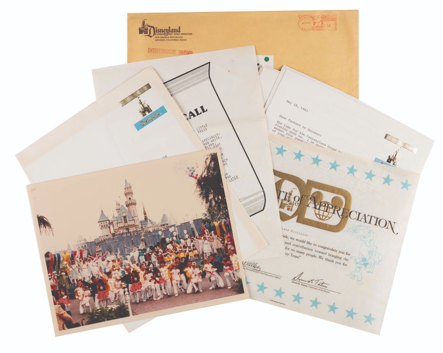 (Disneyland, 1983) A beautiful collection of New Fantasyland behind-the-scenes memorabilia including A casting call for the premiere with letters to parents and sponsors, an unused reserved seating ticket to the ceremonies, a color photo with thank you letter, and a certificate of appreciation. All are in good condition with stains and discoloration from age.