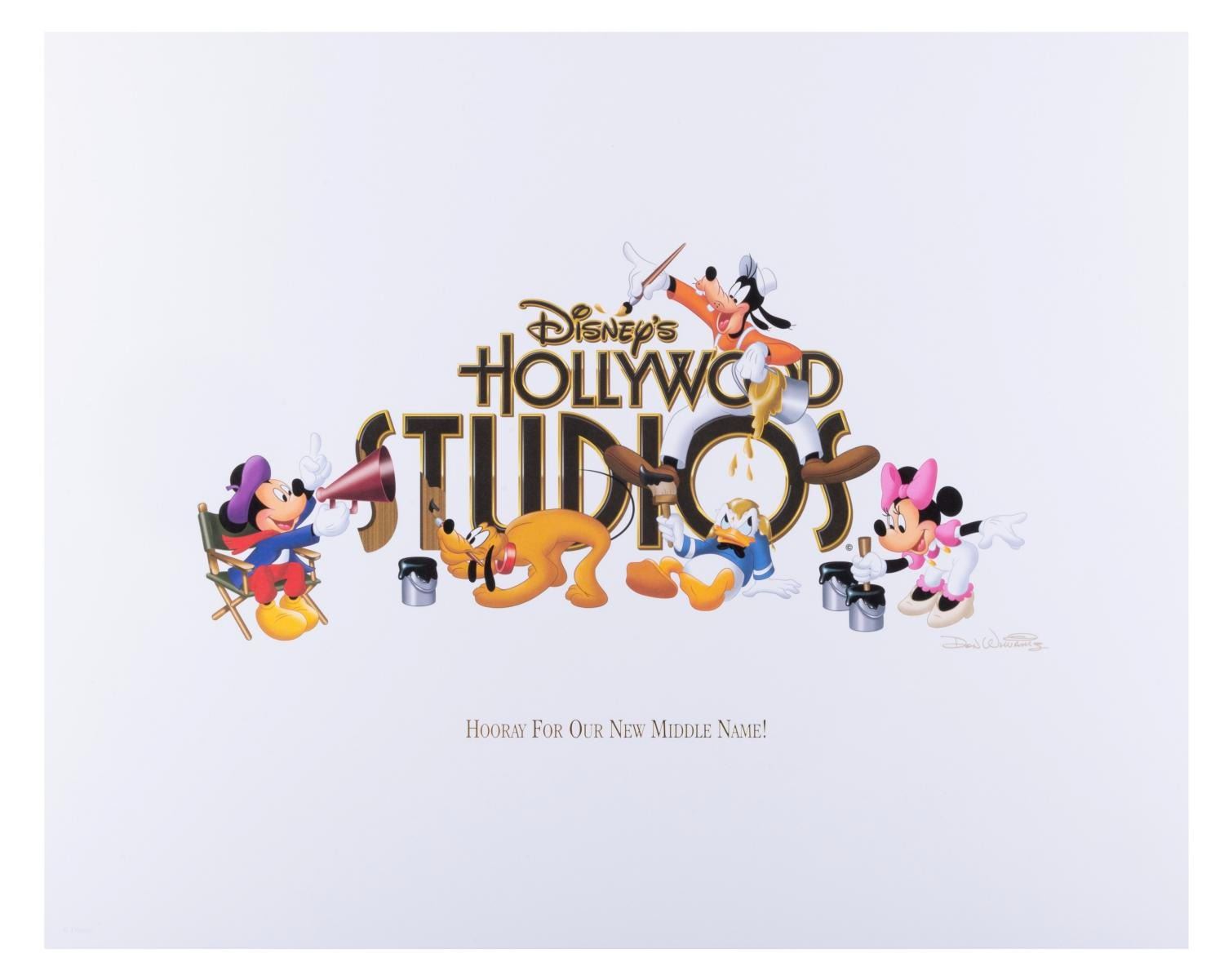 (Disney Hollywood Studios, 2008) A "Hooray For Our New Name" lithograph celebrating the change from "Disney-MGM Studios" to "Disney's Hollywood Studios" with art by Don "Ducky" Williams of Mickey and friends. Released in an unnumbered edition of 8,300 and 50 Artist's Proofs, the lithograph is in fine condition.