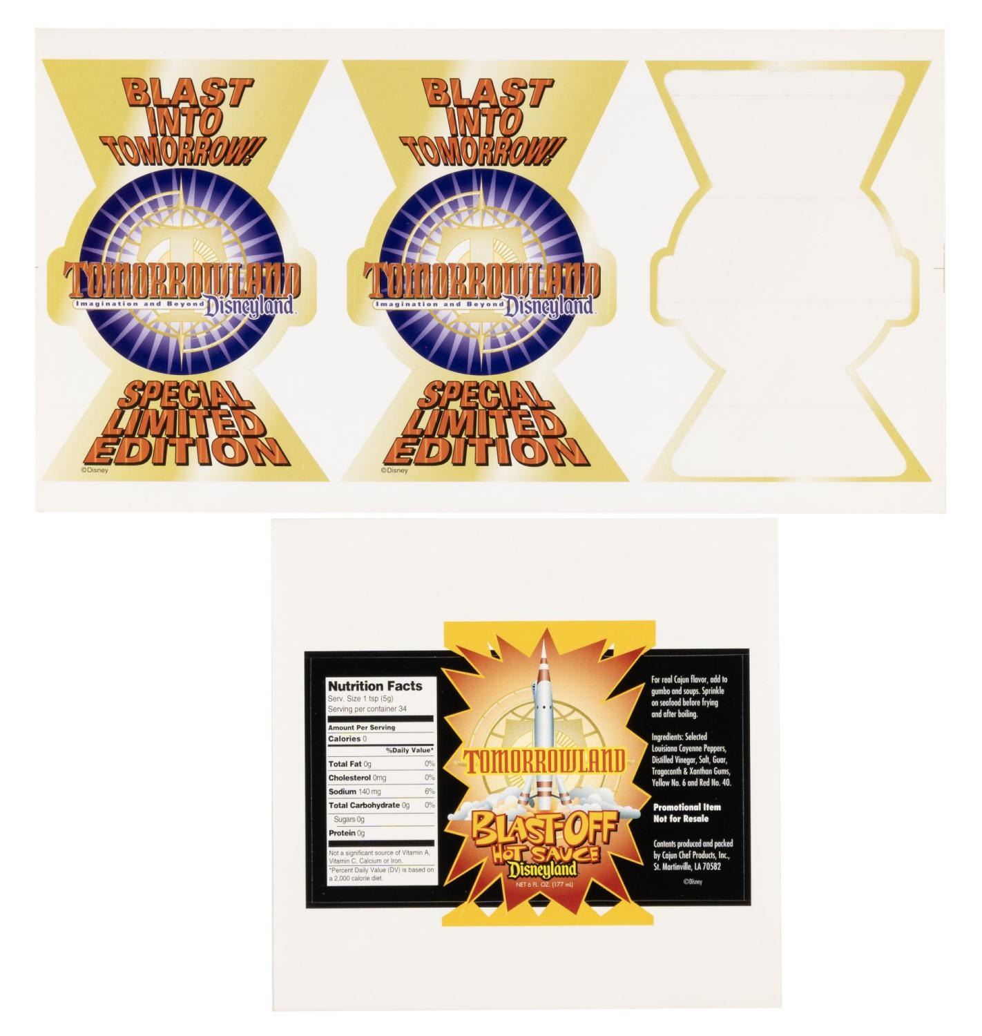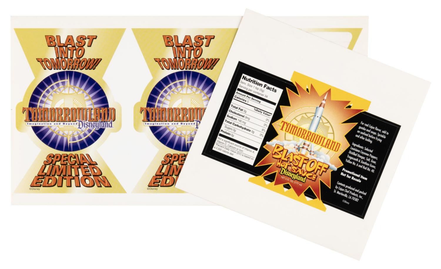 (Disneyland, 1998) A sheet of two limited edition stickers and a hot sauce label promoting New Tomorrowland’s launch. Ranging in size from 3.5" x 5.25" to 3.5" x 5.5", the stickers and label are in very good condition with light scratches and a third sticker missing.