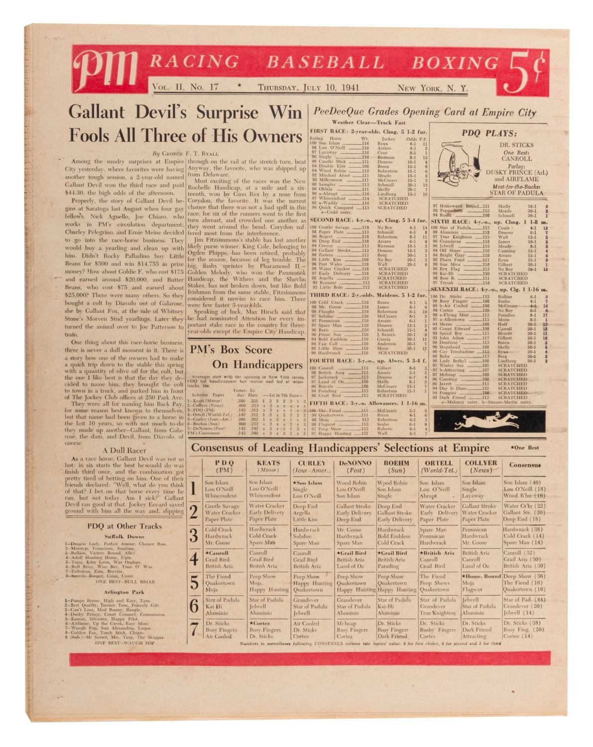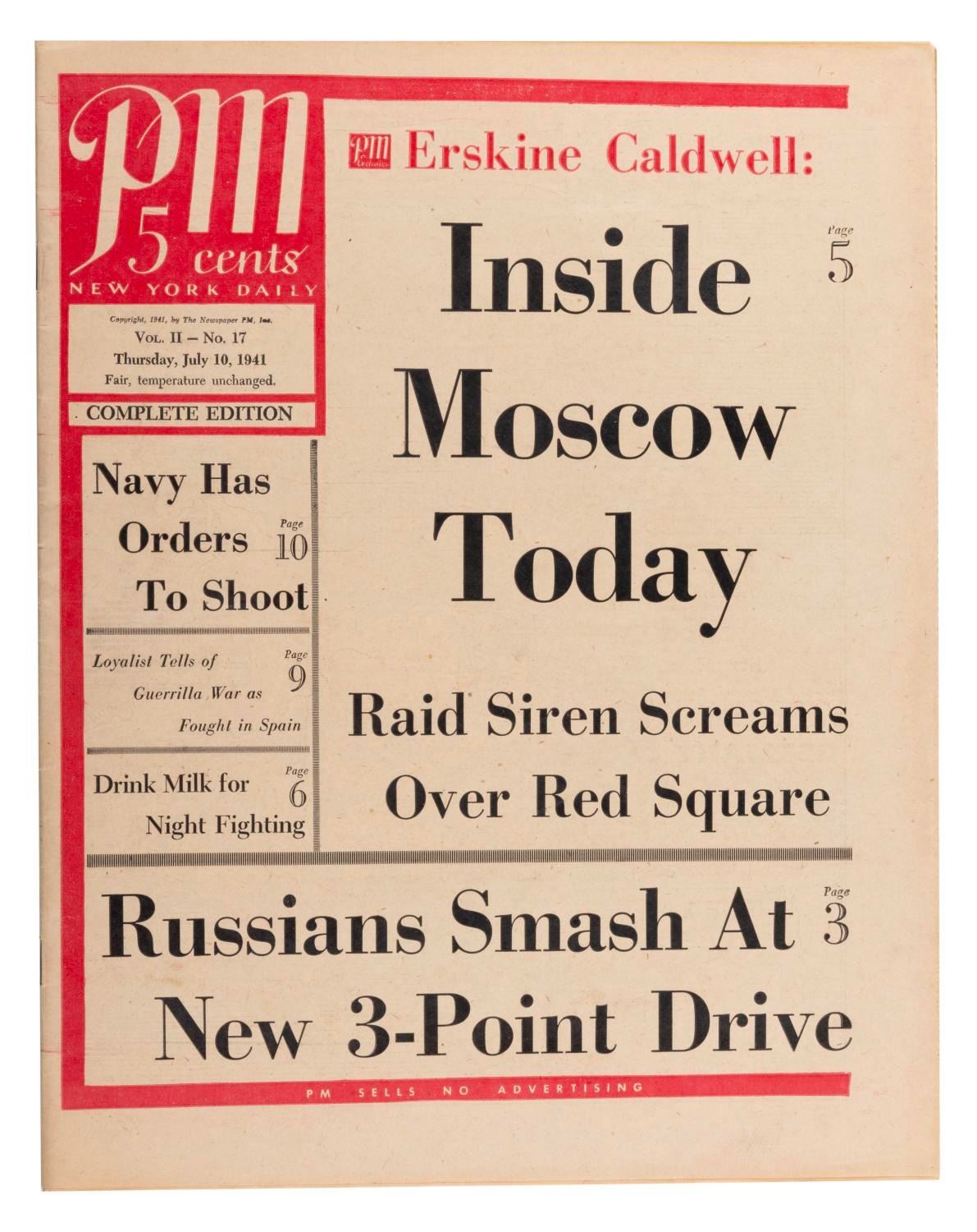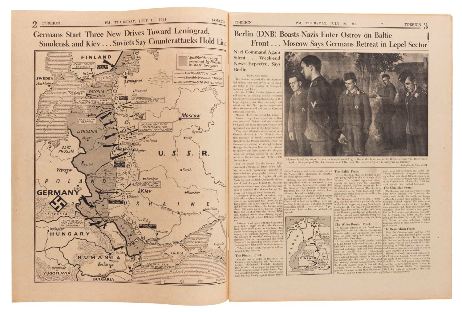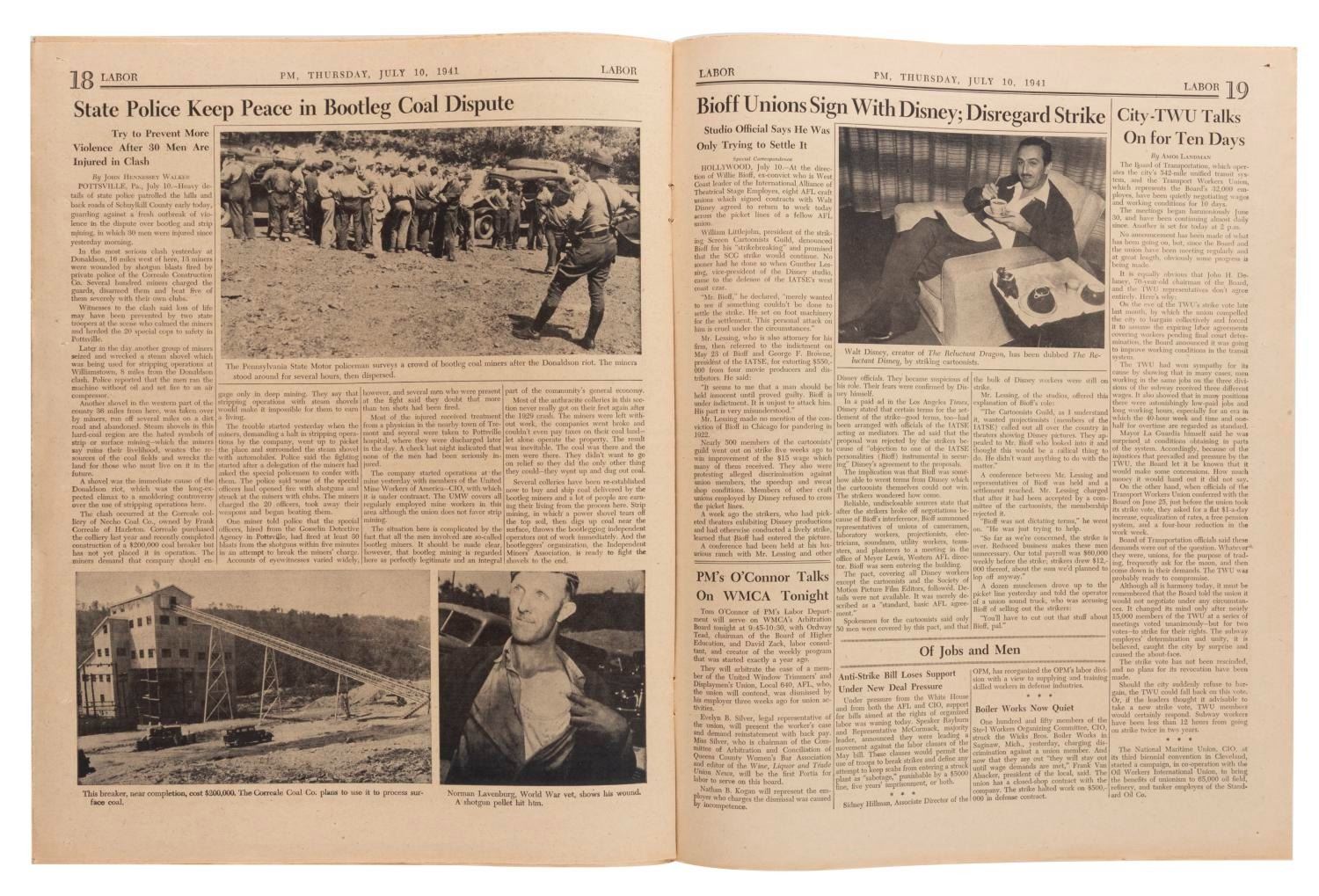 (New York Daily, 1941) The July 10, 1941, issue of the New York Daily, featuring an article about Walt Disney Studio cartoonists' strike. Measuring 11.5" x 14.5", the paper is in very good condition with light discoloration.