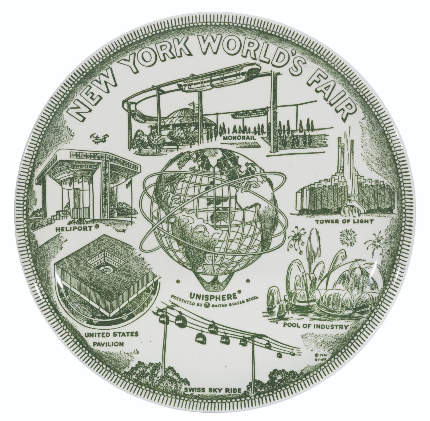 (World’s Fair, 1961) A souvenir 1964-65 New York World’s Fair decorative plate featuring illustrations of the Unisphere, Monorail, Heliport, Tower of Light, United States Pavilion, Swiss Sky Ride, and the Pool of Industry. Measuring 9.25” in diameter, the plate is in very good condition with light wear.