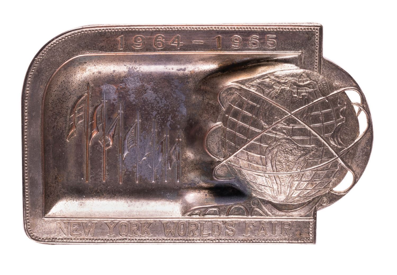 (World's Fair, 1964/1965) An original souvenir ashtray from the 1964/1965 New York World's Fair. The imagery features the Unisphere flanked by international flags. Measuring 5"x3.25", the metallic souvenir ashtray is in very good condition with light tarnishing and oxidation.
