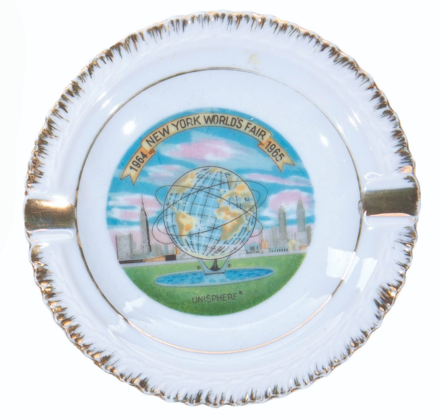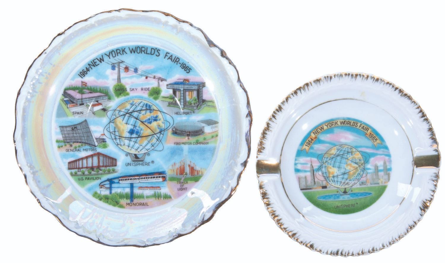 (World's Fair, 1964-65) A souvenir ashtray and plate from the New York World's Fair. The 6" plate with iridescent edge highlights many attractions of the Fair, and the 5" ashtray features the Unisphere. Both pieces are in very good condition with light wear.