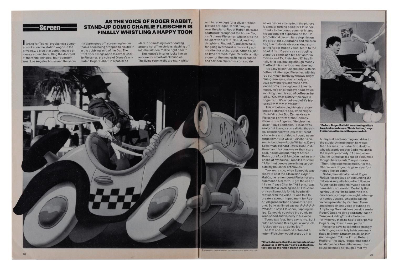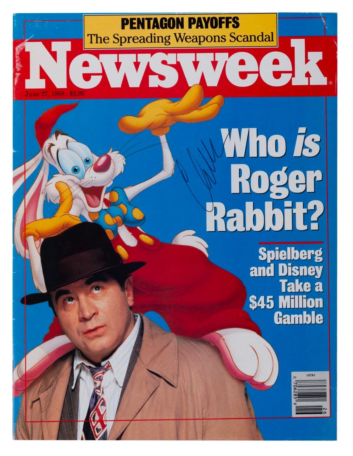 (Newsweek, 1988) A Newsweek magazine with a cover story on "Who Framed Roger Rabbit" signed by Charles Fleischer, the voice of Roger himself. Measuring 8" x 10", the magazine is in good condition with handling wear to the cover, including small scuffs to the title banner.