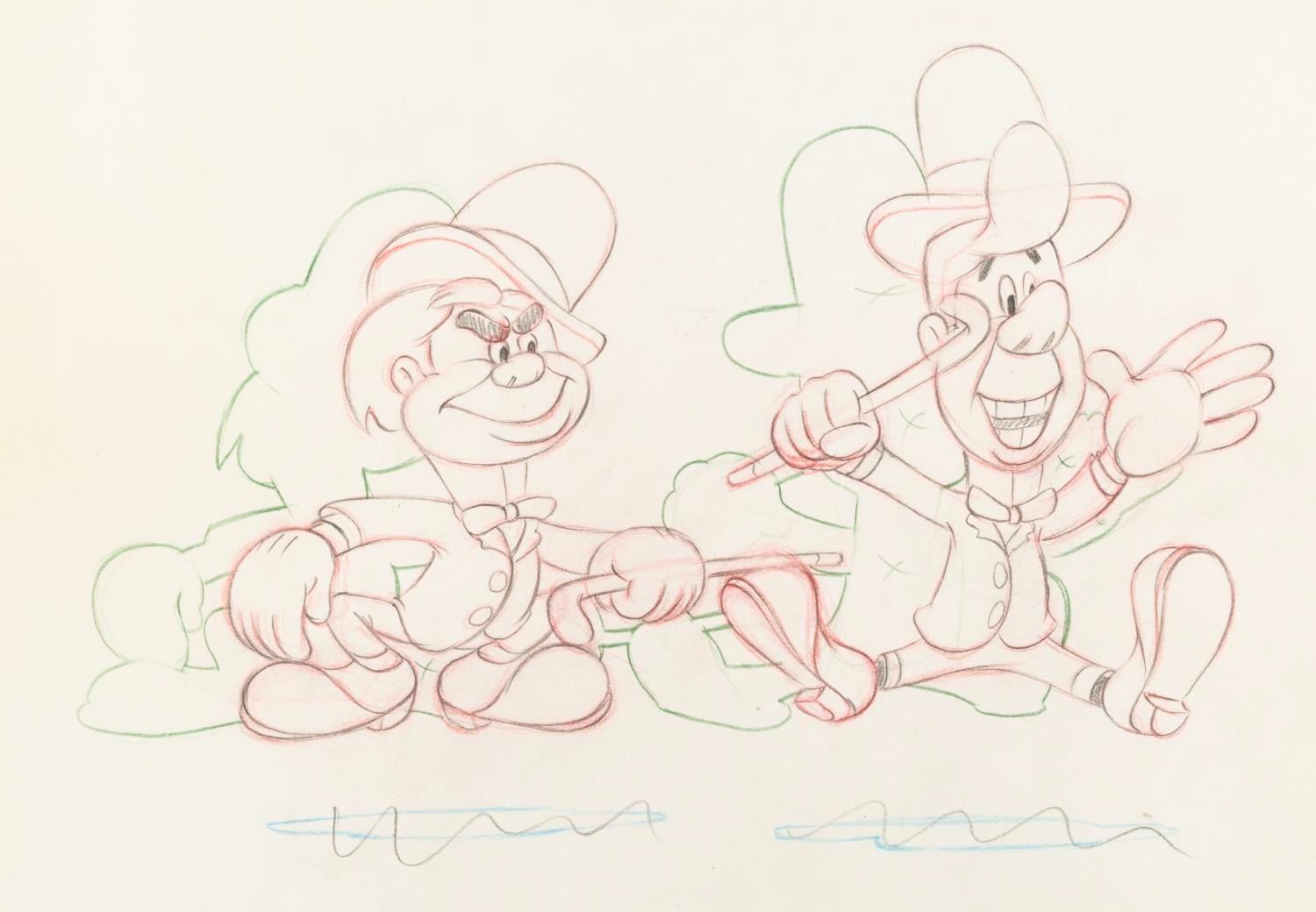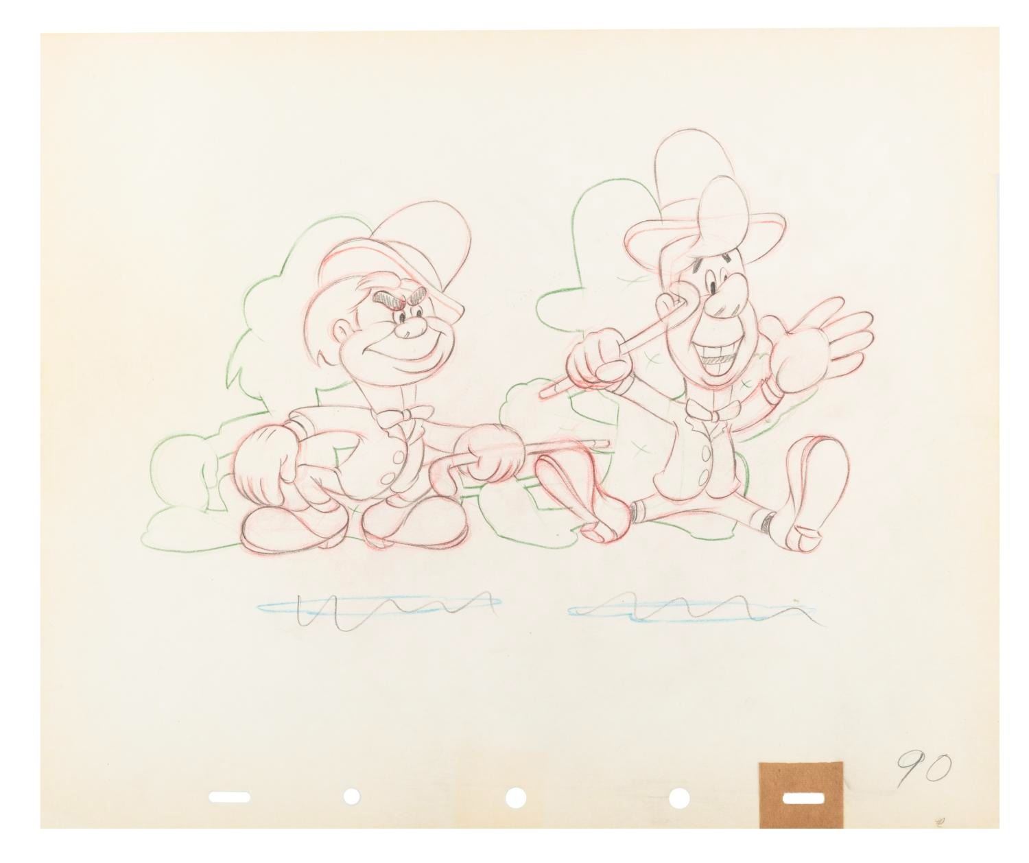 (Disney, 1941) An original production drawing featuring caricatures of Disney Legends Fred Moore and Ward Kimball from the animated short “Nifty Nineties.” With an image size of 9” x 6.25” on 10” x 12” animation paper, the drawing is in very good condition with light wear from handling and color shift to the paper from age.