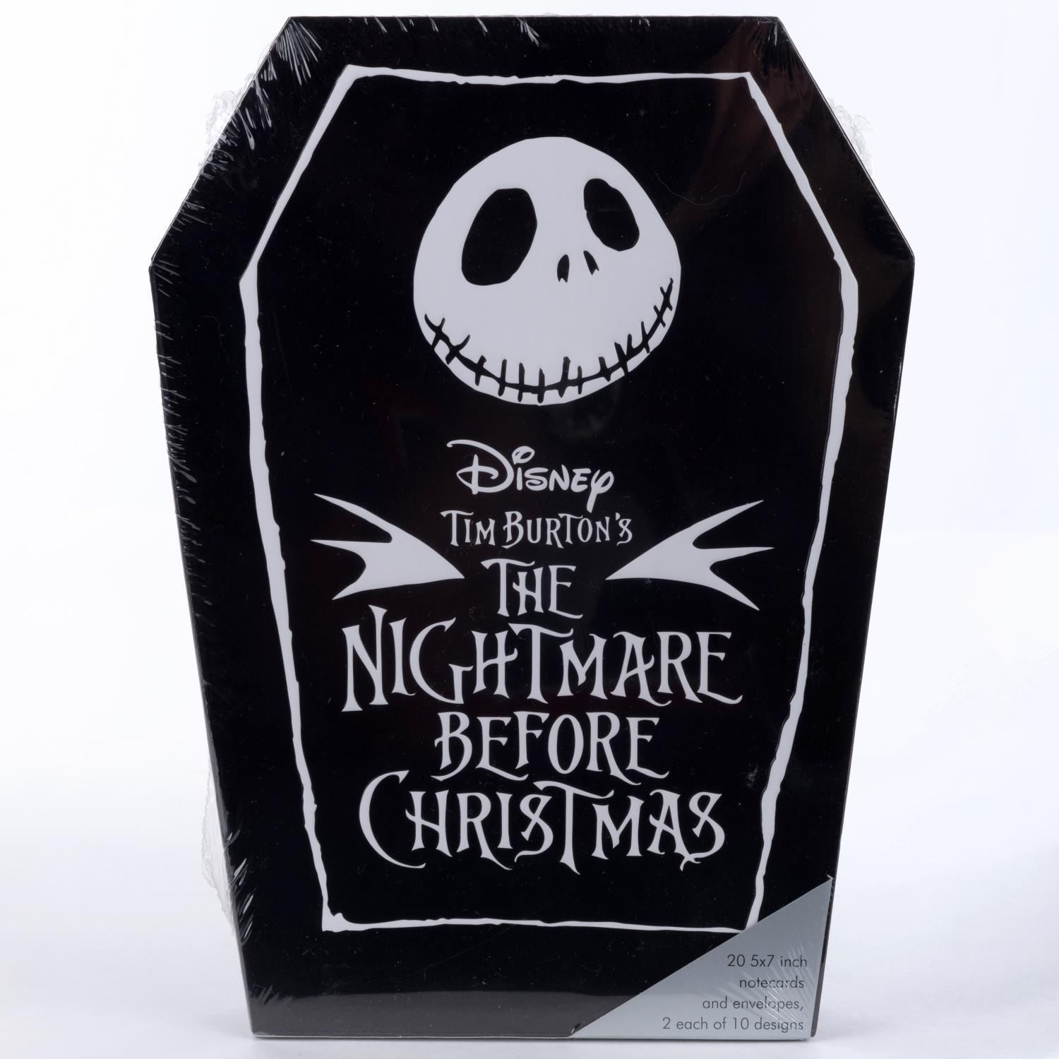 (Enesco, 2018) A 20th anniversary Nightmare Before Christmas notecard set. In a coffin-shaped box, the set includes 20 5” x 7” notecards featuring 10 different Jack Skellington puppet heads.. The set also includes envelopes and seals, and is in as new condition sealed in the original box.