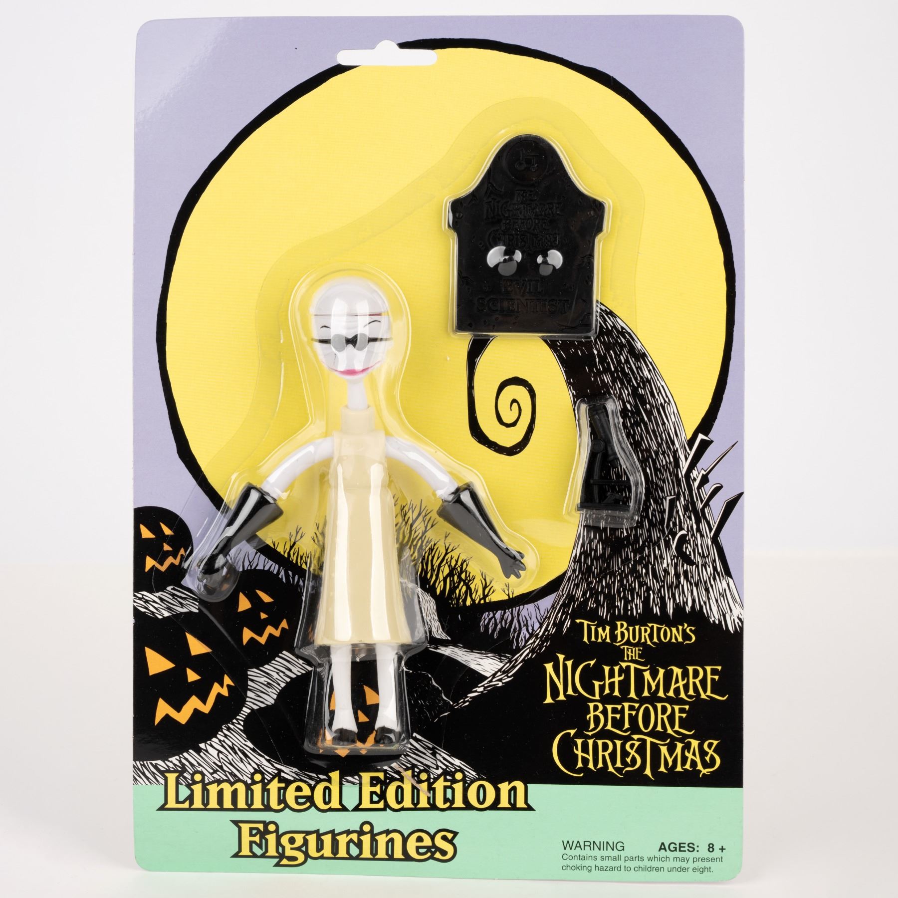 (NECA, 1990s-2000s) An action figure of Dr. Finkelstein from "Tim Burton's The Nightmare Before Christmas." The action figure was released in a limited edition of 1000 and comes with a gravestone and microscope accessory. The 4" x 1.5" and 5.75" tall figurine is in fine condition sealed within the original 7.5" x 1.5" x 11" packaging.