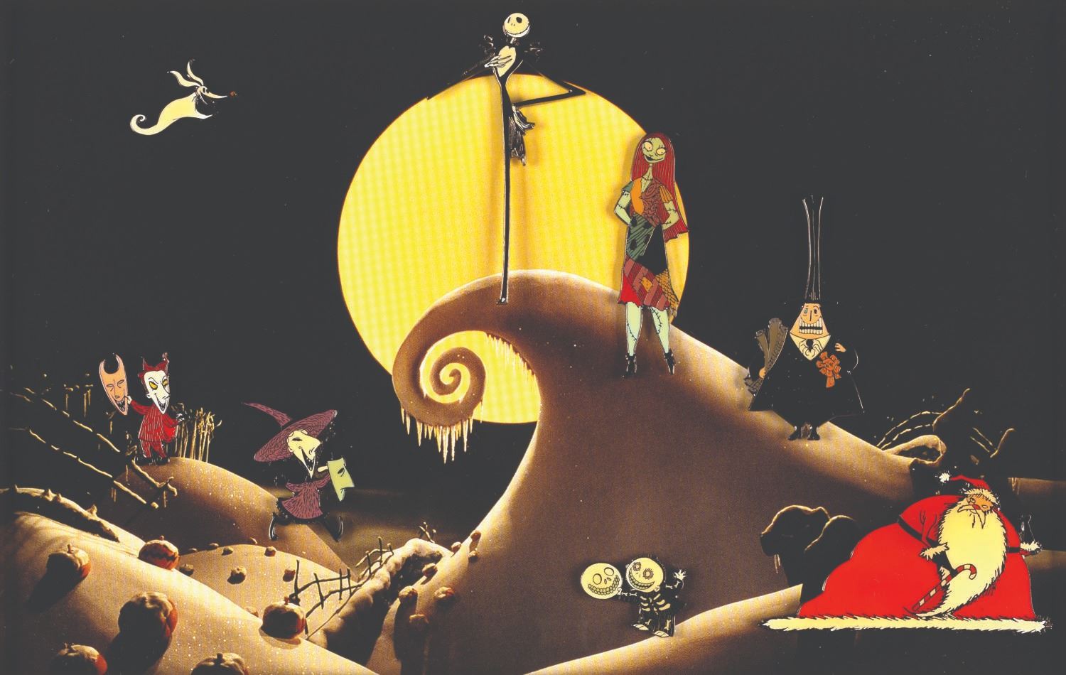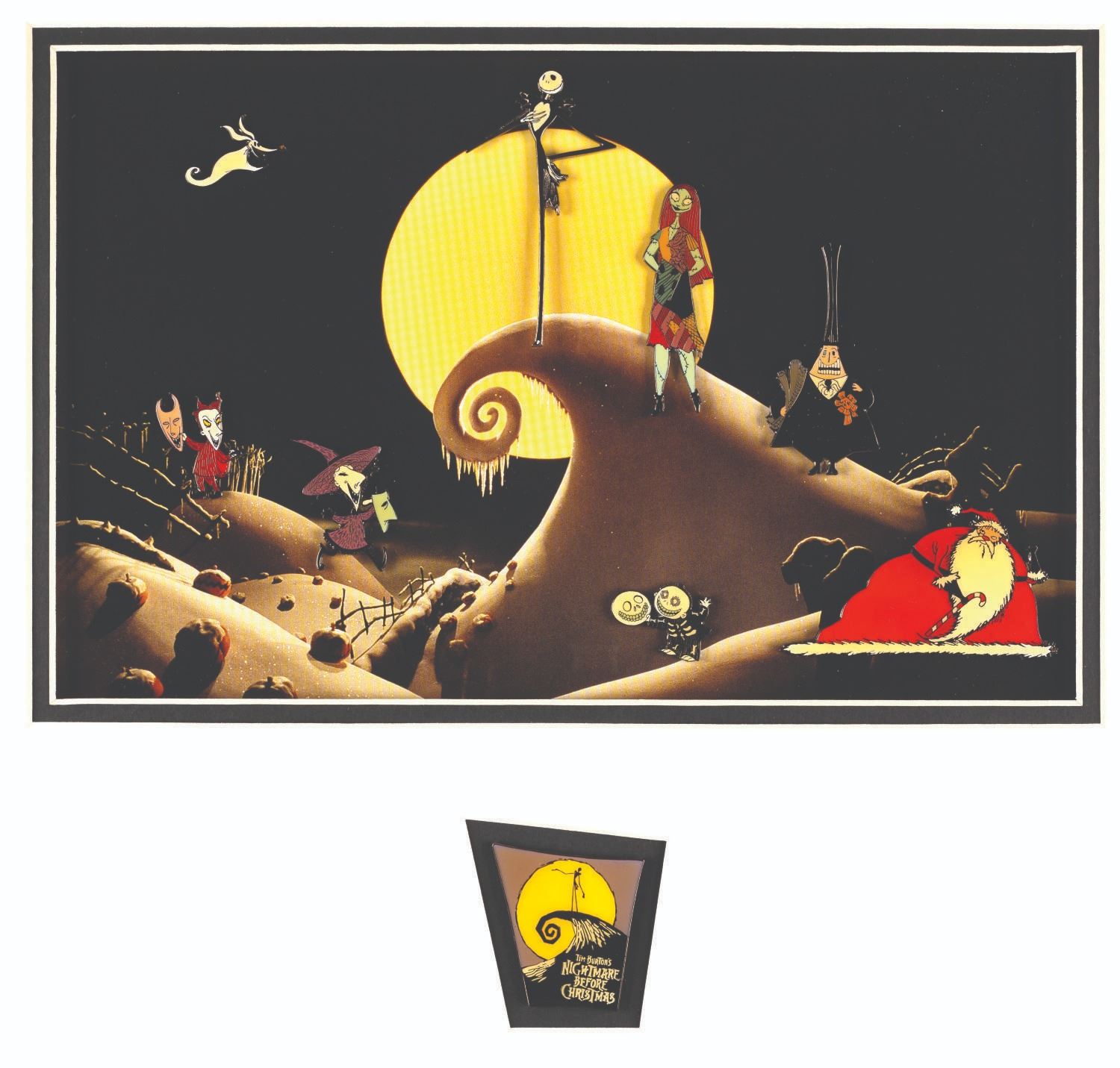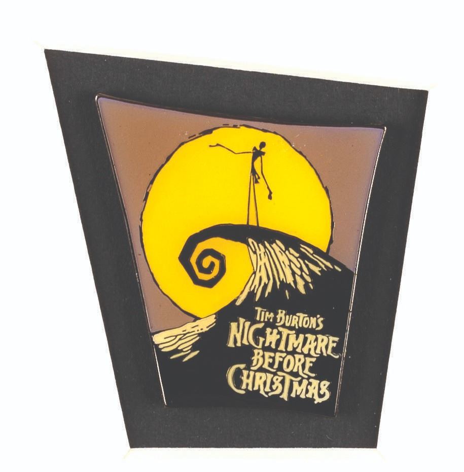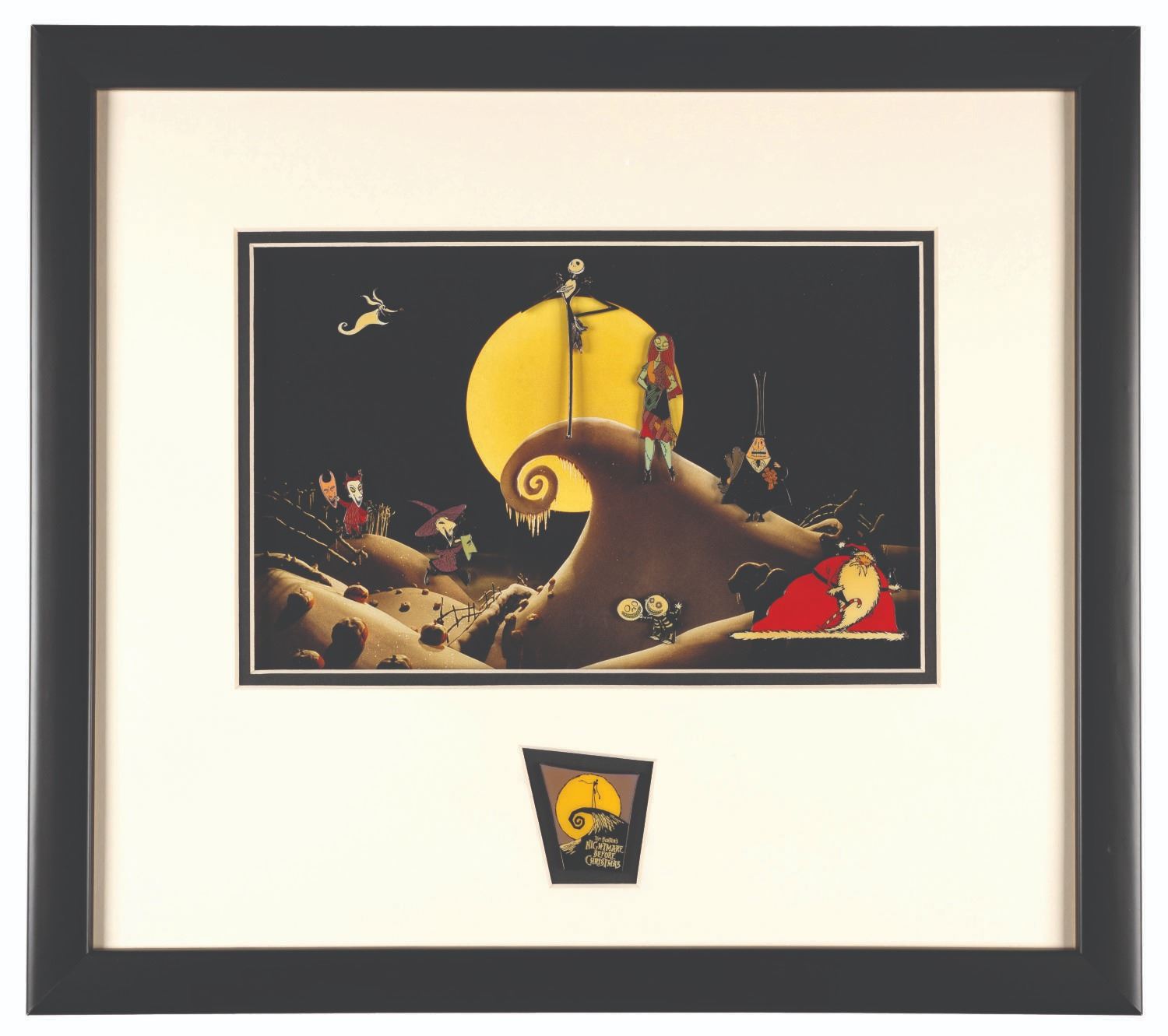(Disney, 2002) A framed “Tim Burton’s The Nightmare Before Christmas” set, created exclusively for The Walt Disney Gallery. Released in an unnumbered limited edition of 1450, the 9 pins depict Jack Skellington, Sally, Zero, Sandy Claws, Lock, Shock, Barrel, the Mayor, and the film’s logo. Ranging in size from 1” x 1” to 1.5” x 3” in a 7” x 11” opening of a 16.25” x 18.25” framed matte, the pin set displays in fine condition with light scratches to the glass.